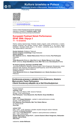 Kultura izraelska w Polsce Ambasada Izraela w Warszawie, Departament Kultury Polecamy: Centrum Sztuki Współczesnej Zamek Ujazdowski 00-467 Warszawa, ul. Jazdów 2 e-mail: [email protected] Biuro Prasowe: tel./faks 022 625 05 22 http://www.csw.art.pl Centrum Sztuki Współczesnej Zamek Ujazdowski zaprasza w czwartek 11 września o godz. 12.00 na konferencję prasową poświęconą festiwalowi Europejski Festiwal Sztuki Performance EPAF 2008. Edycja 3 11 - 13 września Ważną częścią tegorocznego Festiwalu będzie program sztuki performance z Izraela, którego kuratorem jest dyrektor Centrum Sztuki Współczesnej w Tel Avivie Sergio Edelsztein. Wystąpią młodzi artyści z Tel Awiwu i Jerozolimy: grupa Sala-Manca, Meir Tati, Shahar Marcus i Adva Drori. Kurator festiwalu: Waldemar Tatarczuk Kurator programu izraelskiego: Sergio Edelsztein Goście specjalni: Eric Andersen (Dania), Alastair MacLennan (Północna Irlandia), Paul Panhuysen (Holandia) oraz Yuras Barysevich (Białoruś), Adva Drori (Izrael), Shahar Marcus (Izrael), Grupa R.E.P. (Ukraina), Grupa Sala-Manca (Izrael), Meir Tati (Izrael), Ewa Zarzycka (Polska) W ramach programu otwartego openEPAF 2008: Anna Bas (Polska/Wlk. Brytania), Leonore Easton i Boris Hoogeveen (Szwajcaria), Jordan McKenzie (Wlk. Brytania), Noa Reshef (Izrael/Hiszpania), Sylvia Rimat (Niemcy/Wlk. Brytania), Aleksander Zaytsev (Białoruś) Wykłady/spotkania: Yuras Barysevich (Białoruś), Sergio Edelsztein(Izrael), Slavka Sverakova (Irlandia Północna) ------------------------------------------------------------------------------------------------------------------------------------------------------Konferencja prasowa z udziałem Erica Andersena, Alastaira MacLennana, Paula Panhuysena i Slavki Sverakovej odbędzie się w Sali Kino/Audytorium -------------------------------------------------------------------------------------------------------------------------------------------------------Program festiwalu: czwartek 11.09 godz. 18.00, Hol Główny CSW: otwarcie Festiwalu od godz. 18.00: performances Paul Panhuysen, Yuras Barysevich, Noa Reshef, Grupa Sala-Manca piątek 12.09 godz. 16.30: Sergio Edelsztein – wykład nt. sztuki performance w Izraelu od godz. 18.00: performances Eric Andersen, Ewa Zarzycka, Meir Tati, Shahar Marcus od 16.00 do 20.00 Anna Bas sobota 13.09 godz. 12.00 – 14.00, dyskusja z udziałem artystów biorących udział w festiwalu moderator: dr Slavka Sverakova godz. 16.30: Yuras Barysevich – wykład nt. sztuki performance na Białorusi godz. 18.00: performances Alastair MacLennan, Grupa R.E.P., Leonore Easton & Boris Hoogeveen, Aleksander Zaytsev, Sylvia Rimat, Adva Drori codziennie: Jordan McKenzie Kultura izraelska w Polsce Ambasada Izraela w Warszawie, Departament Kultury Polecamy: Gośćmi specjalnymi trzeciej warszawskiej edycji Europejskiego Festiwalu Sztuki Performance EPAF 2008 będą: szkocki artysta Alastair MacLennan (Północna Irlandia), profesor Ulster University, jeden z pionierów sztuki performance w Wielkiej Brytanii; Eric Andersen (Dania) artysta współtworzący od lat 60. międzynarodowy ruch artystyczny Fluxus oraz Paul Panhuysen (Holandia), jeden z głównych przedstawicieli europejskiej sceny sound art performance, założyciel Centrum Sztuki Het Apollohuis w Eindhoven. W festiwalu wezmą też udział: Ewa Zarzycka (Polska), Yuras Barysevich (Białoruś) i Grupa R.E.P.(Ukraina). W programie otwartym tegorocznego festiwalu – openEPAF - wystąpi siedmioro artystów, których performances zostały wybrane spośród 112 propozycji nadesłanych z całego świata. Ilość zgłoszeń świadczy o rosnącej z roku na rok popularności warszawskiego festiwalu. EPAF staje się ważną międzynarodową platformą konfrontacji postaw artystycznych i znaczącym etapem kariery artystycznej młodych twórców performance z Europy i świata. Artyści zakwalifikowani do openEPAF 2008 to: Anna Bas (Polska/ Wlk. Brytania), Leonore Easton i Boris Hoogeveen (Szwajcaria), Jordan McKenzie (Wlk. Brytania), Noa Reshef (Izrael/Hiszpania), Sylvia Rimat (Niemcy/Wlk.Brytania), Aleksander Zaytsev (Białoruś). Prezentacjom performances towarzyszyć będą projekcje wideo oraz wykłady. Ostatniego dnia festiwalu odbędzie się dyskusja z artystami, której moderatorem będzie dr Slavka Sverakova z Ulster University w Belfaście. Projekt realizowany przy pomocy finansowej Ministra Kultury i Dziedzictwa Narodowego w ramach programu Promocja Twórczości oraz Miasta Stołecznego Warszawa w ramach Europejskiego Roku Dialogu Międzykulturowego Współpraca: Centrum Sztuki Współczesnej, Tel Aviv Ośrodek Sztuki Performance, Lublin Partner: TNS OBOP Organizatorzy: Centrum Sztuki Współczesnej Zamek Ujazdowski Fundacja Sztuka i Współczesność Festiwal EPAF 2008 odbywa się w ramach Warszawskiego Sezonu Sztuki Performance 2008 Uprzejmie prosimy o zamieszczenie informacji Zapraszamy! Biuro Prasowe CSW Zofia Chojnacka, tel. kom. 0 510 160 637 tel./faks 0 22 625 05 22, 0 22 628 12 71-73 wew. 125 e-mail: [email protected]