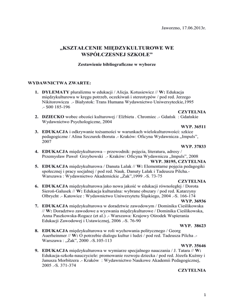 Jaworzno, 17.06.2013r. „KSZTAŁCENIE MIĘDZYKULTUROWE WE WSPÓŁCZESNEJ SZKOLE” Zestawienie bibliograficzne w wyborze WYDAWNICTWA ZWARTE: 1. DYLEMATY pluralizmu w edukacji / Alicja. Kotusiewicz // W: Edukacja międzykulturowa w kręgu potrzeb, oczekiwań i stereotypów / pod red. Jerzego Nikitorowicza .- Białystok: Trans Humana Wydawnictwo Uniwersyteckie,1995 .- S00 185-196 CZYTELNIA 2. DZIECKO wobec obcości kulturowej / Elżbieta . Chromiec .- Gdańsk : Gdańskie Wydawnictwo Psychologiczne, 2004 WYP. 36511 3. EDUKACJA i odkrywanie tożsamości w warunkach wielokulturowości: szkice pedagogiczne / Alina Szczurek-Boruta .- Kraków: Oficyna Wydawnicza „Impuls”, 2007 WYP. 37833 4. EDUKACJA międzykulturowa – przewodnik: pojęcia, literatura, adresy / Przemysław Paweł Grzybowski .- Kraków: Oficyna Wydawnicza „Impuls”, 2008 WYP. 38195, CZYTELNIA 5. EDUKACJA międzykulturowa / Danuta Lalak // W: Elementarne pojęcia pedagogiki społecznej i pracy socjalnej / pod red. Nauk. Danuty Lalak i Tadeusza Pilcha.Warszawa : Wydawnictwo Akademickie „Żak”,1999 .-S. 73-75 CZYTELNIA 6. EDUKACJA międzykulturowa jako nowa jakość w edukacji równoległej / Dorota Sieroń-Galusek // W: Edukacja kulturalna: wybrane obszary / pod red. Katarzyny Olbrycht .- Katowice : Wydawnictwo Uniwersytetu Śląskiego, 2004 .-S. 166-174 WYP. 36936 7. EDUKACJA międzykulturowa w doradztwie zawodowym / Dominika Cieślikowska // W: Doradztwo zawodowe a wyzwania międzykulturowe / Dominika Cieślikowska, Anna Paszkowska-Rogacz (et al.) .- Warszawa: Krajowy Ośrodek Wspierania Edukacji Zawodowej i Ustawicznej, 2006 .-S. 76-90 WYP. 38623 8. EDUKACJA międzykulturowa w roli wychowania politycznego / Georg Auerheinmer // W: O potrzebie dialogu kultur i ludzi / pod red. Tadeusza Pilcha .Warszawa : „Żak”, 2000 .-S.105-113 WYP. 35646 9. EDUKACJA międzykulturowa w wymiarze specjalnego nauczania / J. Tatara // W: Edukacja-szkoła-nauczyciele: promowanie rozwoju dziecka / pod red. Józefa Kuźmy i Janusza Morbitzera .- Kraków : Wydawnictwo Naukowe Akademii Pedagogicznej, 2005 .-S. 371-374 CZYTELNIA 1 10. EDUKACJA międzykulturowa: kreowanie tożsamości dziecka / Jerzy Nikitorowicz .Gdańsk: Gdańskie Wydawnictwo Psychologiczne, 2007 CZYTELNIA 11. EDUKACJA międzykulturowa: z doświadczeń Wielkiej Brytanii / Sheila Malone // W: Edukacja międzykulturowa : w kręgu potrzeb, oczekiwań i stereotypów / pod red. Jerzego Nikitorowicza .- Białystok: Trans Humana Wydawnictwo Uniwersyteckie, 1995 .-S 175-184 CZYTELNIA 12. EDUKACJA n pograniczu kulturowym / Urszula Wróblewska // W: Edukacja regionalna / red. Nauk. Anna Weronika Brzezińska, Aleksandra Hulewska, Justyna Słomska .- Warszawa : Wydawnictwo Naukowe PWN, 2006, .-S. 237-259 CZYTELNIA WYP. 37448 13. EDUKACJA regionalna i międzykulturowa / Jerzy Nikitorowicz .- Warszawa: Wydawnictwa i Profesjonalne. Grupa Kapitałowa WSiP, 2009 CZYTELNIA 14. EDUKACJA w krajach rozwiniętych / Mieczysław Jerzy Adamczyk, Andrzej Ładyżyński .- Stalowa Wola : Oficyna Fundacji Uniwersyteckiej, 1999 .-S. 311-323: Edukacja interkulturowa w szkołach wybranych krajów rozwiniętych CZYTELNIA 15. EDUKACJA wielokulturowa w kształceniu nauczycieli / Anna Klim-Klimaszewska, Jiri Prokop // W: Nauczyciel andragog w społeczeństwie wiedzy / pod red. Wojciecha Horynia i Jana Maciejewskiego .- Wrocław : Wydawnictwo Uniwersytetu Wrocławskiego, 2007 .-S. 216-223 WYP. 38699 16. KONTEKSTY lokalno-szkolne kreowania tożsamości kulturowej w warunkach wielokulturowości / Jerzy Nikitorowicz // W: Przemiany społeczno-cywilizacyjne i edukacja szkolna – problemy rozwoju indywidualnego i kształtowania się tożsamości / pod red. Tadeusza Lewowickiego, Aliny Szczurek-Boruty, Barbary Grabowskiej .Cieszyn-Warszawa-Kraków: Oficyna Wydawnicza „Impuls”, 2005 .-S. 187-201 WYP. 37847 17. KSZTAŁCENIE interkulturowe jako zadanie kształcenia nauczycieli w Europie / Manfred Bayer // W: Edukacja międzykulturowa: w kręgu potrzeb, oczekiwań i stereotypów / pod red. Jerzego Nikitorowicza .- Białystok: Trans Humana Wydawnictwo Uniwersyteckie,1995,.-S. 111-134 CZYTELNIA 18. MIĘDZYKULTUROWOŚĆ i wielokulturowość jako model edukacji otwartej na odmienność kulturową i interakcje / Jolanta Karbowniczek // W: Przestrzeń edukacyjna – dylematy, doświadczenia i oczekiwania społeczne: obszary pracy współczesnej szkoły / red. Krystyna Ferenz, Klaudia Błaszczyk, Iwona Rudek .Kraków : Oficyna Wydawnicza „Impuls”,2011 .-S. 27-34 CZYTELNIA 19. MIGRACJA, uchodźstwo, wielokulturowość: zderzenie kultur we współczesnym świecie / red. nauk. Danuta Lalak .- Warszawa : Wydawnictwo Akademickie „Żak” Teresa i Józef Śniecińscy, 2007 .-S. 307-334: Doświadczenia praktyczne w zakresie edukacji międzykulturowej WYP. 37900 20. MULTIKULTUROWY kontekst dydaktyki / Małgorzata Kowalik-Olubińska // W: Paradygmaty współczesnej dydaktyki / pod red. Lucyny Hurło, Doroty Klus-Stańskiej i Majki Łojko .- Kraków: Oficyna Wydawnicza „Impuls”, 2009.-S. 223-234 2 CZYTELNIA 21. NAUCZYCIEL i szkoła w aspekcie edukacji międzykulturowej / Jerzy Nikitorowicz // W: Myśl pedeutologiczna i działanie nauczyciela / red. Alicja Anna Kotusiewicz, Genowefa Koć-Seniuch, Jerzy Niemiec .- Warszawa-Białystok : Wydawnictwo „Żak”, Wydział Pedagogiki i Psychologii UWE Filia Białystok, 1997 .-S. 101-111 CZYTELNIA 22. NAUCZYCIEL i uczeń w systemie edukacji wielokulturowej / Barbara Januszko // W: Pedagogika małego dziecka: wybrane zagadnienia / pod red. Małgorzaty Karwowskiej-Struczyk, Ewy Słodownik-Rycaj .- Warszawa: Instytut Badań Edukacyjnych, 2007.- S. 81-98 WYP. 38114 23. NAUCZYCIEL wobec dialogu kultur / Genowefa Koć-Seniuch // W:Edukacja międzykulturowa: w kręgu potrzeb, oczekiwań i stereotypów / pod red. Jerzego Nikitorowicza .- Białystok: Trans Humana Wydawnictwo Uniwersyteckie,1995.-S. 197-210 CZYTELNIA 24. NAUCZYCIELE klas początkowych a kwestia mniejszości narodowych i