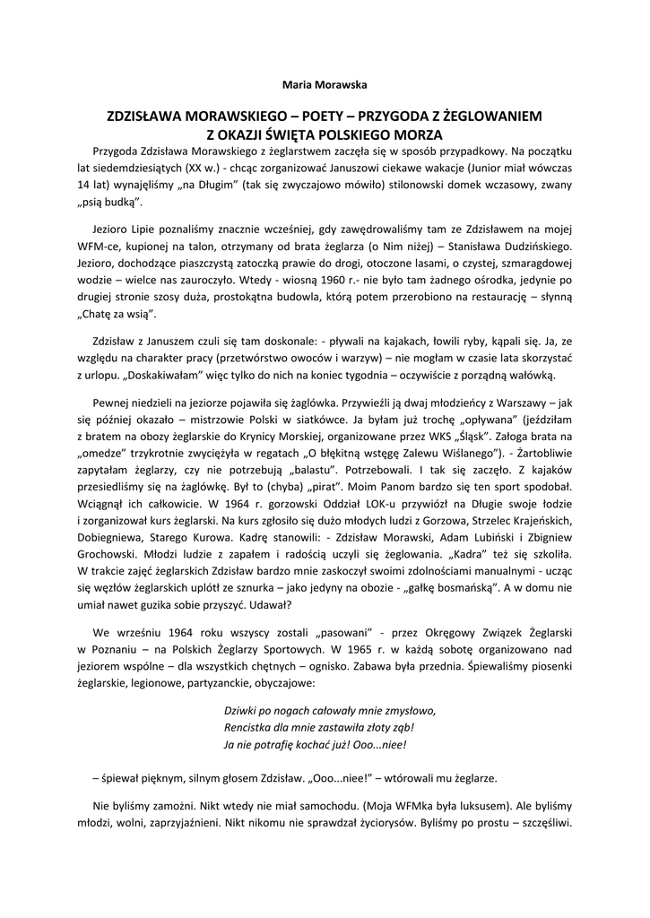 Maria Morawska ZDZISŁAWA MORAWSKIEGO – POETY – PRZYGODA Z ŻEGLOWANIEM Z OKAZJI ŚWIĘTA POLSKIEGO MORZA Przygoda Zdzisława Morawskiego z żeglarstwem zaczęła się w sposób przypadkowy. Na początku lat siedemdziesiątych (XX w.) - chcąc zorganizować Januszowi ciekawe wakacje (Junior miał wówczas 14 lat) wynajęliśmy „na Długim” (tak się zwyczajowo mówiło) stilonowski domek wczasowy, zwany „psią budką”. Jezioro Lipie poznaliśmy znacznie wcześniej, gdy zawędrowaliśmy tam ze Zdzisławem na mojej WFM-ce, kupionej na talon, otrzymany od brata żeglarza (o Nim niżej) – Stanisława Dudzińskiego. Jezioro, dochodzące piaszczystą zatoczką prawie do drogi, otoczone lasami, o czystej, szmaragdowej wodzie – wielce nas zauroczyło. Wtedy - wiosną 1960 r.- nie było tam żadnego ośrodka, jedynie po drugiej stronie szosy duża, prostokątna budowla, którą potem przerobiono na restaurację – słynną „Chatę za wsią”. Zdzisław z Januszem czuli się tam doskonale: - pływali na kajakach, łowili ryby, kąpali się. Ja, ze względu na charakter pracy (przetwórstwo owoców i warzyw) – nie mogłam w czasie lata skorzystać z urlopu. „Doskakiwałam” więc tylko do nich na koniec tygodnia – oczywiście z porządną wałówką. Pewnej niedzieli na jeziorze pojawiła się żaglówka. Przywieźli ją dwaj młodzieńcy z Warszawy – jak się później okazało – mistrzowie Polski w siatkówce. Ja byłam już trochę „opływana” (jeździłam z bratem na obozy żeglarskie do Krynicy Morskiej, organizowane przez WKS „Śląsk”. Załoga brata na „omedze” trzykrotnie zwyciężyła w regatach „O błękitną wstęgę Zalewu Wiślanego”). - Żartobliwie zapytałam żeglarzy, czy nie potrzebują „balastu”. Potrzebowali. I tak się zaczęło. Z kajaków przesiedliśmy się na żaglówkę. Był to (chyba) „pirat”. Moim Panom bardzo się ten sport spodobał. Wciągnął ich całkowicie. W 1964 r. gorzowski Oddział LOK-u przywiózł na Długie swoje łodzie i zorganizował kurs żeglarski. Na kurs zgłosiło się dużo młodych ludzi z Gorzowa, Strzelec Krajeńskich, Dobiegniewa, Starego Kurowa. Kadrę stanowili: - Zdzisław Morawski, Adam Lubiński i Zbigniew Grochowski. Młodzi ludzie z zapałem i radością uczyli się żeglowania. „Kadra” też się szkoliła. W trakcie zajęć żeglarskich Zdzisław bardzo mnie zaskoczył swoimi zdolnościami manualnymi - ucząc się węzłów żeglarskich uplótł ze sznurka – jako jedyny na obozie - „gałkę bosmańską”. A w domu nie umiał nawet guzika sobie przyszyć. Udawał? We wrześniu 1964 roku wszyscy zostali „pasowani” - przez Okręgowy Związek Żeglarski w Poznaniu – na Polskich Żeglarzy Sportowych. W 1965 r. w każdą sobotę organizowano nad jeziorem wspólne – dla wszystkich chętnych – ognisko. Zabawa była przednia. Śpiewaliśmy piosenki żeglarskie, legionowe, partyzanckie, obyczajowe: Dziwki po nogach całowały mnie zmysłowo, Rencistka dla mnie zastawiła złoty ząb! Ja nie potrafię kochać już! Ooo...niee! – śpiewał pięknym, silnym głosem Zdzisław. „Ooo...niee!” – wtórowali mu żeglarze. Nie byliśmy zamożni. Nikt wtedy nie miał samochodu. (Moja WFMka była luksusem). Ale byliśmy młodzi, wolni, zaprzyjaźnieni. Nikt nikomu nie sprawdzał życiorysów. Byliśmy po prostu – szczęśliwi. Co niedzielę – od rana – odbywały się regaty. Był to prawdziwy żeglarski trening. Zdzisław nie lubił pływać „ostro”. Najlepiej czuł się przy niewielkim wietrze. Żeglarze nazywali go „mistrzem” słabych wiatrów. (Związane to było z jego kondycją fizyczną. W latach pięćdziesiątych „zaliczył” kamieniołomy, gdzie stracił nogę). Janusza żeglarstwo oczarowało. Pewnego razu przychodzi do ojca i podekscytowany opowiada: „Tato! Tato!, a pan Adam powiedział do mnie „stary”. Tak!? I co ci kazał robić?” - „Kazał mi wybrać wodę z zęzy...”. Któregoś dnia na Długie „zjechali” literaci z Warszawy: - mądry, uroczy Jerzy Krzysztoń z żoną Haliną, zarozumiały Jarosław Abramow z piękną dziewczyną – Basią (żaliła się, że w czasie dłuższego pobytu na Moskwie nie napisał do niej nawet karteczki. „Ja piszę tylko za pieniądze” – odpowiedział krótko dramaturg i krytyk sztuki, którego nazwiska nie pamiętam – też z żoną. Warszawiacy nudzili się na wakacjach w Sławie i gdy w Rozgłośni Zielonogórskiej usłyszeli wywiad z Morawskim, który wychwalał pobyt nad jeziorem w Długim – spakowali się i przyjechali. Bardzo im się z nami podobało. Może mniej Abramowowi, któremu z pomostu spadł do wody cenny zegarek. A woda była tam głęboka. Poprosił więc żeglarzy o pomoc, obiecując im ćwiartkę wódki. Trzech chłopców nurkowało kilkanaście minut w zimnej wodzie. Niestety! Zegarka nie wyłowili. Naburmuszony Abramow odszedł z butelką wódki w kieszeni. Byłam oburzona. Na szczęście sytuację uratował Morawski, który rozgrzał zmarzniętych żeglarzy domową pieprzówką. Wielkim wyczynem żeglarzy było – w ramach kursu w 1965 roku – odbudowanie (oczyszczenie i pogłębienie cieków, wyciągnięcie gałęzi i powalonych drzew) – drogi wodnej z Długiego do Dobiegniewa. Jakież było zdumienie mieszkańców, gdy w niedzielę, 12 sierpnia 1965 roku – w samo południe – na wody Dobiegniewa wpłynęła pokojowa „armada” pod białymi żaglami... Rejs trwał trzy dni. Wypłynęliśmy z przystani w Długim. Płynęliśmy przez jezioro Lipie, przepływając udrożnionym przesmykiem, ze złożonymi masztami - „na pycha” - na urocze jeziorko, zwane „Szmaragdowym”, następnie krętą rzeczką wypłynęliśmy na „szerokie wody” - czyli jezioro Chomętowskie (dziś Osiek). Stamtąd, już pod pełnymi żaglami – prosto do Dobiegniewa. Z powrotem – oczywiście – w odwrotnej kolejności. Cudowna to była wyprawa! Nocowaliśmy w łajbach, pod r