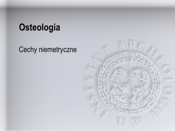 Osteologia Cechy niemetryczne Cechy niemetryczne Cechy niemetryczne, zwane także cechami nieciągłymi, dyskretnymi, epigenetycznymi są opisywane w antropologii od czasów Blumenbacha [1776]. Są to cechy niemierzalne, które są dziedziczne, a więc mogą posłużyć do badania powiązań genetycznych między osobnikami jednej populacji. Są wykorzystywane do badania odległości biologicznych pomiędzy populacjami [Laughlin, Jørgensen 1956, Lane, Sublett 1972 i in.]. Zaletą cech niemetrycznych jest fakt, że mogą one być opisywane nawet na materiale niekompletnym i źle zachowanym. Cechy niemetryczne są łatwe do zaobserwowania i nie wymagają specyficznych procedur i sprzętu niezbędnego do zebrania pomiarów. Cechy niemetryczne Najczęściej opisywane cechy przyjmują jedną z czterech form: • kostek wstawnych w szwach czaszki • nieprawidłowych rozrostowych skostnień (kostne ostrogi, mostki) • niekompletnego kostnienia prowadzącego do powstanie takich wad jak otwór nadbloczkowy foramen supratrochleare na kości ramieniowej • wariacje w liczbie i miejscu występowania otworów odżywczych Cechy niemetryczne Właściwe postępowanie w wypadku opisywania cech niemetrycznych: • badacz musi zapisywać występowanie, brak jak i przypadki kiedy obserwacja cechy nie mogła zostać przeprowadzona. Liczebność występowania cechy nie jest użyteczna, jeśli nie znamy liczby obserwacji. • cechy występujące bilateralnie muszą być notowane po obu stronach osobnika • choć część cech jest notowana jako obecna/nieobecna, niektóre wymagają porównania do skali. • należy przeprowadzać obserwacje także wśród osobników niedorosłych Cechy niemetryczne 1. szew czołowy sutura metopica umiejscowiony pośrodku k. czołowej, pokmiędzy bregmą a nasionem, zwykle zrasta się do 3-8 roku życia. Może być zachowany w całości, bądź też fragment w pobliżu nasionu Cechy niemetryczne 2. cechy nadoczodołowe wcięcie i/lub otwór nadoczodołowy na górnej krawędzi oczodołu Cechy niemetryczne 3. szew podoczodołowy rejestruje się jego obecność na powierzchni twarzy (mimo że może występować także w oczodole). Szew zachowany w całości biegnie od krawędzi oczodołu do otworu podoczodołowego Cechy niemetryczne 4. wielodzielne otwory podoczodołowe otwory znajdujące się na przedniej powierzchni k. szczękowej, pod dolną krawędzią oczodołu, powyżej dołu nadkłowego Cechy niemetryczne 5. liczne otwory jarzmowo-twarzowe otwory znajdujące się na przedniej powierzchni k. jarzmowej, należy zaobserwować wielkość i liczbę Cechy niemetryczne 6. otwór ciemieniowy otwór znajdujący się na kości ciemieniowej, blisko szwu strzałkowego, w pobliżu punktu obelion, często parzysty Cechy niemetryczne 7. kostki wstawne a. b. c. os epiptericum ossa intersuturarum suturae coronalis os bregmatica d. e. f. g. e. ossa intersuturarum suturae sagittalis os lambdae ossa intersuturarum suturae lambdoideae os asterion ossa intersuturarum suturae occipitomasteoideae Cechy niemetryczne 8. kość inkaska brak połączenia pierwotnego punktu kostnienia znajdującego się na części łuskowej k. potylicznej z resztą kości potylicznej, należy odróżnić od os lambdae częściowa dwudzielna trójdzielna Cechy niemetryczne 9. kanał kłykciowy otwór kanału występujący w dole kłykciowym, położony tylnio do kłykci potylicznych, otwór skierowany przednio-przyśrodkowo Cechy niemetryczne 10. wielodzielny kanał nerwu podjęzykowego kanał nerwu podjęzykowego leży nad kłykciem potylicznym, zwykle pod kątem prostym do głównej osi kłykcia. podział: całkowity, wewnątrz kanału otwór wielki częściowy, na powierzchni częściowy, wewnątrz kanału otwór wielki otwór wielki Cechy niemetryczne 11. kierunek skrętu zatoki strzałkowej górnej zwykle zatoka jest prawoskrętna rozwidlona lewoskrętna prawoskrętna Cechy niemetryczne 12. niepełny otwór owalny otwór owalny otwarty i połączony z otworem poszarpanym Cechy niemetryczne 13. niepełny otwór kolcowy otwór kolcowy otwarty i połączony z otworem poszarpanym Cechy niemetryczne 14. most skrzydłowo-kolcowy wyrostek kostny skrzydłowo-kolcowy jeśli rozrośnięty w most łączący blaszkę boczną k. klinowej i spina angularis niekompletny most wyrostek kompletny most Cechy niemetryczne 15. most skrzydłowo-skrzydłowy wyrostek kostny skrzydłowo-kolcowy jeśli rozrośnięty w most łączący blaszkę boczną k. klinowej i powierzchnię wewnętrzną skrzydła większego niekompletny most wyrostek kompletny most Cechy niemetryczne 16. rozstęp bębenkowy niepełne zrośnięcie się powierzchni bębenkowej k. skroniowej Cechy niemetryczne 17. torus auditivus/accusticus wał kostny wykształcony w kanale słuchowym zewnętrznym, stopień zamknięcia kanału powinien być notowany Cechy niemetryczne 18. otwór sutkowaty otwór znajdujący się z tyłu wyrostka sutkowatego, zwykle na kości skroniowej, czasami na potylicznej, bądź na szwie potyliczno-sutkowym, należy notować położenie i liczbę Cechy niemetryczne 19. otwór bródkowy notujemy liczbę, zwykle 2 Cechy niemetryczne 20.a torus mandibularis wał kostny, bądź szereg występów na językowej krawędzi żuchwy Cechy niemetryczne 20.b torus maxillaris wał kostny, bądź szereg występów na językowej krawędzi szczęki Cechy niemetryczne 20.c torus palatinus wał kostny, bądź szereg występów na językowej krawędzi żuchwy Cechy niemetryczne 21. mostek kostny zatoki żuchwowo-gnykowej mostek kostny nad zatoką żuchwowo-gnykową Cechy niemetryczne 22. mostek na S1 mostek kostny występujący na kręgu szczytowym, może być boczny, łączący boczną część wyrostka stawowego górnego z wyrostkiem poprzecznym, lub tylni, łączący tylnią część wyrostka stawowego górnego z blaszką łuku kręgu tylni częściowy kompletny boczny Cechy niemetryczne 23. wielodzielne otwory wyrostka poprzecznego na S7 wyrostki kostne mogą 