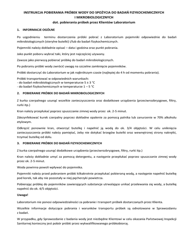 INSTRUKCJA POBIERANIA PRÓBEK WODY DO SPOŻYCIA DO BADAŃ FIZYKOCHEMICZNYCH I MIKROBIOLOGICZNYCH dot. pobierania próbek przez Klientów Laboratorium 1. INFORMACJE OGÓLNE Po uzgodnieniu terminu dostarczenia próbki pobrać z Laboratorium pojemniki odpowiednie do badań mikrobiologicznych (sterylne butelki) i/lub do badań fizykochemicznych. Pojemniki należy dokładnie opisać – data i godzina oraz punkt pobrania. Jako punkt poboru wybrać taki, który jest najczęściej używany. Zawsze jako pierwszą pobierać próbkę do badań mikrobiologicznych. Po pobraniu próbki wody zwrócić uwagę na szczelne zamknięcie pojemników. Próbki dostarczyć do Laboratorium w jak najkrótszym czasie (najlepiej do 4 h od momentu pobrania). Próbki transportować w odpowiednich warunkach: - do badań mikrobiologicznych w temperaturze 5 ± 3 °C - do badań fizykochemicznych w temperaturze 1 – 5 °C 2. POBIERANIE PRÓBEK DO BADAŃ MIKROBIOLOGICZNYCH Z kurka czerpalnego usunąć wszelkie zanieczyszczenia oraz dodatkowe urządzenia (przeciwrozbryzgowe, filtry, rurki itp.) Kran należy przepłukać poprzez spuszczanie zimnej wody przez ok. 2-5 minut. Zdezynfekować kurek czerpalny poprzez dokładne opalenie za pomocą palnika lub zanurzenie w 70% alkoholu etylowym. Odkręcić ponownie kran, otworzyć butelkę i napełnić ją wodą do ok. 3/4 objętości. W celu uniknięcia zanieczyszczenia próbki należy pamiętać, żeby nie dotykać brzegów butelki oraz wewnętrznej strony nakrętki, trzymać butelkę od dołu. 3. POBIERANIE PRÓBEK DO BADAŃ FIZYKOCHEMICZNYCH Z kurka czerpalnego usunąć dodatkowe urządzenia (przeciwrozbryzgowe, filtry, rurki itp.) Kran należy dokładnie umyć za pomocą detergentu, a następnie przepłukać poprzez spuszczanie zimnej wody przez ok. 2-5 minut. Woda powinna powoli wpływać do pojemnika. Pojemniki należy przed pobraniem próbki kilkakrotnie przepłukać pobieraną wodą, a następnie napełnić butelkę pod korek, tak aby nie pozostały w niej pęcherzyki powietrza. Pobierając próbkę do pojemników zawierających substancje utrwalające unikać przelewania się wody, a butelkę napełnić do ok. 4/5 objętości. Uwaga! Laboratorium nie ponosi odpowiedzialności za pobranie i transport próbek dostarczanych przez Klienta. Wszelkie informacje dotyczące pobrania i warunków transportu próbek są odnotowane w Sprawozdaniu z badań. W przypadku, gdy Sprawozdanie z badania wody jest niezbędne Klientowi w celu okazania Państwowej Inspekcji Sanitarnej konieczny jest pobór próbki przez wykwalifikowanego próbkobiorcę.