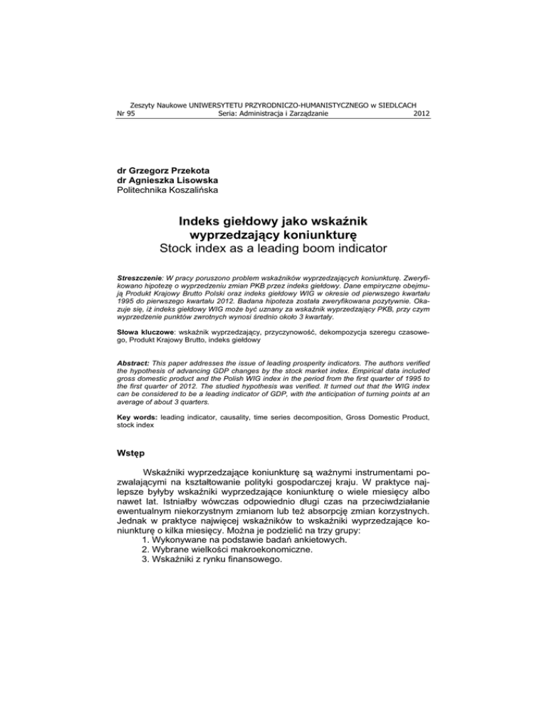 Zeszyty Naukowe UNIWERSYTETU PRZYRODNICZO-HUMANISTYCZNEGO w SIEDLCACH Nr 95 Seria: Administracja i Zarz dzanie 2012 dr Grzegorz Przekota dr Agnieszka Lisowska Politechnika Koszali ska Indeks gie dowy jako wska!nik wyprzedzaj"cy koniunktur# Stock index as a leading boom indicator Streszczenie: W pracy poruszono problem wska ników wyprzedzaj!cych koniunktur". Zweryfikowano hipotez" o wyprzedzeniu zmian PKB przez indeks gie#dowy. Dane empiryczne obejmuj! Produkt Krajowy Brutto Polski oraz indeks gie#dowy WIG w okresie od pierwszego kwarta#u 1995 do pierwszego kwarta#u 2012. Badana hipoteza zosta#a zweryfikowana pozytywnie. Okazuje si", i$ indeks gie#dowy WIG mo$e by% uznany za wska nik wyprzedzaj!cy PKB, przy czym wyprzedzenie punktów zwrotnych wynosi &rednio oko#o 3 kwarta#y. S owa kluczowe: wska!nik wyprzedzaj"cy, przyczynowo#$, dekompozycja szeregu czasowego, Produkt Krajowy Brutto, indeks gie%dowy Abstract: This paper addresses the issue of leading prosperity indicators. The authors verified the hypothesis of advancing GDP changes by the stock market index. Empirical data included gross domestic product and the Polish WIG index in the period from the first quarter of 1995 to the first quarter of 2012. The studied hypothesis was verified. It turned out that the WIG index can be considered to be a leading indicator of GDP, with the anticipation of turning points at an average of about 3 quarters. Key words: leading indicator, causality, time series decomposition, Gross Domestic Product, stock index Wst#p Wska!niki wyprzedzaj"ce koniunktur& s" wa'nymi instrumentami pozwalaj"cymi na kszta%towanie polityki gospodarczej kraju. W praktyce najlepsze by%yby wska!niki wyprzedzaj"ce koniunktur& o wiele miesi&cy albo nawet lat. Istnia%by wówczas odpowiednio d%ugi czas na przeciwdzia%anie ewentualnym niekorzystnym zmianom lub te' absorpcj& zmian korzystnych. Jednak w praktyce najwi&cej wska!ników to wska!niki wyprzedzaj"ce koniunktur& o kilka miesi&cy. Mo'na je podzieli$ na trzy grupy: 1. Wykonywane na podstawie bada ankietowych. 2. Wybrane wielko#ci makroekonomiczne. 3. Wska!niki z rynku finansowego. 322 G. Przekota, A. Lisowska Wska!niki wykonywane na podstawie bada ankietowych s" najbardziej popularne. Badania przeprowadzane s" na wybranych grupach, najcz&#ciej konsumentach lub przedsi&biorcach. Reprezentantom tych grup zadaje si& pytania dotycz"ce ich oczekiwa w przysz%o#ci. Skuteczno#$ tych wska!ników jest tym wi&ksza im lepiej badana próba b&dzie odzwierciedla$ populacj&. W drugiej grupie wska!ników znajduj" si& pewne wielko#ci, które w sposób istotny wp%ywaj" na decyzje konsumentów i przedsi&biorców, a przez to w konsekwecji na stan koniunktury gospodarczej. W zwi"zku z tym, i' musi up%yn"$ pewien czas, zamin rynek zaakceptuje now" warto#$ takiej wielko#ci, mo'na traktowa$ je jako wyprzedzaj"ce. W tej grupie znajduj" si& przede wszystkim wielko#ci wp%ywaj"ce na poziom popytu konsumpcyjnego i inwestycyjnego, a wi&c stopa procentowa, wielko#$ poda'y pieni"dza, stopa podatkowa itp. Trzecia grupa wska!ników to wska!niki z rynku finansowego, a w#ród nich w szczególno#ci dwa uznaje si& jako dobre prognostyki nadchodz"cej koniunktury, s" to: ró'nice pomi&dzy krótkoi d%ugoterminowymi stopami procentowymi oraz indeksy gie%dowe. Cel pracy i zakres danych Celem prowadzonych bada jest okre#lenie powi"zania indeksu gie%dowego WIG z poziomem PKB. Wysuni&to przypuszczenie, i' indeks gie%dowy WIG mo'e by$ traktowany jako wska!nik wyprzedzaj"cy dla poziomu PKB. Szczegó%owe badania maj" wskaza$, jaki jest czas wyprzedzenia punktów zwrotnych koniunktury PKB przez punkty zwrotne koniunktury gie%dowej mierzonej indeksem gie%dowych WIG. Zakres danych obejmuje szeregi czasowe danych kwartalnych PKB i WIG za okres pierwszy kwarta% 1995 – pierwszy kwarta% 2012. Wykresy tych szeregów znajduj" si& na rysunku 1. 70 000 WIG (pkt) 500 000 PKB (mln z ) 450 000 60 000 400 000 50 000 350 000 40 000 300 000 250 000 30 000 200 000 150 000 20 000 WIG 10 000 2012 50 000 2011 2010 2009 2008 2007 2006 2005 2004 2003 2002 2001 2000 1999 1998 1997 1996 1995 0 100 000 PKB 0 Rysunek 1. Szeregi czasowe PKB i WIG w latach 1995-2012, dane kwartalne (ród%o: G%ówny Urz"d Statystyczny, Gie%da Papierów Warto#ciowych w Warszawie. Seria: Administracja i Zarz dzanie (22)2012 ZN nr 95 Indeks gie!dowy jako wska"nik wyprzedzaj cy koniunktur# 323 Przebiegi szeregów czasowych PKB i WIG ró'ni" si& znacznie. W przypadku tego pierwszego mamy do czynienia z systematycznym wzrostem warto#ci z wyra!nymi odchyleniami sezonowymi. Natomiast warto#ci indeksu gie%dowego WIG podlegaj" znacznie wi&kszym wahaniom, a ponadto wyodr&bni$ mo'na kilka faz, charakteryzuj"cych si& trendem wzrostowym, spadkowym lub bocznym o ró'nej d%ugo#ci. Potwierdzeniem wi&kszej zmienno#ci warto#ci szeregu czasowego WIG od zmienno#ci warto#ci szeregu czasowego PKB s" wyznaczone wspó%czynniki zmienno#ci, które wynios%y odpowiednio 55,7% i 38,7%. Uwagi dotycz"ce modelowania zale$no%ci Najprostsze metody analizy powi"za pomi&dzy warto#ciami szeregów czasowych bazuj" na obliczaniu wspó%czynników korelacji. Technicznie s" one najprostsze, ale z uwagi na pewne cechy szeregów czasowych (niestacjonarno#$, heteroscedastyczno#$) mog" dawa$ ma%o wiarygodne wyniki. W zwi"zku z tym w pracy skorzystano z koncepcji przyczynowo#ci. Przyj&to tutaj definicj& przyczynowo#ci Wienera-Grangera: „x jest przyczyn" (w sensie Grangera) y, co zapisujemy jako x y, je#li bie'"ce warto#ci y mo'na wyprognozowa$ z wi&ksz" dok%adno#ci" przez przesz%e warto#ci x, ni' w inny sposób, przy zasadzie caeteris paribus”1. Przyczynowo#$ sprowadza si& do odpowiedzi na pytanie, czy x mo'e zosta$ wyeliminowane z tej cz&#ci modelu, która opisuje y.2 Hipoteza zerowa dla modelu: # x t % a 01 $ a1.11 x t &1 $ ... $ a1.1k x t & k $ a1.21 y t &1 $ ... $ a1.2 k y t & k $ e1t (1) " ! y t % a 02 $ a 2.11 x t &1 $ ... $ a 2.1k x t & k $ a 2.21 y t &1 $ ... $ a 2.2 k y t & k $ e 2t gdzie k oznacza lic