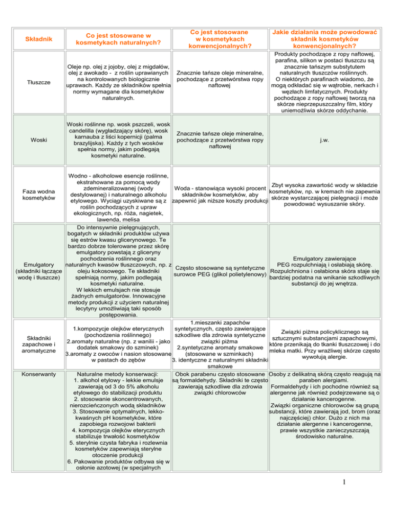 Składnik Tłuszcze Woski Co jest stosowane w kosmetykach naturalnych? Co jest stosowane w kosmetykach konwencjonalnych? Oleje np. olej z jojoby, olej z migdałów, olej z awokado - z roślin uprawianych Znacznie tańsze oleje mineralne, na kontrolowanych biologicznie pochodzące z przetwórstwa ropy uprawach. Każdy ze składników spełnia naftowej normy wymagane dla kosmetyków naturalnych. Woski roślinne np. wosk pszczeli, wosk candelilla (wygładzający skórę), wosk karnauba z liści kopernicji (palma brazylijska). Każdy z tych wosków spełnia normy, jakim podlegają kosmetyki naturalne. Znacznie tańsze oleje mineralne, pochodzące z przetwórstwa ropy naftowej Jakie działania może powodować składnik kosmetyków konwencjonalnych? Produkty pochodzące z ropy naftowej, parafina, silikon w postaci tłuszczu są znacznie tańszym substytutem naturalnych tłuszczów roślinnych. O niektórych parafinach wiadomo, że mogą odkładać się w wątrobie, nerkach i węzłach limfatycznych. Produkty pochodzące z ropy naftowej tworzą na skórze nieprzepuszczalny film, który uniemożliwia skórze oddychanie. j.w. Wodno - alkoholowe esencje roślinne, ekstrahowane za pomocą wody Zbyt wysoka zawartość wody w składzie zdemineralizowanej (wody Woda - stanowiąca wysoki procent Faza wodna kosmetyków, np. w kremach nie zapewnia destylowanej) i naturalnego alkoholu składników kosmetyków, aby kosmetyków skórze wystarczającej pielęgnacji i może etylowego. Wyciągi uzyskiwane są z zapewnić jak niższe koszty produkcji powodować wysuszanie skóry. roślin pochodzących z upraw ekologicznych, np. róża, nagietek, lawenda, melisa Do intensywnie pielęgnujących, bogatych w składniki produktów używa się estrów kwasu glicerynowego. Te bardzo dobrze tolerowane przez skórę emulgatory powstają z gliceryny pochodzenia roślinnego oraz Emulgatory zawierające Emulgatory naturalnych kwasów tłuszczowych, np. z PEG rozpulchniają i osłabiają skórę. Często stosowane są syntetyczne (składniki łączące oleju kokosowego. Te składniki Rozpulchniona i osłabiona skóra staje się surowce PEG (glikol polietylenowy) wodę i tłuszcze) spełniają normy, jakim podlegają bardziej podatna na wnikanie szkodliwych kosmetyki naturalne. substancji do jej wnętrza. W lekkich emulsjach nie stosuje żadnych emulgatorów. Innowacyjne metody produkcji z użyciem naturalnej lecytyny umożliwiają taki sposób postępowania. 1.mieszanki zapachów 1.kompozycje olejków eterycznych syntetycznych, często zawierające Związki piżma policyklicznego są (pochodzenia roślinnego) szkodliwe dla zdrowia syntetyczne Składniki sztucznymi substancjami zapachowymi, 2.aromaty naturalne (np. z wanilii - jako związki piżma zapachowe i które przenikają do tkanki tłuszczowej i do dodatek smakowy do szminek) 2.syntetyczne aromaty smakowe aromatyczne mleka matki. Przy wrażliwej skórze często 3.aromaty z owoców i nasion stosowane (stosowane w szminkach) wywołują alergie. w pastach do zębów 3. identyczne z naturalnymi składniki smakowe Konserwanty Naturalne metody konserwacji: Obok parabenu często stosowane Osoby z delikatną skórą często reagują na 1. alkohol etylowy - lekkie emulsje są formaldehydy. Składniki te często paraben alergiami. zawierają od 3 do 5% alkoholu zawierają szkodliwe dla zdrowia Formaldehydy i ich pochodne również są etylowego do stabilizacji produktu związki chlorowców alergenne jak również podejrzewane są o 2. stosowanie skoncentrowanych, działanie kancerogenne. nierozcieńczonych wodą składników Związki organiczne chlorowców są grupą 3. Stosowanie optymalnych, lekkosubstancji, które zawierają jod, brom (oraz kwaśnych pH kosmetyków, które najczęściej) chlor. Dużo z nich ma zapobiega rozwojowi bakterii działanie alergenne i kancerogenne, 4. kompozycja olejków eterycznych prawie wszystkie zanieczyszczają stabilizuje trwałość kosmetyków środowisko naturalne. 5. sterylnie czysta fabryka i rozlewnia kosmetyków zapewniają sterylne otoczenie produkcji 6. Pakowanie produktów odbywa się w osłonie azotowej (w specjalnych 1 komorach azotowych), co zabezpiecza kosmetyki przed przenikaniem do nich tlenu. W ten sposób odbiera się grzybom i drożdżom powietrze, uniemożliwiając im oddychanie i wzrost 7. stosownie substancji naturalnie konserwujących , np. sól morska w paście do zębów lub wyciągi z ziół zapewnia dodatkową ochronę przed mikroorganizmami. 8. Witamina E często stosowana jako naturalny antyutleniacz. Kosmetyki naturalne nie zawierają żadnych agresywnych syntetycznych substancji myjących i spełniają a nawet przekraczają ostre kryteria zdefiniowane dla kosmetyków naturalnych. Wykorzystywane w Substancje myjące kosmetykach naturalnych substancje (tensydy) myjące to środki powierzchniowoczynne na bazie oleju kokosowego i cukru Substancje myjące zapewniają optymalną pielęgnację i spełniają surowe wymagania stawiane kosmetykom naturalnym 1. pigmenty pochodzące z minerałów (np. mika) 2. tlenki żelaza Barwniki 3. karmin 4. wyciągi roślinne (z zielonych liści, z czerwonych buraków) 1. wyciągi z roślin pochodzących z upraw ekologicznych (np. nagietek, oczar wirginijski) 2. innowacyjnie działające składniki Substancje aktywne naturalne: (np. ceramidy, liposomy, kwas hialuronowy) 3. naturalne czynniki nawilżające (np. gliceryna roślinna, kwas mlekowy) Filtr przeciwsłoneczny Opakowanie Wyłącznie naturalne i mineralne pigmenty chroniące przed światłem (tworzą na powierzchni skóry rodzaj bariery, „lustra” odbijającego światło słoneczne) Nieszkodliwe dla środowiska, z tworzyw sztucznych, aluminium i kartonu ulegającego biodegradacji Oprócz agresywnego, silnie Wrażliwa skóra często reaguje na związki alkaicznego detergentu o nazwie powierzchniowo czynne (które stanowią siarczan laurylowo-sodowy, bazę kosmetyków) alergiami. Tensydy konwencjonalne tensydy zawierają stos