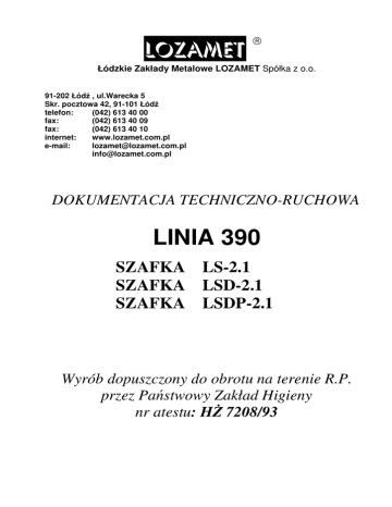 Łódzkie Zakłady Metalowe LOZAMET Spółka z o.o. 91-202 Łód , ul.Warecka 5 Skr. pocztowa 42, 91-101 Łód telefon: (042) 613 40 00 fax: (042) 613 40 09 fax: (042) 613 40 10 internet: www.lozamet.com.pl e-mail: [email protected] [email protected] DOKUMENTACJA TECHNICZNO-RUCHOWA LINIA 390 SZAFKA SZAFKA SZAFKA LS-2.1 LSD-2.1 LSDP-2.1 Wyrób dopuszczony do obrotu na terenie R.P. przez Pa stwowy Zakład Higieny nr atestu: H 7208/93 SPIS TRE CI strona 1. ZASTOSOWANIE I CHARAKTERYSTYKA. 3 1.1. Zastosowanie szafki. 3 1.2. Dane techniczne. 3 2. INSTALOWANIE. 3 2.1. Ustawienie. 3 2.2. Podł czenie do instalacji elektrycznej szafki typu LSDP. 4 3. OBSŁUGA. 4 3.1. Przygotowanie szafki do pracy. 4 3.2. Czynno ci po zako czeniu pracy 4 3.3. Bezpiecze stwo i higiena pracy. 4 4. KONSERWACJA I NAPRAWY. 5 4.1. Konserwacja. 5 4.2. Naprawy i remonty. 5 5. WYKAZ CZ CI ZAMIENNYCH. 5 6. RYSUNEK SZAFKI. 6 7. SCHEMAT ELEKTRYCZNY SZAFKI. 8 2 1. ZASTOSOWANIE I CHARAKTERYSTYKA. 1.1. Zastosowanie szafki. Szafka podgrzewana elektryczna typu LSDP, przeznaczona jest do podgrzewania naczy lub podtrzymywania temperatury uprzednio przygotowanych potraw przechowywanych w naczyniach. Szafki typu LSD i LS przeznaczone s do przechowywania naczy i pojemników. Wszystkie typy szafek przeznaczone s do ustawiania na nich urz dze wchodz cych w skład linii L390 produkcji ŁZM „LOZAMET”, a tak e innego sprz tu kuchennego, naczy i pojemników. 1.2. Dane techniczne. PARAMETRY Gł boko zamkni tej Gł boko otwartej Szeroko Wysoko Zakres regulacji wysoko ci Moc znamionowa Napi cie Rodzaj pr du Temperatura max. wn trza szafki mm mm mm mm mm W V Hz °C LSDP-2.1 363 595 546 726,5 25 500 ~230 50 75 LSD-2.1 363 595 546 726,5 25 ----- LS-2.1 363 -546 726,5 25 ----- UWAGA ! Szafka typu LSDP to szafka z drzwiami, ogrzewana Szafka typu LSD to szafka z drzwiami bez ogrzewania Szafka typu LS to szafka bez drzwi i bez ogrzewania ( posiada przygotowane przył cza do zamocowania drzwi) 2. INSTALOWANIE. 2.1. Ustawienie. Szafk nale y ustawi w miejscu umo liwiaj cym jej ergonomiczne u ytkowanie i gwarantuj cym stabilne podło e w czasie pracy. Szafka typu LSDP jest przystosowana do pracy ci głej. W czasie długotrwałego u ytkowania jej obudowa i drzwi nagrzewaj si do temperatury ok. 95°C. Szczególnie dotyczy to cz ci szafki w strefie grzałki. W zwi zku z powy szym NIE NALE Y ustawia szafki na łatwopalnym podło u (np. słomianki, wykładziny podłogowe, płytki PCW, itp.) oraz w pobli u łatwopalnych materiałów. Szafka typu LSDP powinna by oddalona o 250 mm od cian pomieszczenia, a miejsce w którym została ustawiona powinno mie instalacj elektryczn jednofazow 230V ~ 50Hz. Instalacja powinna mie skuteczn ochron p.pora eniow tj. zerowanie lub uziemienie. 3 2.2. a) b) c) d) Podł czenie do instalacji elektrycznej szafki typu LSDP. Sprawdzi zgodno parametrów instalacji elektrycznej z danymi znamionowymi szafki Sprawdzi stan osprz tu elektrycznego szafki, Dokona pomiaru ochrony p.pora eniowej (zerowanie lub uziemienie), Wykona przył czenie szafki do sieci elektrycznej. Przył czenie wyrównawcze Urz dzenie wyposa one jest w zacisk do przył czenia zewn trznych oznaczone symbolem wykonania i skuteczno ył wyrównawczych . Przed podł czeniem urz dzenia nale y sprawdzi prawidłowo działania poł cze wyrównawczych zgodnie z PN-IEC-60364-4-41. URUCHOMIENIE SZAFKI MO E NAST PI PO POTWIERDZENIU SKUTECZNO CI OCHRONY P.PORA ENIOWEJ WYNIKAMI POMIARÓW 3. OBSŁUGA. 3.1. Przygotowanie szafki do pracy. a) Urz dzenie odkonserwowa , ustawi w miejscu pracy i wypoziomowa . b) Szafk wymy ciepł wod dodaj c płyn do mycia naczy , odczeka do jej wyschni cia, Pozostałe punkty dotycz tylko szafki typu LSDP. c) Podł czy urz dzenie do sieci elektrycznej d) Przyciskiem klawiszowym zał czy zasilanie szafki e) Po nagrzaniu si wn trza szafki, mo na do niej wło y naczynia lub pojemniki z potrawami. 3.2. Czynno ci po zako czeniu pracy Punkty a i b dotycz tylko szafek typu LSDP. a) Przyciskiem klawiszowym wył czy szafk . b) Odł czy urz dzenie od sieci elektrycznej. c) Cało umy w ciepłej wodzie i wysuszy . 3.3. Bezpiecze stwo i higiena pracy. Nieumiej tna obsługa szafki, niestosowanie si do ww. zalece oraz nieprzestrzeganie przepisów BHP, mo e spowodowa niebezpiecze stwo pora enia pr dem elektrycznym lub poparzenie. Przy eksploatacji szafki typu LSDP, nale y przestrzega nast puj ce zasady post powania: a) Przed pierwszym uruchomieniem, oraz co najmniej raz w roku sprawdzi skuteczno ochrony przed pora eniem pr dem elektrycznym. b) Osoby nieupowa nione nie powinny wykonywa napraw i regulacji szafki. c) W czasie napraw, konserwacji i mycia – bezwzgl dnie odł czy szafk od sieci elektrycznej. d) W przypadku stwierdzenia uszkodze instalacji lub osprz tu elektrycznego, nale y bezwzgl dnie wył czy szafk z sieci elektrycznej. e) W czasie długotrwałej pracy obudowa szafki typu LSDP w strefie grzałek nagrzewa si do wysokiej temperatury. W zwi zku z tym nie nale y dotyka obudowy szafki w dolnej cz ci jak równie ustawia na łatwopalnym podło u (np. słomianki, wykładziny podłogowe, płytki PCW, itp.) oraz w pobli u łatwopalnych materiałów. Szafka powinna by oddalona o 250 mm od cian pomieszczenia. ZABRANIA SI MYCIA URZ DZENIA STRUMIENIEM WODY. W czasie mycia, czyszczenia, a tak e podczas bie cej eksploatacji NIE WOLNO dopu ci do zalania wod lub innymi płynami instalacji elektrycznej szafki. 4 4. KONSERWACJA I NAPRAWY. 4.1. Konserwacja. Codziennie po zako czeniu pracy, szafk nale y oczy ci , a w razie potrzeby umy . Okresowo czy ci komor grzałki. 4.2. Naprawy i remonty. Producent szafek Łódzkie Zakłady Metalowe „LOZAMET” , poprzez swoj słu b serwisow zapewnia naprawy u odbiorcy, oraz przeprowadza naprawy w siedzibie producenta. Producent nie ponosi odpowiedzialno ci za niewła ciwe lub niezgodne z zaleceniami podanymi w niniejszej dokumentacji u ytkowanie wyrobu. Gwarancja nie obejmuje uszkodze powstałych w wyniku niewła ciwego u ytkowania, br