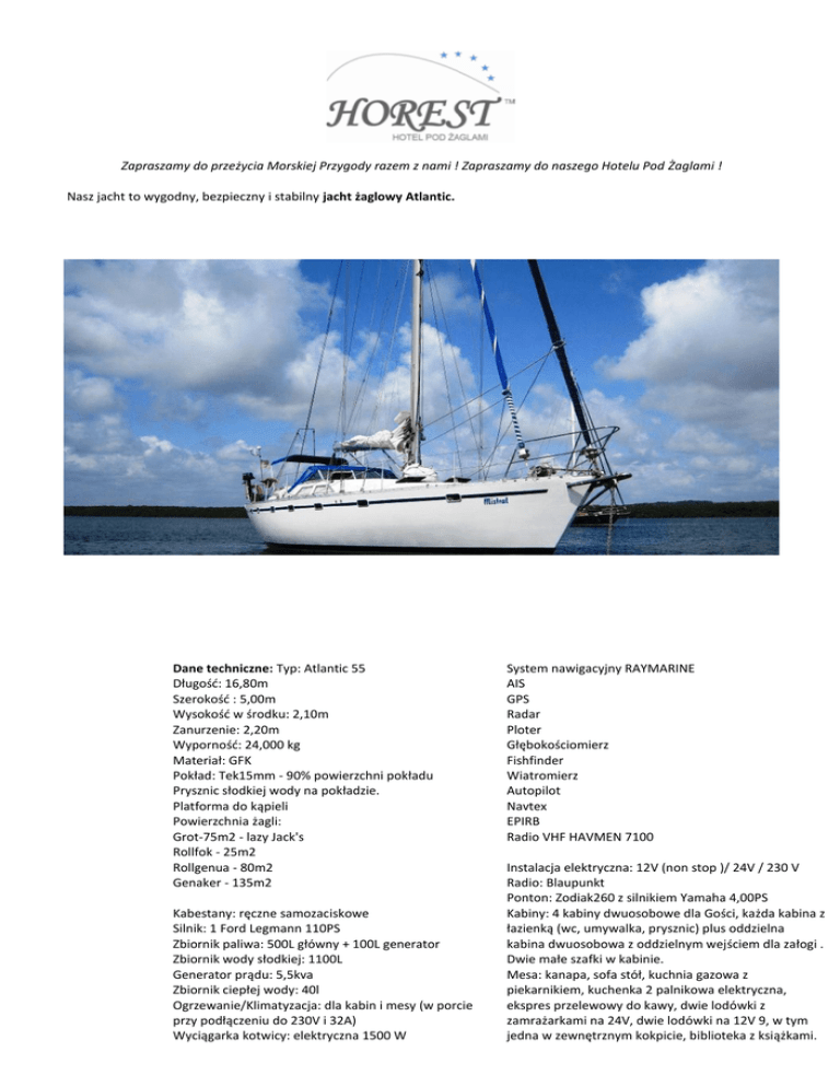 Zapraszamy do przeżycia Morskiej Przygody razem z nami ! Zapraszamy do naszego Hotelu Pod Żaglami ! Nasz jacht to wygodny, bezpieczny i stabilny jacht żaglowy Atlantic. Dane techniczne: Typ: Atlantic 55 Długość: 16,80m Szerokość : 5,00m Wysokość w środku: 2,10m Zanurzenie: 2,20m Wyporność: 24,000 kg Materiał: GFK Pokład: Tek15mm - 90% powierzchni pokładu Prysznic słodkiej wody na pokładzie. Platforma do kąpieli Powierzchnia żagli: Grot-75m2 - lazy Jack's Rollfok - 25m2 Rollgenua - 80m2 Genaker - 135m2 Kabestany: ręczne samozaciskowe Silnik: 1 Ford Legmann 110PS Zbiornik paliwa: 500L główny + 100L generator Zbiornik wody słodkiej: 1100L Generator prądu: 5,5kva Zbiornik ciepłej wody: 40l Ogrzewanie/Klimatyzacja: dla kabin i mesy (w porcie przy podłączeniu do 230V i 32A) Wyciągarka kotwicy: elektryczna 1500 W System nawigacyjny RAYMARINE AIS GPS Radar Ploter Głębokościomierz Fishfinder Wiatromierz Autopilot Navtex EPIRB Radio VHF HAVMEN 7100 Instalacja elektryczna: 12V (non stop )/ 24V / 230 V Radio: Blaupunkt Ponton: Zodiak260 z silnikiem Yamaha 4,00PS Kabiny: 4 kabiny dwuosobowe dla Gości, każda kabina z łazienką (wc, umywalka, prysznic) plus oddzielna kabina dwuosobowa z oddzielnym wejściem dla załogi . Dwie małe szafki w kabinie. Mesa: kanapa, sofa stół, kuchnia gazowa z piekarnikiem, kuchenka 2 palnikowa elektryczna, ekspres przelewowy do kawy, dwie lodówki z zamrażarkami na 24V, dwie lodówki na 12V 9, w tym jedna w zewnętrznym kokpicie, biblioteka z książkami. Hotel Pod Żaglami www.hotelpodzaglami.pl [email protected] www.facebook.com/hotelpodzaglami +48 609 444 732 +48 796 746 303