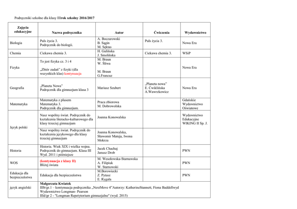Podręczniki szkolne dla klasy IIIrok szkolny 2016/2017 Zajęcia edukacyjne Biologia Puls życia 3. Podręcznik do biologii. Chemia Ciekawa chemia 3. To jest fizyka cz. 3 i 4 Fizyka Autor Nazwa podręcznika „Zbiór zadań” z fizyki (dla wszystkich klas) kontynuacja A. Boczarowski B. Sągin M. Sęktas H. Gulińska J. Smolińska M. Braun W. Śliwa Mariusz Szubert Matematyka Matematyka z plusem Matematyka 3. Podręcznik dla gimnazjum. Praca zbiorowa M. Dobrowolska Nasz wspólny świat. Podręcznik do kształcenia językowego dla klasy trzeciej gimnazjum Historia Historia. Wiek XIX i wielka wojna. Podręcznik do gimnazjum. Klasa III Wyd. 2011 i późniejsze WOS (kontynuacja z klasy II) Bliżej świata Edukacja dla bezpieczeństwa Edukacja dla bezpieczeństwa język angielski Ciekawa chemia 3. Nowa Era WSiP Nowa Era „Planeta Nowa” Podręcznik dla gimnazjum klasa 3 Język polski Puls życia 3. Wydawnictwo M. Braun G.Francuz Geografia Nasz wspólny świat. Podręcznik do kształcenia literacko-kulturowego dla klasy trzeciej gimnazjum Ćwiczenia „Planeta nowa” E. Ćwiklińska A.Wawrzkowicz Joanna Konowalska Nowa Era Gdańskie Wydawnictwo Oświatowe Wydawnictwo Edukacyjne WIKING II Sp. J. Joanna Konowalska, Sławomir Mateja, Iwona Mokrza Jacek Chachaj Janusz Drob M. Wesołowska-Starnawska A. Filipiuk W. Starnowski M.Borowiecki Z. Pytasz E. Rygała Małgorzata Kwiatek IIIb/gr.1 – kontynuacja podręcznika „NextMove 4”Autorzy: KatherineStannett, Fiona Baddellwyd Wydawnictwo Longman- Pearson IIId/gr 2 - "Longman Repetytorium gimnazjalne" (wyd. 2015) PWN PWN PWN Autorzy: Liz Kilbey, Marta Umińska, Beata Trapnell Wydawnictwo Longman- Pearson język angielski Beata Kempner-Sroka IIIb, IIIe - New Exam Challenges 3, M. Harris, D. Mower, A. Maris, A. Sikorzyńska, L. White, R. Fricker, wyd. 2012-2014, Pearson Longman język angielski Alicja Tota-Głowacka IIIa - "Activate B2" - E. Boyd, M.Stephens– Pearson Longman Język angielski Anna Zdebska IIIa/ gr. 2 – „New Exam Connection 4 (kontynuacja) + Longman Repetytorium Gimnazjalne (wyd. 2015 lub 2016) IIId/ gr. 1 – „New Exam Connection 3 (kontynuacja) + Longman Repetytorium Gimnazjalne (wyd. 2015 lub 2016) Język niemiecki Agata Maćkowiak Kl. III – „Magnet 3” G. Motta Kl. III dsd – Magnet 4” G. Motta Wydawnictwo Lektorklet Język niemiecki język francuski Maria Nowicka de Poraj Kl. III – „Magnet 3” G. Motta – podręcznik i zeszyt ćwiczeń Wydawnictwo Lektorklet "Pourqoi pas! 3" Michele Bosquet / YolandaRennes DIFUSION