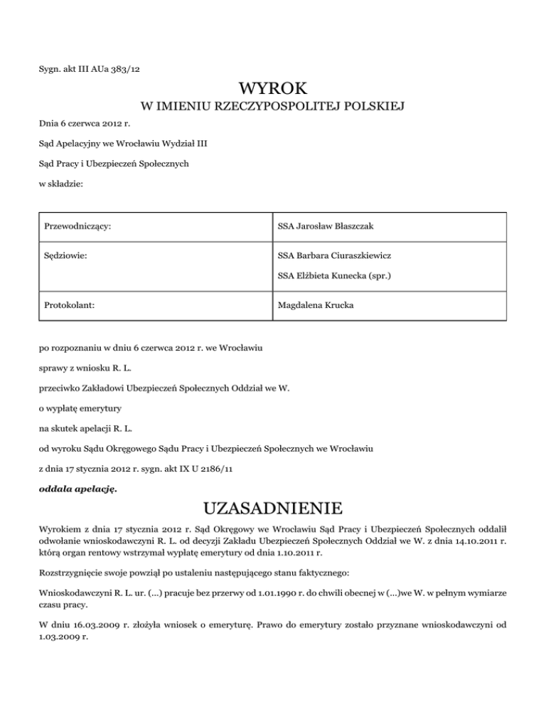 Sygn. akt III AUa 383/12 WYROK W IMIENIU RZECZYPOSPOLITEJ POLSKIEJ Dnia 6 czerwca 2012 r. Sąd Apelacyjny we Wrocławiu Wydział III Sąd Pracy i Ubezpieczeń Społecznych w składzie: Przewodniczący: SSA Jarosław Błaszczak Sędziowie: SSA Barbara Ciuraszkiewicz SSA Elżbieta Kunecka (spr.) Protokolant: Magdalena Krucka po rozpoznaniu w dniu 6 czerwca 2012 r. we Wrocławiu sprawy z wniosku R. L. przeciwko Zakładowi Ubezpieczeń Społecznych Oddział we W. o wypłatę emerytury na skutek apelacji R. L. od wyroku Sądu Okręgowego Sądu Pracy i Ubezpieczeń Społecznych we Wrocławiu z dnia 17 stycznia 2012 r. sygn. akt IX U 2186/11 oddala apelację. UZASADNIENIE Wyrokiem z dnia 17 stycznia 2012 r. Sąd Okręgowy we Wrocławiu Sąd Pracy i Ubezpieczeń Społecznych oddalił odwołanie wnioskodawczyni R. L. od decyzji Zakładu Ubezpieczeń Społecznych Oddział we W. z dnia 14.10.2011 r. którą organ rentowy wstrzymał wypłatę emerytury od dnia 1.10.2011 r. Rozstrzygnięcie swoje powziął po ustaleniu następującego stanu faktycznego: Wnioskodawczyni R. L. ur. (...) pracuje bez przerwy od 1.01.1990 r. do chwili obecnej w (...)we W. w pełnym wymiarze czasu pracy. W dniu 16.03.2009 r. złożyła wniosek o emeryturę. Prawo do emerytury zostało przyznane wnioskodawczyni od 1.03.2009 r. Decyzją Zakładu Ubezpieczeń społecznych oddział we W. z dnia 14.11.2011 r. wstrzymano wnioskodawczyni wypłatę emerytury z uwagi na kontynuowanie zatrudnienia . Przy takich ustaleniach Sąd Okręgowy nie uwzględnił odwołania. W uzasadnieniu wskazał na regulację zawartą w w art. 6 ust.2 ustawy z dnia 16.12.2010 r. o zmianie ustawy o finansach publicznych oraz niektórych innych ustaw/ Dz.U. nr 257 poz. 1726, która wprowadziła zmiany w brzmieniu art.103 ust. 1 i 2 oraz dodała art.103a. Zadaniem Sądu z treści przepisu 103 a ustawy o emeryturach i rentach wynika ,że kontynuowanie zatrudnienia u dotychczasowego pracodawcy nie ma wpływu na nabycie prawa do emerytury, jedynie realizacja tego uprawnienia ulega zawieszeniu w razie kontynuowania zatrudnienia po nabyciu prawa do emerytury,niezależnie od wysokości uzyskiwanego przychodu ze stosunku pracy.Ponadto Sąd powołał orzeczenie Trybunału Konstytucyjnego z dnia 20.11.1995 r. w sprawie K 23/95 oraz z 17 lipca 1996 K 8/96, w których stwierdzał ,iż dyrektywa rozwoju ubezpieczeń społecznych nie wyklucza zmian regulacji prawnych przewidzianych we wcześniejszych ustawach pod warunkiem zachowania istoty tych uprawnień, a zmiany te nie zawsze muszą iść w kierunku korzystnym dla adresatów.. Zdaniem Sądu Okregowego konstytucyjnie chronione prawo wnioskodawczyni do emerytury nabyte od 1.03.2009 r. nie zostało naruszone. Wnioskodawczyni ma nadal prawo do emerytury , które zostało zawieszone na skutek kontynuowania zatrudnienia. Od powyższego wyroku wnioskodawczyni złożyła apelację zarzucając naruszenie 1/ art. 28 ustawy z 16.12.2010 r. o zmianie ustawy o finansach publicznych przez jego nieuzasadnione zastosowanie, 2/ naruszenie art. 2, 21 i 64 Konstytucji RP oraz art.1 Protokołu Dodatkowego nr 1 do Europejskiej Konwencji Praw Człowieka przez przyjęcie, że art. 28 ustawy z 16.12.2010 o zmiennie ustawy o finansach publicznych nie jest niezgodny z tymi przepisami, 3/ naruszenie art.193 Konstytucji RP poprzez nieprzedstawienie Trybunałowi Konstytucyjnemu pytania prawnego co do zgodności art.28 ustawy z 16.12.2010 r. z Konstytucją. Wskazując na powyższe domagała się zmiany zaskarżonego wyroku i uchylenie zaskarżonej decyzji ZUSu z 14.10.2011r. Sąd Apelacyjny zważył co następuje: Apelacja wnioskodawczyni nie zasługuje na uwzględnienie. Sąd I instancji przeprowadził w sprawie należyte postępowanie dowodowe, wyprowadził trafne wnioski i wydał wyrok zgodny z obowiązującym stanem prawnym. Spór w sprawie wymagał rozstrzygnięcia, czy organ rentowy zasadnie zawiesił wypłatę świadczenia emerytalnego wnioskodawczyni, z uwagi na kontynuację zatrudnienia bez uprzedniego rozwiązania stosunku pracy. Sąd I instancji ustalił, że wnioskodawczyni uzyskała prawo do emerytury od dnia 1.03.2009 r. Przed nabyciem prawa do świadczenia emerytalnego, do chwili obecnej, wnioskodawczyni pozostaje w stosunku pracy w (...)we W.. Wejście w życie nowego przepisu art. 28 ustawy z dnia 16 grudnia 2010 r. o zmianie ustawy o finansach publicznych oraz niektórych innych ustaw (Dz.U. Nr 257, poz. 1726), zgodnie z którym począwszy od dnia 1 października 2011 r. prawo do emerytury przyznanej przed dniem 1 stycznia 2011 r., ulega zawieszeniu bez względu na wysokość przychodu uzyskiwanego przez emeryta z tytułu zatrudnienia kontynuowanego bez uprzedniego rozwiązania stosunku pracy z pracodawcą, na rzecz którego wykonywał je bezpośrednio przed dniem nabycia prawa do emerytury, ustalonym w decyzji organu rentowego, stanowi podstawę prawną do zawieszenia prawa do świadczenia emerytalnego. W związku z kontynuacją przez wnioskodawczynię zatrudnienia, zaskarżoną decyzją z dnia 14.10.2011 r. organ rentowy wstrzymał wnioskodawczyni wypłatę emerytury. Stwierdzić należy, że zawieszenie wypłaty świadczenia nastąpiło zgodnie z obowiązującymi przepisami prawa i brak jest podstaw do uwzględnienia zarzutów apelacji. Ustawodawca bowiem nie różnicuje ubezpieczonych według miejsca i rodzaju ich zatrudnienia, a jedynie odnosi się do samego faktu kontynuacji tego zatrudnienia, bez przerwania go w związku z uzyskaniem prawa do emerytury. Sąd Apelacyjny odnosząc się do dalszych zarzutów apelacji wskazuje, że zmiana w/w przepisów, a w szczególności przepisu art. 103a ustawy z dnia 17 grudnia 1998 r. o emeryturach i rentach z Funduszu Ubezpieczeń Społecznych w brzmieniu nadanym przez art. 6 ust.2 ustawy o zmianie ustawy o finansach publicznych oraz niektórych innych ustaw, nie jest zmianą niekonstytucyjną. Trybunał Konstytucyjny bowiem wielokrotnie wyjaśniał, że dyrektywa rozwoju ubezpieczeń