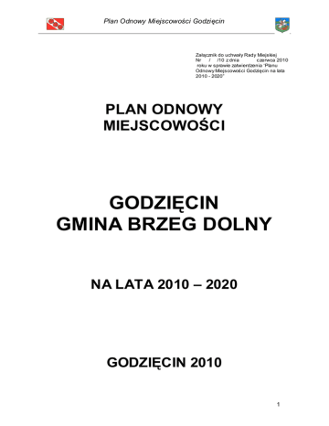 Plan Odnowy Miejscowości Godzięcin Załącznik do uchwały Rady Miejskiej Nr / /10 z dnia czerwca 2010 roku w sprawie zatwierdzenia ‘Planu Odnowy Miejscowości Godzięcin na lata 2010 - 2020” PLAN ODNOWY MIEJSCOWOŚCI GODZIĘCIN GMINA BRZEG DOLNY NA LATA 2010 – 2020 GODZIĘCIN 2010 1 Plan Odnowy Miejscowości Godzięcin Spis treści. Wstęp.......................................................................................................................................... 3 Rozdział 1. Charakterystyka miejscowości Godzięcin. ............................................................. 4 1.1. Lokalizacja ....................................................................................................................... 4 1.2. Historia. ............................................................................................................................ 4 1.3. Struktura przestrzenna miejscowości. ............................................................................ 5 Rozdział 2. Inwentaryzacja zasobów miejscowości Godzięcin. ................................................ 5 2.1. Zasoby przyrodnicze. ...................................................................................................... 5 2.2. Zasoby kulturowe. ........................................................................................................... 5 2.3. Opis zabytków i budynków w miejscowości Godzięcin .................................................. 6 2.4. Obiekty i tereny................................................................................................................ 8 2.5. Infrastruktura techniczna. ................................................................................................ 8 2.5.1. Komunikacja.............................................................................................................. 9 2.5.2. Gospodarka wodno-ściekowa i odpadami stałymi. .................................................. 9 2.6. Gospodarka i rolnictwo. ................................................................................................. 10 2.7. Mieszkańcy i kapitał społeczny. .................................................................................... 11 Rozdział 3. Analiza SWOT....................................................................................................... 13 Rozdział 4. Opis i charakterystyka obszarów o szczególnym znaczeniu dla zaspokojenia potrzeb mieszkańców, sprzyjających nawiązywaniu kontaktów społecznych, ze względu na położenie oraz cechy funkcjonalno-przestrzenne………………………………………………15 Rozdział 5. Opis planowanych do realizacji zadań……………………………………………...17 5.1.Charakterystyka projektów w rankingu 1......................................................................21 5.2. Charakterystyka projektów w ranking 2………………………………………………….22 5.3. Charakterystyka projektów w rankingu 3………………………………………………….23 Podsumowanie……………………………………………………………………………………...25 2 Plan Odnowy Miejscowości Godzięcin Wstęp. Rozwój i odnowa obszarów wiejskich to jedno z kluczowych wyzwań, jakie stoją przed Polską w okresie integracji z Unią Europejską. Zasadniczym jej celem jest wzmocnienie działań służących zmniejszeniu istniejących dysproporcji i różnic w poziomie rozwoju obszarów wiejskich w stosunku do terenów miejskich z jednoczesnym zachowaniem kultury narodowej. Plany Odnowy Miejscowości są zazwyczaj częścią składową prowadzonych od lat przez jednostki samorządu terytorialnego działań, zmierzających do poprawy sytuacji gmin oraz sprzyjających długofalowemu rozwojowi gospodarczemu kraju i regionu, jego spójności gospodarczej, społecznej i terytorialnej oraz integracji z Unią Europejską. Rozwój i odnowa wsi zakłada podejmowanie na jej terenach zróżnicowanych działań z zakresu działalności gospodarczej, kształtowania w sposób zapewniający zachowania walorów środowiskowych i kulturowych, poprawę warunków życia m.in. poprzez rozwój infrastruktury oraz zapewnienie mieszkańcom i przedsiębiorcom dostępu do usług, a także rozwój funkcji kulturowych i społecznych. Plan Odnowy Miejscowości Godzięcin opracowany został na okres najbliższych 10 lat. W okresie tym podejmowane będą określone z uwagi na zaplanowane cele i priorytety rozwojowe działania inwestycyjne, a także inne o charakterze szkoleniowym czy rekreacyjnowypoczynkowym. Przyjęcie do realizacji danego zadania poprzedzone zostanie przygotowaniem niezbędnych opisów i uzasadnień realizacji zadania, opracowaniem zakresu rzeczowego, określeniem kosztów, terminów i sposobu realizacji zadania. Tak przygotowane i określone zadania będą przyjmowane przez zebranie wiejskie i będą stanowić kolejne załączniki do planu. Konieczność opracowania tego dokumentu w sposób formalny wynika z wytycznych Programu Rozwoju Obszarów Wiejskich na lata 2007-2013. Sporządzenie i uchwalenie takiego dokumentu stanowi więc niezbędny warunek przy aplikowaniu o środki finansowe w ramach Programu Rozwoju Obszarów Wiejskich w latach 2007-2013. Przedkładany Plan jest zgodny z dokumentami strategicznymi rozwoju kraju, regionu oraz Gminy Brzeg Dolny. Specyfika Planu polega na tym, że ma on lokalny, miejscowy charakter, obejmuje ograniczony teren jednej miejscowości i przygotowany został, z udziałem mieszkańców tejże miejscowości. Plan Odnowy Miejscowości Godzięcin poprzez realizację wskazanych w nim przedsięwzięć przyczyni się do podniesienia standardu życia mieszkańców oraz zwiększenia atrakcyjności całej miejscowości. 3 Plan Odnowy Miejscowości Godzięcin Rozdział 1. Charakterystyka miejscowości Godzięcin. Obszarem realizacji Planu Odnowy Miejscowości Godzię