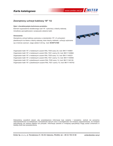 Karta katalogowa ___________________________________________________________________________ Zewnętrzny uchwyt kablowy 19" 1U Opis i charakterystyka techniczna produktu: Element wyposażenia dodatkowego szaf 19", wykonany z blachy stalowej. Umożliwia uporządkowane i przejrzyste ułożenie kabli. Oznaczenia: Zewnętrzny uchwyt kablowy wykonany w standardzie 19" z 5 uchwytami plastikowymi na listwie z blachy stalowej, kolor blachy niebieski, uchwyty wykonane są w kolorze czarnym, waga całości 0,32 kg - kod: DCN/P-016D Organizator kabli 19" z metalowymi uszami RAL 7035 szary 2U, kod: BK/11140861 Organizator kabli 19" z metalowymi uszami RAL 7021 czarny 2U, kod: BK/11140862 Organizator kabli 19" z metalowymi uszami RAL 7035 szary 1U, kod: BK/11140221 Organizator kabli 19" z metalowymi uszami RAL 7021 czarny 1U, kod: BK/11140592 Organizator kabli 19" z plastikowymi uszami RAL 7035 szary 1U, kod: BK/11140130 Organizator kabli 19" z plastikowymi uszami RAL 7021 czarny 1U, kod: BK/11140742 Dołożyliśmy wszelkich starań, aby przedstawione informacje były rzetelne i kompletne. Jednak nie ponosimy odpowiedzialności za dokładność i kompletność danych oraz w szczególności nie możemy zagwarantować, że niniejsza specyfikacja nie zawiera błędów lub pomyłek. Informacje zawarte w niniejszej specyfikacji mogą zostać zmienione w każdej chwili bez powiadomienia. . Emiter Sp. z o. o., ul. Porcelanowa 27, 40-241 Katowice, POLSKA, tel. +48 32 730 34 00 [email protected]