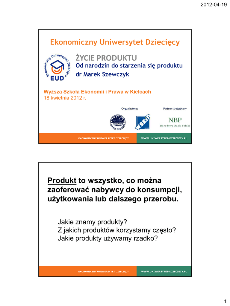 2012-04-19 Ekonomiczny Uniwersytet Dziecięcy ŻYCIE PRODUKTU Od narodzin do starzenia się produktu dr Marek Szewczyk Wyższa Szkoła Ekonomii i Prawa w Kielcach 18 kwietnia 2012 r. EKONOMICZNY UNIWERSYTET DZIECIĘCY WWW.UNIWERSYTET-DZIECIECY.PL Produkt to wszystko, co można zaoferować nabywcy do konsumpcji, użytkowania lub dalszego przerobu. Jakie znamy produkty? Z jakich produktów korzystamy często? Jakie produkty używamy rzadko? EKONOMICZNY UNIWERSYTET DZIECIĘCY WWW.UNIWERSYTET-DZIECIECY.PL 1 2012-04-19 Ważna kolejność pierwsze są ludzkie marzenia, potem powstają potrzeby, następnie pojawiają się produkty, które mogą je zaspokoić. EKONOMICZNY UNIWERSYTET DZIECIĘCY WWW.UNIWERSYTET-DZIECIECY.PL Czym jest produkt? 1) produkt to suma korzyści dla nabywcy, 2) produktem jest to co można zaoferować dla nabywcy, 3) produkt to kombinacja cech fizycznych i niefizycznych, które zaspokajają potrzeby klienta. EKONOMICZNY UNIWERSYTET DZIECIĘCY WWW.UNIWERSYTET-DZIECIECY.PL 2 2012-04-19 Podział produktów Konsumpcyjne Przemysłowe Żywnościowe Nieżywnościowe pieczywo meble stal mleko dywany węgiel mąka biurka mąka mięso telewizory skóra owoce komputery komputer cukierki … telefony … kalkulator … EKONOMICZNY UNIWERSYTET DZIECIĘCY WWW.UNIWERSYTET-DZIECIECY.PL Rynek Kielce Praga Kraków EKONOMICZNY UNIWERSYTET DZIECIĘCY WWW.UNIWERSYTET-DZIECIECY.PL 3 2012-04-19 Targ Targ w Kamerunie Targ nocny na rynku w Marrakeszu - Maroko Targ staroci Targ owoców i warzyw EKONOMICZNY UNIWERSYTET DZIECIĘCY WWW.UNIWERSYTET-DZIECIECY.PL Elementy składowe produktu Asortyment Marka Usługi Opakowanie EKONOMICZNY UNIWERSYTET DZIECIĘCY WWW.UNIWERSYTET-DZIECIECY.PL 4 2012-04-19 Nike – w mitologii greckiej bogini i uosobienie zwycięstwa przedstawiano ją jako młodą kobietę z gałązką oliwną. Nike z Samotraki – marmurowa rzeźba w Luwrze (Paryż). EKONOMICZNY UNIWERSYTET DZIECIĘCY WWW.UNIWERSYTET-DZIECIECY.PL W sensie marketingowym produkt to: Produkt fizyczny Usługa Osoba Miejsce Organizacja Idea EKONOMICZNY UNIWERSYTET DZIECIĘCY WWW.UNIWERSYTET-DZIECIECY.PL 5 2012-04-19 Życie produktu - cykl Faza 1 Faza 2 Faza 3 Faza 4 zysk EKONOMICZNY UNIWERSYTET DZIECIĘCY WWW.UNIWERSYTET-DZIECIECY.PL Istotne czynniki wpływające na zmianę cyklu życia produktu 1. Styl 2. Moda EKONOMICZNY UNIWERSYTET DZIECIĘCY WWW.UNIWERSYTET-DZIECIECY.PL 6 2012-04-19 STYL Najczęściej spotykany pojęciem jest „styl życia”, który określa wzory wyborów zachowań ludzi spośród dostępnych możliwości, a zależnych od ich sytuacji ekonomicznej i społecznej. Ze stylem spotykamy się w różnych dziedzinach życia np.: 1) budownictwo, 2) malarstwo, rzeźba (ogólnie sztuka), 3) produkcja, 4) zdrowie czy nawet życia. EKONOMICZNY UNIWERSYTET DZIECIĘCY WWW.UNIWERSYTET-DZIECIECY.PL Zmiany stylu życia Wolne np..: • w budownictwie • w wyposażeniu mieszkań EKONOMICZNY UNIWERSYTET DZIECIĘCY WWW.UNIWERSYTET-DZIECIECY.PL 7 2012-04-19 Zmiany stylu życia Szybkie Jedzenie Transport EKONOMICZNY UNIWERSYTET DZIECIĘCY WWW.UNIWERSYTET-DZIECIECY.PL MODA EKONOMICZNY UNIWERSYTET DZIECIĘCY WWW.UNIWERSYTET-DZIECIECY.PL 8 2012-04-19 Modyfikacja produktu Cel modyfikacji – zwiększyć zainteresowanie nabywców poprzez: dokonanie zmian w produkcie: podnoszenie jakości, zmianę wygładu zewnętrznego, zmianę sposobu działania, dodanie nowych istotnych funkcji, zmianę wizerunku produktu. EKONOMICZNY UNIWERSYTET DZIECIĘCY WWW.UNIWERSYTET-DZIECIECY.PL Zadania do rozwiązania: 1) Jak zmodyfikować narty? 2) Jak zmodyfikować rower? 3) Jak zmodyfikować telefon? 4) Wymyśl SAM inny produkt? EKONOMICZNY UNIWERSYTET DZIECIĘCY WWW.UNIWERSYTET-DZIECIECY.PL 9 2012-04-19 Dziękuję za uwagę EKONOMICZNY UNIWERSYTET DZIECIĘCY WWW.UNIWERSYTET-DZIECIECY.PL 10
