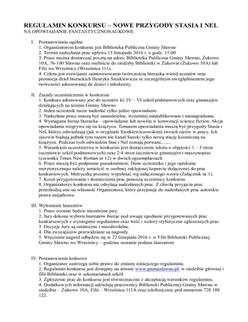 REGULAMIN KONKURSU – NOWE PRZYGODY STASIA I NEL NA OPOWIADANIE FANTASTYCZNONAUKOWE I. Postanowienia ogólne 1. Organizatorem konkursu jest Biblioteka Publiczna Gminy Sławno 2. Termin nadsyłania prac upływa 15 listopada 2016 r. o godz. 15:00 3. Prace można dostarczać pocztą na adres: Biblioteka Publiczna Gminy Sławno, Żukowo 10A, 76-100 Sławno oraz osobiście do siedziby Biblioteki w Żukowie (Żukowo 10A) lub Filii we Wrześnicy (Wrześnica 111). 4. Celem jest rozwijanie zainteresowania twórczością literacką wśród uczniów oraz promocja dzieł literackich Henryka Sienkiewicza ze szczególnym uwzględnieniem jego twórczości adresowanej do dzieci i młodzieży. II. Zasady uczestniczenia w konkursie 1. Konkurs adresowany jest do uczniów kl. IV – VI szkół podstawowych oraz gimnazjów działających na terenie Gminy Sławno 2. Jeden uczestnik może nadesłać tylko jedno opowiadanie. 3. Nadsyłane prace muszą być samodzielne, wcześniej niepublikowane i nienagradzane. 4. Wymagana forma literacka – opowiadanie lub nowela w konwencji science fiction. Akcja opowiadania rozgrywa się na księżycu. Tematem opowiadania muszą być przygody Stasia i Nel, którzy odwiedzają (jak w oryginale Sienkiewiczowskim) swoich ojców w pracy. Ich ojcowie budują jednak tym razem nie kanał Sueski tylko nową stację kosmiczną na księżycu. Podczas tych odwiedzin Staś i Nel zostają porwani........ 5. Warunkiem uczestnictwa w konkursie jest dostarczenie tekstu o objętości 1 – 3 stron (uczniowie szkół podstawowych) oraz 2-4 stron (uczniowie gimnazjów) maszynopisu (czcionka Times New Roman nr 12) w dwóch egzemplarzach. 6. Prace muszą być podpisane pseudonimem. Dane uczestnika i jego opiekuna merytorycznego należy umieścić w osobnej zaklejonej kopercie dołączonej do prac konkursowych. Metryczkę prosimy wypełniać wg załączonego wzoru (Załącznik nr 1). 7. Koszt przygotowania i dostarczenia prac ponoszą uczestnicy konkursu. 8. Organizatorzy konkursu nie odsyłają nadesłanych prac. Z chwilą przyjęcia prac przechodzą one na własność Organizatora, który przejmuje do nadesłanych prac autorskie prawa majątkowe. III. Wyłonienie laureatów 1. Prace oceniać będzie niezależne jury. 2. Jury dokona wyboru laureatów biorąc pod uwagę zgodność przygotowanych prac konkursowych z wymogami regulaminu oraz treść i walory stylistyczne zgłoszonych prac. 3. Decyzje Jury są ostateczne i nieodwołalne. 4. Dla zwycięzców przewidziane są nagrody. 5. Wręczenie nagród odbędzie się w 22 listopada 2016 r. w Filii Biblioteki Publicznej Gminy Sławno we Wrześnicy – godzina zostanie podana laureatom. IV. Postanowienia końcowe 1. Organizator zastrzega sobie prawo do zmiany niniejszego regulaminu. 2. Regulamin konkursu jest dostępny na stronie www.gminaslawno.pl, w siedzibie głównej i filii Biblioteki oraz w sekretariatach szkół. 3. Zgłoszenie prac do konkursu jest równoznaczne z akceptacją warunków regulaminu. 4. Dodatkowych informacji udzielają pracownicy Biblioteki Publicznej Gminy Sławno w siedzibie – Żukowo 10A, Filii – Wrześnica 111A oraz telefonicznie pod numerem 728 188 122.