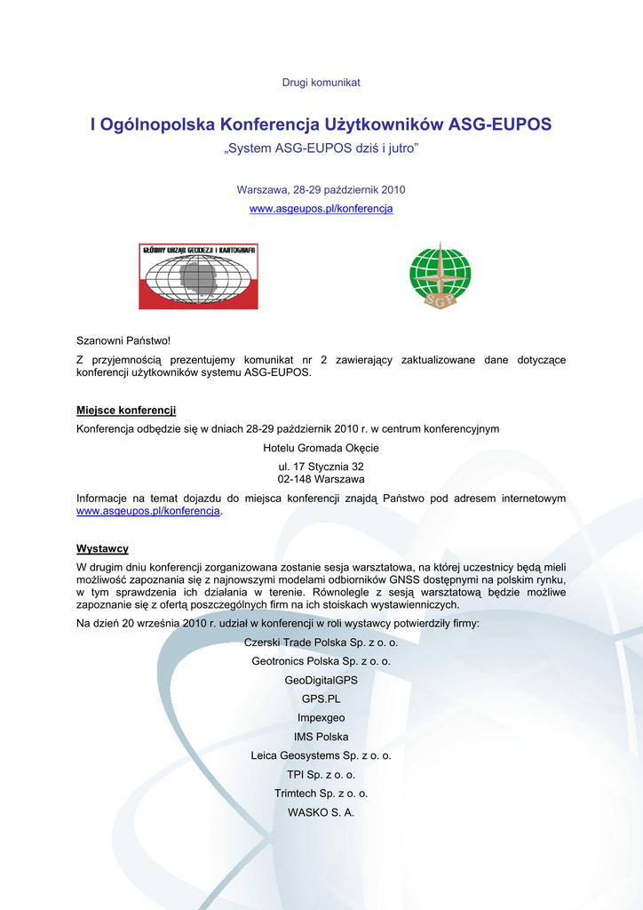 Drugi komunikat I Ogólnopolska Konferencja Użytkowników ASG-EUPOS „System ASG-EUPOS dziś i jutro” Warszawa, 28-29 październik 2010 www.asgeupos.pl/konferencja Szanowni Państwo! Z przyjemnością prezentujemy komunikat nr 2 zawierający zaktualizowane dane dotyczące konferencji użytkowników systemu ASG-EUPOS. Miejsce konferencji Konferencja odbędzie się w dniach 28-29 październik 2010 r. w centrum konferencyjnym Hotelu Gromada Okęcie ul. 17 Stycznia 32 02-148 Warszawa Informacje na temat dojazdu do miejsca konferencji znajdą Państwo pod adresem internetowym www.asgeupos.pl/konferencja. Wystawcy W drugim dniu konferencji zorganizowana zostanie sesja warsztatowa, na której uczestnicy będą mieli możliwość zapoznania się z najnowszymi modelami odbiorników GNSS dostępnymi na polskim rynku, w tym sprawdzenia ich działania w terenie. Równolegle z sesją warsztatową będzie możliwe zapoznanie się z ofertą poszczególnych firm na ich stoiskach wystawienniczych. Na dzień 20 września 2010 r. udział w konferencji w roli wystawcy potwierdziły firmy: Czerski Trade Polska Sp. z o. o. Geotronics Polska Sp. z o. o. GeoDigitalGPS GPS.PL Impexgeo IMS Polska Leica Geosystems Sp. z o. o. TPI Sp. z o. o. Trimtech Sp. z o. o. WASKO S. A. Sponsorzy i nagrody Pragniemy poinformować, że konferencja uzyskała nowych sponsorów: którzy ufundowali wartościowe upominki dla uczestników obrad. Każdy zarejestrowany uczestnik konferencji weźmie udział w losowaniu, które odbędzie się podczas uroczystej kolacji, pierwszego dnia. Do rozlosowania są nagrody renomowanych firm, m. in.: - 2 niwelatory automatyczne, - 2 zintegrowane modemy bezprzewodowe, - ręczny dalmierz laserowy z uchwytem, - oprogramowanie do post-processingu GPS/GLONASS, - telefon PDA, - 3 zestawy nawigacji samochodowej, - zestaw głośników multimedialnych, - 2 zestawy klawiatury bezprzewodowej z myszką, - zestaw multimedialny dla iPod/iPhone. Rejestracja on-line Aby wziąć udział w konferencji należy w pierwszej kolejności dokonać rejestracji on-line, wypełniając formularz dostępny na stronie internetowej www.asgeupos.pl/konferencja. Termin zgłoszeń uczestników konferencji mija 10 października 2010 r. W przypadku zgłoszenia dokonanego już wcześniej w sprawie opłaty należy kontaktować się z biurem ZG SGP pod nr tel. +48 22 826 87 51 lub e-mail: [email protected]. Opłaty konferencyjne Koszt udziału w konferencji wynosi: Rejestracja na całą konferencję (28-29.10.2010 r.) 700 PLN Rejestracja na dzień 28.10.2010 r. 450 PLN Rejestracja na dzień 29.10.2010 r. 350 PLN Cena obejmuje udział w wykładach i warsztatach, materiały konferencyjne, przerwy kawowe i obiadowe oraz uroczystą kolację, natomiast nie obejmuje zakwaterowania i kosztów dojazdu. Ze względu na miejsce organizacji konferencji, rekomendujemy zakwaterowanie w Hotelu Gromada Okęcie. W przypadku dostępności miejsc noclegowych są Państwo upoważnieni do rezerwacji pokoju w cenie promocyjnej po podaniu hasła „ASG-EUPOS GNSS”. Kontakt W sprawach związanych z organizacją konferencji należy kontaktować się z: sprawy techniczne i programowe: ul. Wspólna 2, 00-926 Warszawa tel. +48 22 532 25 62, +48 22 661 82 65 fax +48 22 628 32 06, +48 22 532 25 93 e-mail: [email protected] rejestracja i opłaty konferencyjne: tel. +48 22 826 87 51 e-mail: [email protected] PROGRAM I Ogólnopolskiej Konferencji Użytkowników ASG-EUPOS „System ASG-EUPOS dziś i jutro” Dzień 1, 28.10.2010 (czwartek) 900 – 1100 00 11 – 12 15 Rejestracja uczestników Sesja inauguracyjna Powitanie uczestników Wystąpienie kierownictwa GUGiK Rozwój systemów nawigacji satelitarnej (J. Bosy) 15 12 – 1345 45 13 – 15 15 Przerwa obiadowa Sesja plenarna I – Zastosowania systemów GNSS (prowadzący: J. Bosy) GNSS w zakładaniu osnów szczegółowych i realizacyjnych (J. Lamparski) Technologia GNSS w nowoczesnym rolnictwie (S. Oszczak, A. Ciećko) Zastosowanie technologii GPS-RTK w procesie realizacji inwestycji – na przykładzie budowy Stadionu Narodowego w Warszawie (T. Czerski, P. Szulc) ASG-EUPOS w lotniczych procedurach RNAV GNSS (A. Fellner) 15 15 – 1545 45 15 – 17 15 Przerwa kawowa Sesja plenarna II – Zastosowania systemu ASG-EUPOS, panel dyskusyjny Podsumowanie dwuletniej pracy systemu ASG-EUPOS oraz jego wykorzystania (S. Wajda) Rozwój systemu ASG-EUPOS (A. Oruba) Budowa modułów wspomagania serwisów czasu rzeczywistego systemu ASG-EUPOS (M. Figurski, J Bosy, A. Krankowski) Panel dyskusyjny – GNSS i ASG-EUPOS w praktyce geodezyjnej 30 18 – Uroczysta kolacja Podczas kolacji nastąpi rozlosowanie nagród ufundowanych przez sponsorów. Dzień 2, 29.10.2010 (piątek) 815 – 915 Rejestracja uczestników 915 – 1115 Sesje warsztatowe I 1. GNSS we wspomaganiu służb publicznych Wykorzystanie poprawek DGPS do precyzyjnego pozycjonowania monitorowanych sił i środków w systemach dyspozytorskich na przykładzie systemu SWD firmy WASKO (W. Płoszczonka) 2. GNSS w procesie inwestycyjnym i monitoringu obiektów Technologia GNSS w zintegrowanych systemach monitoringu obiektów inżynierskich (K. Karsznia) Warsztaty praktyczne prezentujące wykorzystanie systemów monitoringu (K. Karsznia) Trimble 4D Control – zintegrowany system do monitorowania przemieszczeń obiektów inżynierskich z wykorzystaniem technologii optycznych oraz GNSS (G. Romik) 3. Warsztaty pomiarowe GNSS – dystrybutorzy sprzętu Podczas warsztatów będą Państwo mieli możliwość zapoznania się z najnowszą ofertą sprzętu i oprogramowania większości producentów sprzętu pomiarowego GNSS dostępnego na polskim rynku, zarówno przy stoiskach wystawienniczych dystrybutorów, jak i bezpośrednio w terenie podczas pokazowych pomiarów. 1115 – 1145 45 11 – 13 45 Przerwa kawowa Sesje warsztatowe II 1. GNSS w rolnictwie i kontrolach obszarowych IACS Udział Polski w opracowaniu i rozwoju zasad testowania i walidacji metod kontroli obszarowych w sy