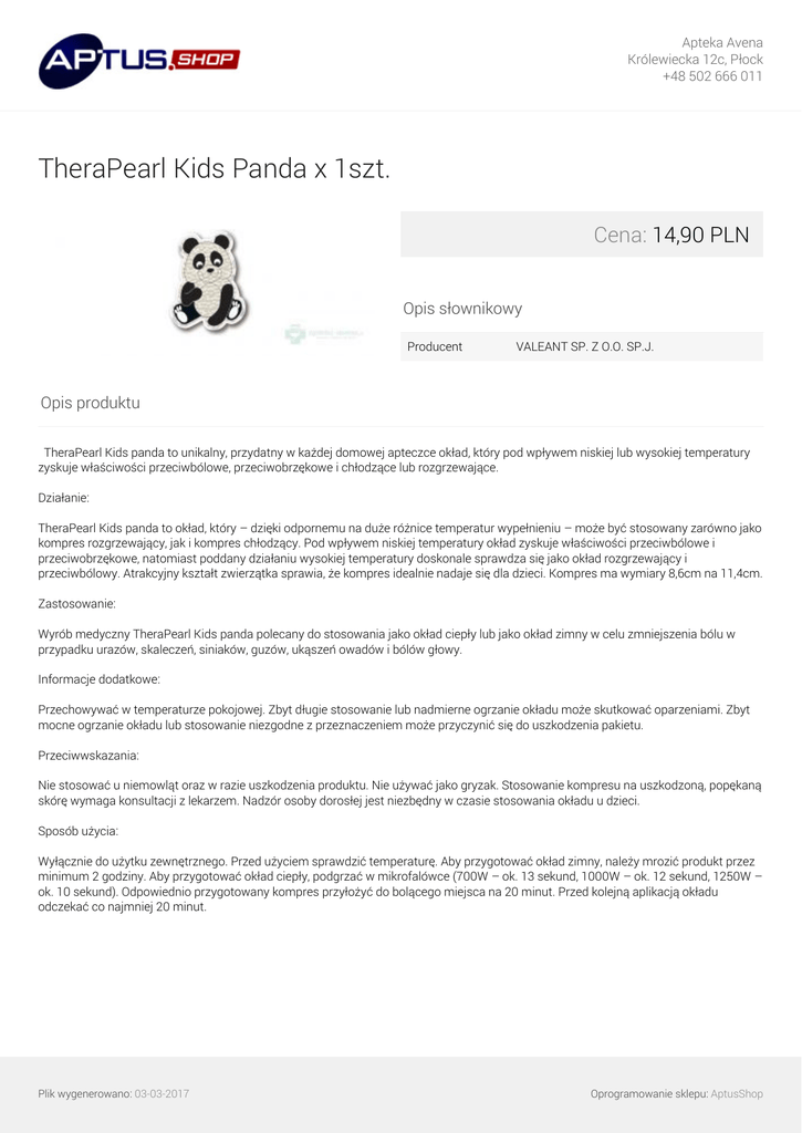 Apteka Avena Królewiecka 12c, Płock +48 502 666 011 TheraPearl Kids Panda x 1szt. Cena: 14,90 PLN Opis słownikowy Producent VALEANT SP. Z O.O. SP.J. Opis produktu TheraPearl Kids panda to unikalny, przydatny w każdej domowej apteczce okład, który pod wpływem niskiej lub wysokiej temperatury zyskuje właściwości przeciwbólowe, przeciwobrzękowe i chłodzące lub rozgrzewające. Działanie: TheraPearl Kids panda to okład, który – dzięki odpornemu na duże różnice temperatur wypełnieniu – może być stosowany zarówno jako kompres rozgrzewający, jak i kompres chłodzący. Pod wpływem niskiej temperatury okład zyskuje właściwości przeciwbólowe i przeciwobrzękowe, natomiast poddany działaniu wysokiej temperatury doskonale sprawdza się jako okład rozgrzewający i przeciwbólowy. Atrakcyjny kształt zwierzątka sprawia, że kompres idealnie nadaje się dla dzieci. Kompres ma wymiary 8,6cm na 11,4cm. Zastosowanie: Wyrób medyczny TheraPearl Kids panda polecany do stosowania jako okład ciepły lub jako okład zimny w celu zmniejszenia bólu w przypadku urazów, skaleczeń, siniaków, guzów, ukąszeń owadów i bólów głowy. Informacje dodatkowe: Przechowywać w temperaturze pokojowej. Zbyt długie stosowanie lub nadmierne ogrzanie okładu może skutkować oparzeniami. Zbyt mocne ogrzanie okładu lub stosowanie niezgodne z przeznaczeniem może przyczynić się do uszkodzenia pakietu. Przeciwwskazania: Nie stosować u niemowląt oraz w razie uszkodzenia produktu. Nie używać jako gryzak. Stosowanie kompresu na uszkodzoną, popękaną skórę wymaga konsultacji z lekarzem. Nadzór osoby dorosłej jest niezbędny w czasie stosowania okładu u dzieci. Sposób użycia: Wyłącznie do użytku zewnętrznego. Przed użyciem sprawdzić temperaturę. Aby przygotować okład zimny, należy mrozić produkt przez minimum 2 godziny. Aby przygotować okład ciepły, podgrzać w mikrofalówce (700W – ok. 13 sekund, 1000W – ok. 12 sekund, 1250W – ok. 10 sekund). Odpowiednio przygotowany kompres przyłożyć do bolącego miejsca na 20 minut. Przed kolejną aplikacją okładu odczekać co najmniej 20 minut. Plik wygenerowano: 03-03-2017 Powered by TCPDF (www.tcpdf.org) Oprogramowanie sklepu: AptusShop