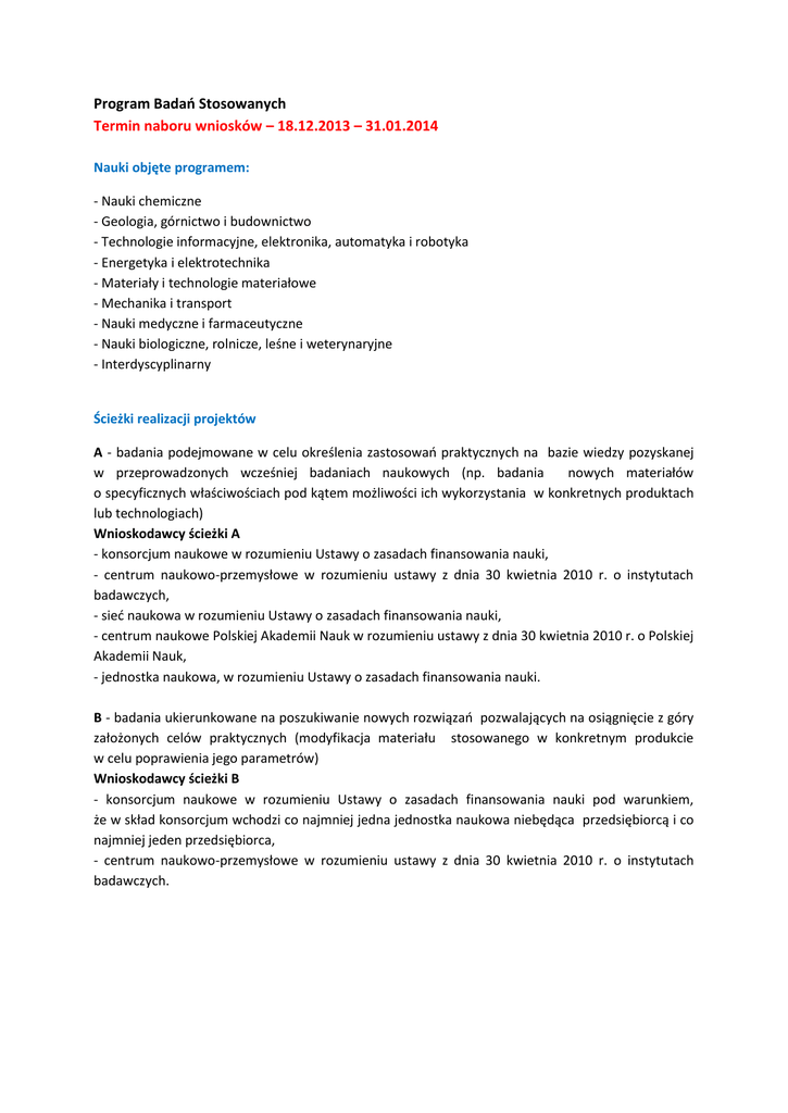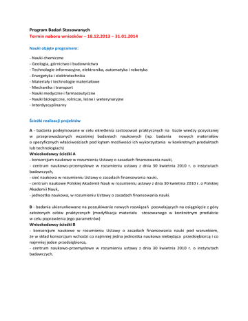 Program Badań Stosowanych Termin naboru wniosków – 18.12.2013 – 31.01.2014 Nauki objęte programem: - Nauki chemiczne - Geologia, górnictwo i budownictwo - Technologie informacyjne, elektronika, automatyka i robotyka - Energetyka i elektrotechnika - Materiały i technologie materiałowe - Mechanika i transport - Nauki medyczne i farmaceutyczne - Nauki biologiczne, rolnicze, leśne i weterynaryjne - Interdyscyplinarny Ścieżki realizacji projektów A - badania podejmowane w celu określenia zastosowań praktycznych na bazie wiedzy pozyskanej w przeprowadzonych wcześniej badaniach naukowych (np. badania nowych materiałów o specyficznych właściwościach pod kątem możliwości ich wykorzystania w konkretnych produktach lub technologiach) Wnioskodawcy ścieżki A - konsorcjum naukowe w rozumieniu Ustawy o zasadach finansowania nauki, - centrum naukowo-przemysłowe w rozumieniu ustawy z dnia 30 kwietnia 2010 r. o instytutach badawczych, - sieć naukowa w rozumieniu Ustawy o zasadach finansowania nauki, - centrum naukowe Polskiej Akademii Nauk w rozumieniu ustawy z dnia 30 kwietnia 2010 r. o Polskiej Akademii Nauk, - jednostka naukowa, w rozumieniu Ustawy o zasadach finansowania nauki. B - badania ukierunkowane na poszukiwanie nowych rozwiązań pozwalających na osiągnięcie z góry założonych celów praktycznych (modyfikacja materiału stosowanego w konkretnym produkcie w celu poprawienia jego parametrów) Wnioskodawcy ścieżki B - konsorcjum naukowe w rozumieniu Ustawy o zasadach finansowania nauki pod warunkiem, że w skład konsorcjum wchodzi co najmniej jedna jednostka naukowa niebędąca przedsiębiorcą i co najmniej jeden przedsiębiorca, - centrum naukowo-przemysłowe w rozumieniu ustawy z dnia 30 kwietnia 2010 r. o instytutach badawczych. Przeznaczenie dofinansowania - Badania przemysłowe – zgodnie z definicją Ustawy o zasadach finansowania nauki – należy przez to rozumieć badania mające na celu zdobycie nowej wiedzy oraz umiejętności w celu opracowywania nowych produktów, procesów i usług lub wprowadzania znaczących ulepszeń do istniejących produktów, procesów i usług; badania te obejmują tworzenie elementów składowych systemów złożonych, szczególnie do oceny przydatności technologii rodzajowych, z wyjątkiem prototypów objętych zakresem prac rozwojowych. - Badania podstawowe – zgodnie z definicją Ustawy o zasadach finansowania nauki – należy przez to rozumieć oryginalne prace badawcze eksperymentalne lub teoretyczne podejmowane przede wszystkim w celu zdobywania nowej wiedzy o podstawach zjawisk i obserwowalnych faktów bez nastawienia na bezpośrednie praktyczne zastosowanie lub użytkowanie. Koszty kwalifikowane badań podstawowych mogą stanowić maksymalnie 15% kosztów kwalifikowanych Projektu ogółem. Dofinansowanie na badania podstawowe może zostać udzielone wyłącznie jednostce naukowej w przypadku uzasadnionym specyfiką Projektu. - Techniczne studia wykonalności na potrzeby prac rozwojowych – działalność mająca charakter przygotowawczy wobec prac rozwojowych. Dofinansowanie na techniczne studium wykonalności może zostać udzielone wyłącznie w Ścieżce B i wyłącznie przedsiębiorcy. Poziom dofinansowania - Jednostka badawcza – do 100% kosztów kwalifikowanych - Przedsiębiorca – dofinansowanie stanowi pomoc publiczną Podstawowa intensywność pomocy w przypadku Badań przemysłowych - 50% kosztów kwalifikowanych; Maksymalna intensywność pomocy przypadku Badań przemysłowych: - 80% kosztów kwalifikowalnych dla mikro lub małego przedsiębiorcy, - 75% kosztów kwalifikowalnych dla średniego przedsiębiorcy, - 65% kosztów kwalifikowalnych dla dużego przedsiębiorcy. Maksymalna intensywność pomocy publicznej dla Technicznych studiów wykonalności na potrzeby prac rozwojowych: - 50% kosztów kwalifikowalnych dla mikro, małego lub średniego przedsiębiorcy; - 40% kosztów kwalifikowalnych dla dużego przedsiębiorcy Okres realizacji projektu Maksymalnie 3 lata Koszty kwalifikowane - Wynagrodzenia - kwalifikowane są koszty wynagrodzeń wraz z pozapłacowymi kosztami pracy, w tym składkami na ubezpieczenia społeczne i zdrowotne, osób zatrudnionych przy prowadzeniu badań przemysłowych lub prac rozwojowych, w części, w jakiej wynagrodzenia te są bezpośrednio związane z realizacją projektu objętego dofinansowaniem. Kategoria obejmuje wynagrodzenia wypłacane na podstawie umowy o pracę oraz umów cywilnoprawnych. - Aparatura naukowo-badawcza i inne urządzenia służące celom badawczym Zakup finansowany w 100 %, Amortyzacja, Odpłatne korzystanie z aparatury naukowo-badawczej i innych urządzeń. - Budynki i grunty Dzierżawa gruntów, Wieczyste użytkowanie gruntów, Amortyzacja budynków. - Koszty podwykonawstwa – zlecenie stronie trzeciej istotnej części merytorycznych prac projektu, które nie są wykonywane na terenie i pod bezpośrednim nadzorem beneficjenta. Koszty te zostają uznane jedynie w wysokości do 70% całkowitych kosztów kwalifikowanych fazy badawczej realizowanej przez przedsiębiorcę. - Inne koszty operacyjne materiały - środki nietrwałe niezbędne do realizacji projektu np. materiały biurowe, surowce, półprodukty, odczynniki, sprzęt laboratoryjny, usługi obce - usługi serwisowe, koszty napraw, usługi transportowe, uczestnictwo w konferencjach, szkolenia pracowników realizujących zadania badawcze, szkolenia związane z obsługą zakupionej aparatury naukowo-badawczej, prowadzenie wyodrębnionego rachunku bankowego (prowizje i inne opłaty), promocja projektu (publikacje, koszt strony internetowej itp.), delegacje. - Koszty ogólne utrzymanie infrastruktury - opłaty czynszowe, opłaty za elektryczność, ogrzewanie, wodę wynagrodzenia pracowników administracyjnych, technicznych i pomocniczych obsługa księgowa usługi pocztowe, telefoniczne, internetowe, kurierskie materiały biurowe i piśmiennicze ubezpieczenia majątkowe. W przypadku zai