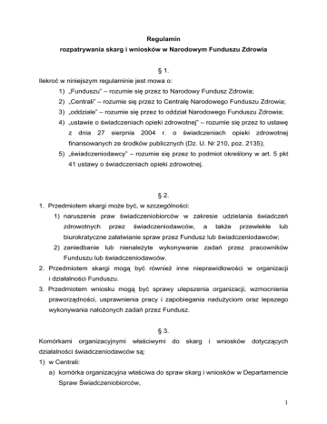 Regulamin rozpatrywania skarg i wniosków w Narodowym Funduszu Zdrowia § 1. Ilekroć w niniejszym regulaminie jest mowa o: 1) „Funduszu” – rozumie się przez to Narodowy Fundusz Zdrowia; 2) „Centrali” – rozumie się przez to Centralę Narodowego Funduszu Zdrowia; 3) „oddziale” – rozumie się przez to oddział Narodowego Funduszu Zdrowia; 4) „ustawie o świadczeniach opieki zdrowotnej” – rozumie się przez to ustawę z dnia 27 sierpnia 2004 r. o świadczeniach opieki zdrowotnej finansowanych ze środków publicznych (Dz. U. Nr 210, poz. 2135); 5) „świadczeniodawcy” – rozumie się przez to podmiot określony w art. 5 pkt 41 ustawy o świadczeniach opieki zdrowotnej. § 2. 1. Przedmiotem skargi może być, w szczególności: 1) naruszenie praw świadczeniobiorców w zakresie udzielania świadczeń zdrowotnych przez świadczeniodawców, a także przewlekłe lub biurokratyczne załatwianie spraw przez Fundusz lub świadczeniodawców; 2) zaniedbanie lub nienależyte wykonywanie zadań przez pracowników Funduszu lub świadczeniodawców. 2. Przedmiotem skargi mogą być również inne nieprawidłowości w organizacji i działalności Funduszu. 3. Przedmiotem wniosku mogą być sprawy ulepszenia organizacji, wzmocnienia praworządności, usprawnienia pracy i zapobiegania nadużyciom oraz lepszego wykonywania nałożonych zadań przez Fundusz. § 3. Komórkami organizacyjnymi właściwymi do skarg i wniosków dotyczących działalności świadczeniodawców są: 1) w Centrali: a) komórka organizacyjna właściwa do spraw skarg i wniosków w Departamencie Spraw Świadczeniobiorców, 1 b) komórka organizacyjna właściwa do spraw skarg i wniosków w Departamencie do spraw Służb Mundurowych, c) Rzecznik Praw Pacjenta; 2) w oddziale: a) komórka organizacyjna właściwa ds. skarg i wniosków wskazana w regulaminie organizacyjnym oddziału, b) Wydział do spraw Służb Mundurowych, c) Biuro Rzecznika Praw Pacjenta. § 4. 1. Komórki organizacyjne, o których mowa w § 3 pkt 1, nadzorują rozpatrywanie skarg i wniosków przez komórki organizacyjne właściwe do skarg i wniosków w oddziałach. 2. Komórki organizacyjne, o których mowa w § 3 pkt 2 lit. a) i b) rozpatrują skargi i wnioski od świadczeniobiorców. W przypadku zakładów opieki zdrowotnej utworzonych przez Ministra Obrony Narodowej, Ministra Sprawiedliwości oraz ministra właściwego ds. wewnętrznych, skargi i wnioski od osób, o których mowa w art. 66 ust. 1 pkt 2-12 ustawy o świadczeniach opieki zdrowotnej i art. 50a ustawy z dnia 30 sierpnia 1991 r. o zakładach opieki zdrowotnej z dnia 30 sierpnia 1991 r. o zakładach opieki zdrowotnej (Dz. U. Nr 91, poz. 408 z późn. zm.) rozpatrują komórki organizacyjne, o których mowa w § 3 pkt 1 lit. b) i pkt 2 lit. b). 3. Komórka organizacyjna, o której mowa w § 3 pkt 1 lit. c) i pkt 2 lit. c): 1) może przyjmować skargi i wnioski od świadczeniobiorców, które kieruje do komórek właściwych określonych w § 3 pkt 1 lit. a) i b) oraz § 3 pkt 2 lit. a) i b); 2) monitoruje przestrzeganie praw pacjenta oraz informuje świadczeniobiorców o możliwościach i sposobach dochodzenia swoich praw wynikających z przepisów ustawy o świadczeniach opieki zdrowotnej; 3) podejmuje interwencje mające na celu ochronę praw pacjenta. 4. Skargi i wnioski dotyczące wykonywania zadań przez pracowników: 1) oddziału - rozpatruje dyrektor oddziału; 2) Centrali oraz dyrektorów oddziałów - rozpatruje Prezes Funduszu lub osoba przez niego upoważniona; 2 3) skargi i wnioski dotyczące działalności Prezesa Funduszu lub jego zastępców rozpatruje Rada Funduszu. § 5. 1. Jeżeli treść pisma wpływającego do komórki organizacyjnej wskazuje na skargę lub wniosek, kierownik komórki organizacyjnej niezwłocznie przekazuje skargę lub wniosek do komórki organizacyjnej zajmującej się rozpatrywaniem skarg i wniosków, zgodnie z właściwością określoną w § 4. 2. Przepis ustępu poprzedzającego stosują odpowiednio komórki organizacyjne określone w § 3. 3. Jeżeli treść skargi lub wniosku wskazuje na konieczność przeprowadzenia kontroli świadczeniodawcy, skarga przekazywana jest komórce organizacyjnej właściwej do spraw kontroli. § 6. 1. Skargi i wnioski mogą być wnoszone w dowolnej formie, a w szczególności pisemnie oraz ustnie do protokołu. 2. Skargi i wnioski niezawierające imienia i nazwiska (nazwy) oraz adresu wnoszącego pozostawia się bez rozpoznania. 3. Jeżeli z treści skargi lub wniosku nie można należycie ustalić ich przedmiotu, wzywa się wnoszącego skargę lub wniosek do złożenia, w terminie siedmiu dni od dnia otrzymania wezwania, wyjaśnienia lub uzupełnienia, z pouczeniem, że nieusunięcie tych braków spowoduje pozostawienie skargi lub wniosku bez rozpoznania. 4. Wnoszący skargę lub wniosek może zastrzec nieujawnianie swego nazwiska i adresu. Zastrzeżenie takie jest dla Funduszu wiążące. 5. Skarga lub wniosek mogą być składane w imieniu własnym skarżącego lub innej osoby za jej pisemną zgodą. 6. Komórki organizacyjne zajmujące się rozpatrywaniem skarg i wniosków prowadzą ewidencję skarg i wniosków. 3 § 7. Interesanci przyjmowani są w sprawie skarg i wniosków codziennie, w godzinach pracy Rzecznika Praw Pacjenta w Centrali, Biura Rzecznika Praw Pacjenta w oddziałach i komórek organizacyjnych zajmujących się rozpatrywaniem skarg i wniosków. § 8. 1. W razie zgłoszenia skargi lub wniosku ustnie, przyjmujący zgłoszenie sporządza protokół, który podpisuje wnoszący skargę lub wniosek oraz przyjmujący zgłoszenie. 2. W protokole umieszcza się datę przyjęcia skargi lub wniosku, imię i nazwisko, adres osoby zgłaszającej oraz zwięzły opis treści sprawy. Wzór protokołu stanowi załącznik nr 1 do regulaminu. 3. Przyjmujący skargę lub wniosek jest obowiązany potwierdzić złożenie skargi lub wniosku, jeżeli tego żąda wnoszący. 4. W przypadku skarg lub wniosk