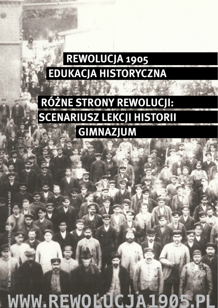 REWOLUCJA 1905 EDUKACJA HISTORYCZNA fot. ze zbiorów Muzeum Tradycji Niepodległościowych w Łodzi RÓŻNE STRONY REWOLUCJI: SCENARIUSZ LEKCJI HISTORII GIMNAZJUM Różne strony rewolucji: scenariusz lekcji historii gimnazjum Wprowadzenie Scenariusz jest przeznaczony dla uczniów i uczennic gimnazjum. Jego celem jest przybliżenie wydarzeń rewolucji 1905 roku za pomocą (wspomaganej przez nauczyciela/nauczycielkę) analizy materiału źródłowego – druków ulotnych z epoki. Na podstawie materiałów źródłowych uczniowie i uczennice przygotują krótką prezentację, w której zostanie przedstawione zróżnicowanie postaw politycznych w okresie rewolucji 1905 roku oraz sposoby argumentacji wykorzystywane przez ówczesne ruchy społeczno-polityczne. Realizowane cele kształcenia Uczeń/uczennica wyszukuje informacje w tekstach źródłowych; uczeń/uczennica w sposób logiczny i spójny przedstawia pozyskane informacje, budując w oparciu o nie wnioski; uczeń/uczennica wskazuje w narracji historycznej warstwę informacyjną, wyjaśniającą i oceniającą. Realizowane treści nauczania Uczeń/uczennica charakteryzuje i ocenia zróżnicowane postawy społeczeństwa wobec zaborców; uczeń/uczennica przedstawia główne nurty życia politycznego pod zaborami w końcu XIX wieku. Metody nauczania Praca w grupach (do sześciu grup w zależności od liczebności klasy), analiza materiałów źródłowych (druki ulotne z okresu rewolucji 1905 roku), prezentacja. Materiały źródłowe: Kilkaset ulotek z okresu rewolucji 1905 roku zostało zdigitalizowanych i można je swobodnie przeglądać w repozytorium biblioteki cyfrowej Polona (www. polona.pl). Ich skany można znaleźć poprzez wpisanie w wyszukiwarkę Polony lub Federacji Bibliotek Cyfrowych (www.fbc.pionier.net.pl) fragmentu incipitów. Podczas lekcji proponujemy korzystanie z tekstów ulotek, których incipity brzmią następująco: Grupa 1. Walka przeciwko caratowi i o demokratyzację Rosji [Inc.:] Coraz mocniejsze ciosy spadają na rząd carski! Ta podła organizacja siepaczów i rabusiów próżno się łudziła […] [Inc.:] Robotnicy! Car dał konstytucję – ale bramy więzień politycznych jeszcze nie otwarte, wojska z ulic niecofnięte […] [Inc.:] Od dnia 22-go Stycznia datuje się w całym państwie cara i w naszym kraju nowa epoka […] Grupa 2. Wizerunki kapitalistów [Inc.:] Towarzysze robotnicy! Stał się gwałt niesłychany: już drugi rozpoczyna się tydzień odkąd właściciele fabryki żyrardowskiej tchórzliwie uciekli za granicę […] [Inc.:] Gdy karząca ręka dosięgła zbrodniarza politycznego względem klasy robotniczej, jednego z największych jej wyzyskiwaczy, fabrykanta Kunitzera […] [Inc.:] Robotnicy! Rozzuchwaleni fabrykanci łódzcy wyrzucili na bruk kilkadziesiąt tysięcy rodzin robotniczych […] Grupa 3. Przeciwko strajkom – agitacja środowisk narodowodemokratycznych [Inc.:] Koledzy i Towarzysze pracy! Zapowiedź bezrobocia na kolei wydała już owoce, lecz bardzo cierpkie […] [Inc.:] Panika strejkowa ponownie szerzyć się poczyna w kraju naszym […] [Inc.:] Z różnych stron kraju dochodzą wieści o przygotowaniach do nowych strejków […] Grupa 4. W walce z antysemityzmem [Inc.:] W obronie ludności przed carskimi zbirami. Obywatele! Jedną z broni, jakie ku swej hańbie na wieki, używa z rewolucją rząd carski, są pogromy […] [Inc.:] Baczność! Brońmy się! Siepacze carscy chcą wywołać w Warszawie pogrom żydowski […] Grupa 5. Mitologizacja bohaterów rewolucji [Inc.:] W piątek 21 b.m. poległ na szubienicy towarzysz nasz, Stefan Okrzeja. Kiedy przed miesiącem sąd wojenny skazał Okrzeję na śmierć […] [Inc.:] Robotnicy! Rząd carski wydał krwawy wyrok na dwuch bojowników […] [Inc.:] Robotnicy! Dziś o świcie na stokach cytadeli warszawskiej stracony został Marcin Kasprzak […] Grupa 6. Rewolucja jako moralna przemiana [Inc.:] Najpoważniejszym źródłem dochodu państwa rosyjskiego jest dochód ze spirytualji, wynosi bowiem przeszło 400 miljonów rubli […] [Inc.:] Wszyscy odczuwamy dobrze, że przeżywamy obecnie niezmiernie ważny okres w dziejach naszego narodu […] [Inc.:] Robotnicy! Wciągu trzech dni od dnia 24 maja Warszawa była widownią niezwykłego wybuchu ludowego […] Zarówno linki do skanów zamieszczonych w bibliotece cyfrowej Polona, jak i przepisane teksty wszystkich wyżej zaproponowanych druków ulotnych można znaleźć również na stronie www.rewolucja1905.blogspot.pl, w zakładce „Ulotki”. Zachęcamy również do zapoznania się z innymi zdigitalizowanymi drukami ulotnymi z okresu rewolucji 1905 roku i ewentualnej modyfikacji zaproponowanych zestawów. Przy pracy w grupach sugerujemy użycie białych kartek formatu A2 i markerów, na których każda z grup będzie przygotowywała prezentację swoich odpowiedzi. Czas trwania i organizacja lekcji: Dwie jednostki lekcyjne. Najlepiej, gdyby udało się przeprowadzić drugą lekcję bezpośrednio po pierwszej, ale ponieważ w szkolnej praktyce może okazać się to trudne, proponujemy następujący podział: pierwsza godzina zostaje poświęcona wprowadzeniu w problematykę rewolucji 1905 roku i przeprowadzonej w grupach analizie tekstów źródłowych; druga godzina zostaje przeznaczona na prezentacje przygotowane przez poszczególne grupy i dyskusję podsumowującą. Harmonogram lekcji Lekcja 1 a) Czynności organizacyjne: przestawienie ławek (po jednym skupisku ławek na grupę) i podzielenie uczniów (grupa powinna liczyć od 4 do 6 osób). Czas: 5 minut. b) Wprowadzenie do tematu przez nauczyciela – prezentacja podstawowych informacji na temat rewolucji 1905 roku (można posłużyć się tekstami zamieszczonymi w książce Rewolucja 1905. Przewodnik Krytyki Politycznej, zwłaszcza: Kamil Piskała, Zapomniana rewolucja; rozmowa z profesorem Feliksem Tychem, To pierwszy zryw wolnościowy, którego zakończenie nie oznaczało pogorszenia sytuacji Polaków…; Kalendari