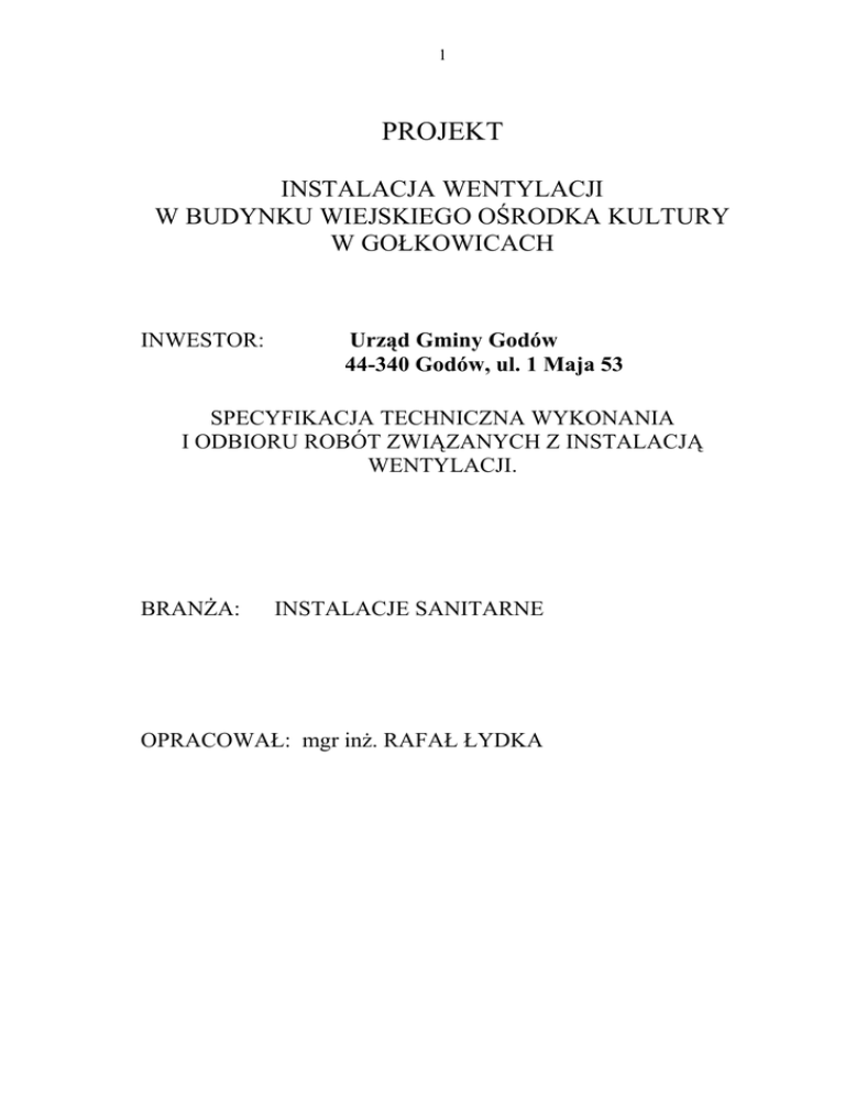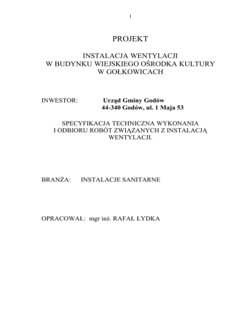 1 PROJEKT INSTALACJA WENTYLACJI W BUDYNKU WIEJSKIEGO OŚRODKA KULTURY W GOŁKOWICACH INWESTOR: Urząd Gminy Godów 44-340 Godów, ul. 1 Maja 53 SPECYFIKACJA TECHNICZNA WYKONANIA I ODBIORU ROBÓT ZWIĄZANYCH Z INSTALACJĄ WENTYLACJI. BRANśA: INSTALACJE SANITARNE OPRACOWAŁ: mgr inŜ. RAFAŁ ŁYDKA 2 Spis treści 1. Wstęp 2. Materiały 3. Sprzęt 4. Wykonanie robót 5. Kontrola jakości 6. Obmiar robót 7. Odbiór robót 8. Przepisy związane z instalacją wentylacyjną 3 1. Wstęp. 1.1 Przedmiot ST Przedmiotem niniejszej Specyfikacji Technicznej są wymagania dotyczące wykonania i odbioru robót zwianych z instalacją wentylacji dla sali bankietowej oraz widowiskowej w budynku Wiejskiego Ośrodka Kultury w Gołkowicach przy ul. 1-go Maja 101 Gołkowice. 1.1.1. Zakres robót. Zakres robót obejmuje wykonanie instalacji wentylacji mechanicznej na podstawie Dokumentacji Projektowej zawierającej rysunki robocze ww. instalacji w zakresie: 1) Instalacji wentylacji nawiewno-wywiewnej sali bankietowej; 2) Instalacji wentylacji nawiewno-wywiewnej sali widowiskowej. 1.1.2. Charakterystyka techniczna robót związanych z wykonaniem instalacji wentylacji. 1) MontaŜ przewodów wentylacyjnych z blachy stalowej ocynkowanej. Przewody niskociśnieniowe -klasa N, o szczelności normalnej-klasa A; 2) MontaŜ samoprzylepnej maty lamelowej z wełny mineralnej pokrytej zbrojona folią aluminiową do przewodów wentylacyjnych; 3) MontaŜ płaszcza z blachy ocynkowanej na przewody prowadzone na zewnątrz budynku; 4) MontaŜ elastycznych izolowanych przewodów wentylacyjnych okrągłych typu Flex (podejście do nawiewników); 5) MontaŜ nawiewników szczelinowych ze skrzynką rozpręŜą izolowaną termicznie, przepustnicą regulacyjną; 6) MontaŜ kratek wywiewnych z przepustnicą regulacyjną; 7) MontaŜ przepustnic regulacyjnych; 8) MontaŜ tłumików akustycznych płytowych ; 9) MontaŜ centrali nawiewno – wywiewnej z odzyskiem ciepła V=4 000 m3/h, ∆p=200 Pa , wraz z automatyką; 10) MontaŜ centrali nawiewno – wywiewnej z odzyskiem ciepła V=2800 m3/h, ∆p=180 Pa wraz z automatyką; 11) MontaŜ agregatu typu ERQ250A Qch=28.0kW wraz z adaptorem do chłodnicy oraz zaworem rozpręŜnym; 12) MontaŜ agregatów typu ERQ200A Qch=22.4 kW wraz z adaptorem do chłodnicy oraz zaworem rozpręŜnym; 13) MontaŜ konstrukcji stalowej pod centrale wentylacyjne oraz agregaty. 14) Obudowa płytami GK nawiewników szczelinowych oraz wywiewników. 1.2 Zakres stosowania specyfikacji ST. Specyfikacja techniczna jest stosowana jako dokument przetargowy i kontraktowy przy zlecaniu i realizacji robót wymienionych w punkcie 1.1. 4 1.3 Ogólne wymagania dotyczące wykonania robót. Wykonawcza robót jest odpowiedzialny za jakość wykonania oraz za zgodność robót z dokumentacją projektową, ST i obowiązującymi normami. 2. Materiały. 2.1. Wymagania ogólne dotyczące wyrobów stosowanych w instalacji wentylacji: 1) Materiały z których wykonywane są wyroby stosowane w instalacjach wentylacyjnych i klimatyzacyjnych powinny odpowiadać warunkom stosowania w instalacjach. 2) Stopień zabezpieczenia antykorozyjnego obudów urządzeń powinien odpowiadać co najmniej właściwością blachy stalowej ocynkowanej. 3) Powierzchnie obudów powinny być gładkie, bez wgnieceń i uszkodzeń powłok ochronnych. 4) Szczelność połączeń i elementów wentylacyjnych z przewodami wentylacyjnymi powinna odpowiadać wymaganiom szczelności tych przewodów. 5) NaleŜy zapewnić łatwy dostęp do urządzeń i elementów wentylacyjnych i klimatyzacyjnych w celu ich obsługi konserwacji lub wymiany. 6) Urządzenia i elementy instalacji wentylacyjno-klimatyzacyjnej powinny być zamontowane zgodnie z instrukcja producenta. 7) Urządzenia i elementy instalacji powinny mieć dopuszczenie do stosowania w budownictwie. 2.2. Przewody i kształtki instalacji wentylacji. Przewody i kształtki wentylacyjne wykonać z blachy stalowej ocynkowanej zgodnie z wymogami normy PN-B-03434/99, PN-EN-1505 i PN-EN-1506 jako niskociśnieniowe [klasa wykonania N] – pozostałe przewody. Szczelność instalacji wg normy PN–B– 76001/96 powinna odpowiadać klasie A [szczelność normalna]. 2.3. Uzbrojenia instalacji wentylacji. W ramach projektowanej instalacji wentylacyjnej przewidziano następujące elementy: regulacyjne, tłumiące, nawiewne i wyciągowe: 1) Przepustnice wielopłaszczyznowe typu PS z ręczną regulacją. Przepustnica Ŝaluzjowa zbudowana jest z profili utwardzonego aluminium; 2) Nawiewniki szczelinowe typu LDB zbudowane są ze skrzynki rozpręŜnej izolowanej termicznie z króćcem przyłączeniowym z przepustnicą regulacyjną; 3) Kratki wywiewne typu ALW przepustnicą regulacyjną oraz płyty; 4) Tłumiki akustyczne typu TAP21AA. 2.4. Centrale wentylacyjne. W projektowanych układach wentylacyjnych przewidziano następujące centrale wentylacyjne: 5 1) Centrala dachowa nawiewno-wywiewna dla sali bankietowej - 1 kpl. Nawiew: - sekcja przepustnicy; - sekcja filtracji F5; - sekcja odzysku ciepła wymiennika krzyŜowego; - pionowa komora mieszania z recyrkulacją; - sekcja nagrzewnicy glikolowej o mocy 19,6 kW parametr 75/55st C; - sekcja chłodnicy freonowej, wydajność chłodnicza 22 kW; -odkraplacz; - sekcja wentylatorowa, V=2800 m3/h, spręŜ dyspozycyjny 180 Pa; - sekcja tłumika szumów, tłumienie 30dB. Wywiew: - sekcja tłumika szumów, tłumienie 30dB; - sekcja filtracji F5; - sekcja wentylatorowa, V=2800 m3/h, spręŜ dyspozycyjny 180 Pa; - pionowa komora mieszania z recyrkulacją; - sekcja odzysku ciepła wymiennika krzyŜowego. Centrala w wykonaniu zewnętrznym, Centrala z kompletną automatyką zabezpieczająco-sterowniczą. 2) Centrala dachowa nawiewno-wywiewna dla Sali widowiskowej - 1 kpl. Nawiew: - sekcja przepustnicy; - sekcja filtracji F5; - sekcja odzysku ciepła wymiennika krzyŜowego; - pionowa komora mieszania z recyrkulacją; - sekcja nagrzewnicy glikolowej o mocy 31,7 kW parametr 75/55st C; - sekcja chłodnic