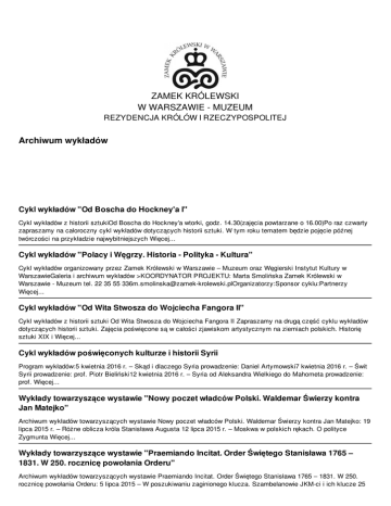 ZAMEK KRÓLEWSKI W WARSZAWIE - MUZEUM REZYDENCJA KRÓLÓW I RZECZYPOSPOLITEJ Archiwum wykładów Cykl wykładów "Od Boscha do Hockney'a I" Cykl wykładów z historii sztukiOd Boscha do Hockney'a wtorki, godz. 14.30(zajęcia powtarzane o 16.00)Po raz czwarty zapraszamy na całoroczny cykl wykładów dotyczących historii sztuki. W tym roku tematem będzie pojęcie późnej twórczości na przykładzie najwybitniejszych Więcej... Cykl wykładów "Polacy i Węgrzy. Historia - Polityka - Kultura" Cykl wykładów organizowany przez Zamek Królewski w Warszawie – Muzeum oraz Węgierski Instytut Kultury w WarszawieGaleria i archiwum wykładów >KOORDYNATOR PROJEKTU: Marta Smolińska Zamek Królewski w Warszawie - Muzeum tel. 22 35 55 [email protected]:Sponsor cyklu:Partnerzy Więcej... Cykl wykładów "Od Wita Stwosza do Wojciecha Fangora II" Cykl wykładów z historii sztuki Od Wita Stwosza do Wojciecha Fangora II Zapraszamy na drugą część cyklu wykładów dotyczących historii sztuki. Zajęcia poświęcone są w całości zjawiskom artystycznym na ziemiach polskich. Historię sztuki XIX i Więcej... Cykl wykładów poświęconych kulturze i historii Syrii Program wykładów:5 kwietnia 2016 r. – Skąd i dlaczego Syria prowadzenie: Daniel Artymowski7 kwietnia 2016 r. – Świt Syrii prowadzenie: prof. Piotr Bieliński12 kwietnia 2016 r. – Syria od Aleksandra Wielkiego do Mahometa prowadzenie: prof. Więcej... Wykłady towarzyszące wystawie "Nowy poczet władców Polski. Waldemar Świerzy kontra Jan Matejko" Archiwum wykładów towarzyszących wystawie Nowy poczet władców Polski. Waldemar Świerzy kontra Jan Matejko: 19 lipca 2015 r. – Różne oblicza króla Stanisława Augusta 12 lipca 2015 r. – Moskwa w polskich rękach. O polityce Zygmunta Więcej... Wykłady towarzyszące wystawie "Praemiando Incitat. Order Świętego Stanisława 1765 – 1831. W 250. rocznicę powołania Orderu" Archiwum wykładów towarzyszących wystawie Praemiando Incitat. Order Świętego Stanisława 1765 – 1831. W 250. rocznicę powołania Orderu: 5 lipca 2015 – W poszukiwaniu zaginionego klucza. Szambelanowie JKM-ci i ich klucze 25 czerwca 2015 r. – Więcej... czerwca 2015 r. – Więcej... Cykl wykładów "Od Nefretete do Warhola" (od 7.10.2014 r. do 30.06.2015 r.) Pracownia Działań Muzealnych zaprasza na cykl wykładów z historii sztuki Od Nefretete do Warhola Od 7 października 2014 r. godz. 14.30 Dlaczego artysta staje się sławny? Co to jest arcydzieło? Dlaczego sztuka współczesna wydaje się Więcej... Cykl wykładów, poświęcony Ogrodom zamkowym Nowy cykl wykładów, poprzedzających otwarcie Ogrodu Górnego Dział Oświatowy Zamku Królewskiego serdecznie zaprasza na nowy cykl wykładów, poświęcony ogrodom, który będzie poprzedzał otwarcie ogrodu zamkowego na tarasie górnym w maju. W ramach tego cyklu Więcej... Cykl wykładów "Czy piękno zbawi świat?" MUSICA VINCIT OMNIA Fundacja im. Andrzeja Markowskiego oraz Zamek Królewski w Warszawie – Muzeum mają zaszczyt zaprosić na cykl wykładów prof. Marka Dyżewskiego Czy piękno zbawi świat? Archiwum spotkań: 18 maja 2015 r. - godz. Więcej... Cykl wykładów „Kultura i sztuka orientu" Cykl wykładów na ekspozycji Kobierców Wschodnich w pałacu Pod Blachą W 2015 roku obchodzimy 100-lecie urodzin Pani Teresy Sahakian, kolekcjonerki i filantropki. Dzięki darowi Pani Sahakian Zamek Królewski w Warszawie stał się miejscem ekspozycji jednej Więcej... Zamek Królewski w Warszawie - Muzeum. Rezydencja Królów i Rzeczypospolitej www.zamek-krolewski.pl