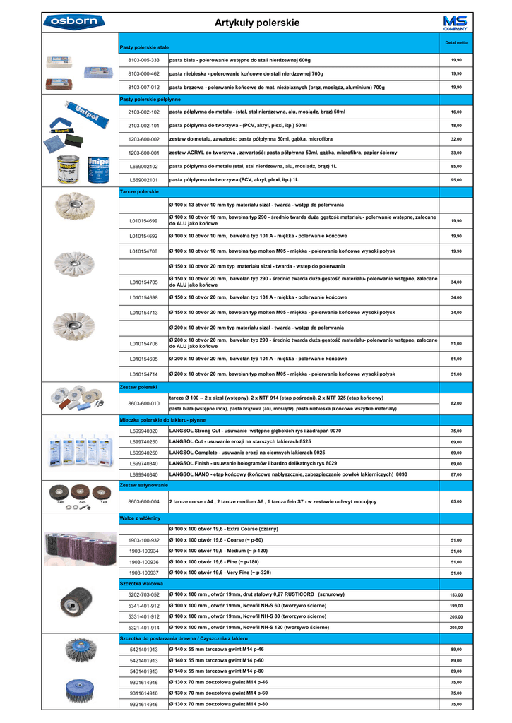 Artykuły polerskie Detal netto Pasty polerskie stałe 8103-005-333 pasta biała - polerowanie wstępne do stali nierdzewnej 600g 19,90 8103-000-462 pasta niebieska - polerowanie końcowe do stali nierdzewnej 700g 19,90 8103-007-012 pasta brązowa - polerwanie końcowe do mat. nieżelaznych (brąz, mosiądz, aluminium) 700g 19,90 Pasty polerskie półpłynne 2103-002-102 pasta półpłynna do metalu - (stal, stal nierdzewna, alu, mosiądz, brąz) 50ml 16,00 2103-002-101 pasta półpłynna do tworzywa - (PCV, akryl, plexi, itp.) 50ml 18,00 1203-600-002 zestaw do metalu, zawatość: pasta półpłynna 50ml, gąbka, microfibra 32,00 1203-600-001 zestaw ACRYL do tworzywa , zawartość: pasta półpłynna 50ml, gąbka, microfibra, papier ścierny 33,00 L669002102 pasta półpłynna do metalu (stal, stal nierdzewna, alu, mosiądz, brąz) 1L 85,00 L669002101 pasta półpłynna do tworzywa (PCV, akryl, plexi, itp.) 1L 95,00 Tarcze polerskie Ø 100 x 13 otwór 10 mm typ materiału sizal - twarda - wstęp do polerwania L010154699 Ø 100 x 10 otwór 10 mm, bawełna typ 290 - średnio twarda duża gęstość materiału- polerwanie wstępne, zalecane do ALU jako końcwe 19,90 L010154692 Ø 100 x 10 otwór 10 mm, bawełna typ 101 A - miękka - polerwanie końcowe 19,90 L010154708 Ø 100 x 10 otwór 10 mm, bawełna typ molton M05 - miękka - polerwanie końcowe wysoki połysk 19,90 Ø 150 x 10 otwór 20 mm typ materiału sizal - twarda - wstęp do polerwania L010154705 Ø 150 x 10 otwór 20 mm, bawełan typ 290 - średnio twarda duża gęstość materiału- polerwanie wstępne, zalecane do ALU jako końcwe 34,00 L010154698 Ø 150 x 10 otwór 20 mm, bawełan typ 101 A - miękka - polerwanie końcowe 34,00 L010154713 Ø 150 x 10 otwór 20 mm, bawełan typ molton M05 - miękka - polerwanie końcowe wysoki połysk 34,00 Ø 200 x 10 otwór 20 mm typ materiału sizal - twarda - wstęp do polerwania L010154706 Ø 200 x 10 otwór 20 mm, bawełan typ 290 - średnio twarda duża gęstość materiału- polerwanie wstępne, zalecane do ALU jako końcwe 51,00 L010154695 Ø 200 x 10 otwór 20 mm, bawełan typ 101 A - miękka - polerwanie końcowe 51,00 L010154714 Ø 200 x 10 otwór 20 mm, bawełan typ molton M05 - miękka - polerwanie końcowe wysoki połysk 51,00 Zestaw polerski tarcze Ø 100 -- 2 x sizal (wstępny), 2 x NTF 914 (etap pośredni), 2 x NTF 925 (etap końcowy) 8603-600-010 82,00 pasta biała (wstępne inox), pasta brązowa (alu, mosiądz), pasta niebieska (końcowe wszytkie materiały) Mleczka polerskie do lakieru- płynne L699940320 LANGSOL Strong Cut - usuwanie wstępne głębokich rys i zadrapań 9070 75,00 L699740250 LANGSOL Cut - usuwanie erozji na starszych lakierach 8525 69,00 L699940250 LANGSOL Complete - usuwanie erozji na ciemnych lakierach 9025 69,00 L699740340 LANGSOL Finish - usuwanie hologramów i bardzo delikatnych rys 8029 69,00 L699940340 LANGSOL NANO - etap końcowy (końcowe nabłyszcznie, zabezpieczanie powłok lakierniczych) 8090 87,00 2 tarcze corse - A4 , 2 tarcze medium A6 , 1 tarcza fein S7 - w zestawie uchwyt mocujący 65,00 Zestaw satynowanie 8603-600-004 Walce z włókniny Ø 100 x 100 otwór 19,6 - Extra Coarse (czarny) 1903-100-932 Ø 100 x 100 otwór 19,6 - Coarse (~ p-80) 51,00 1903-100934 Ø 100 x 100 otwór 19,6 - Medium (~ p-120) 51,00 1903-100936 Ø 100 x 100 otwór 19,6 - Fine (~ p-180) 51,00 1903-100937 Ø 100 x 100 otwór 19,6 - Very Fine (~ p-320) 51,00 5202-703-052 Ø 100 x 100 mm , otwór 19mm, drut stalowy 0,27 RUSTICORD (sznurowy) 153,00 5341-401-912 Ø 100 x 100 mm , otwór 19mm, Novofil NH-S 60 (tworzywo ścierne) 199,00 5331-401-912 Ø 100 x 100 mm , otwór 19mm, Novofil NH-S 80 (tworzywo ścierne) 205,00 5321-401-914 Ø 100 x 100 mm , otwór 19mm, Novofil NH-S 120 (tworzywo ścierne) 205,00 Szczotka walcowa Szczotka do postarzania drewna / Czyszcznia z lakieru 5421401913 Ø 140 x 55 mm tarczowa gwint M14 p-46 89,00 5421401913 Ø 140 x 55 mm tarczowa gwint M14 p-60 89,00 5401401913 Ø 140 x 55 mm tarczowa gwint M14 p-80 89,00 9301614916 Ø 130 x 70 mm doczołowa gwint M14 p-46 75,00 9311614916 Ø 130 x 70 mm doczołowa gwint M14 p-60 75,00 9321614916 Ø 130 x 70 mm doczołowa gwint M14 p-80 75,00