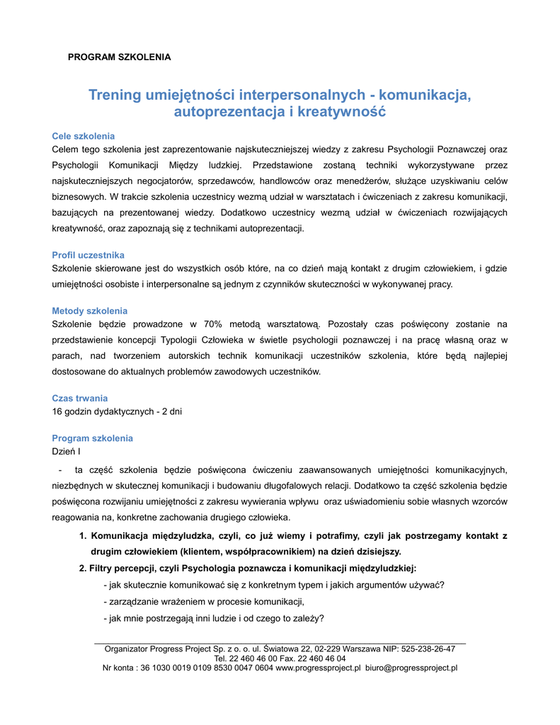 PROGRAM SZKOLENIA Trening umiejętności interpersonalnych - komunikacja, autoprezentacja i kreatywność Cele szkolenia Celem tego szkolenia jest zaprezentowanie najskuteczniejszej wiedzy z zakresu Psychologii Poznawczej oraz Psychologii Komunikacji Między ludzkiej. Przedstawione zostaną techniki wykorzystywane przez najskuteczniejszych negocjatorów, sprzedawców, handlowców oraz menedżerów, służące uzyskiwaniu celów biznesowych. W trakcie szkolenia uczestnicy wezmą udział w warsztatach i ćwiczeniach z zakresu komunikacji, bazujących na prezentowanej wiedzy. Dodatkowo uczestnicy wezmą udział w ćwiczeniach rozwijających kreatywność, oraz zapoznają się z technikami autoprezentacji. Profil uczestnika Szkolenie skierowane jest do wszystkich osób które, na co dzień mają kontakt z drugim człowiekiem, i gdzie umiejętności osobiste i interpersonalne są jednym z czynników skuteczności w wykonywanej pracy. Metody szkolenia Szkolenie będzie prowadzone w 70% metodą warsztatową. Pozostały czas poświęcony zostanie na przedstawienie koncepcji Typologii Człowieka w świetle psychologii poznawczej i na pracę własną oraz w parach, nad tworzeniem autorskich technik komunikacji uczestników szkolenia, które będą najlepiej dostosowane do aktualnych problemów zawodowych uczestników. Czas trwania 16 godzin dydaktycznych - 2 dni Program szkolenia Dzień I - ta część szkolenia będzie poświęcona ćwiczeniu zaawansowanych umiejętności komunikacyjnych, niezbędnych w skutecznej komunikacji i budowaniu długofalowych relacji. Dodatkowo ta część szkolenia będzie poświęcona rozwijaniu umiejętności z zakresu wywierania wpływu oraz uświadomieniu sobie własnych wzorców reagowania na, konkretne zachowania drugiego człowieka. 1. Komunikacja międzyludzka, czyli, co już wiemy i potrafimy, czyli jak postrzegamy kontakt z drugim człowiekiem (klientem, współpracownikiem) na dzień dzisiejszy. 2. Filtry percepcji, czyli Psychologia poznawcza i komunikacji międzyludzkiej: - jak skutecznie komunikować się z konkretnym typem i jakich argumentów używać? - zarządzanie wrażeniem w procesie komunikacji, - jak mnie postrzegają inni ludzie i od czego to zależy? _________________________________________________________________________________ Organizator Progress Project Sp. z o. o. ul. Światowa 22, 02-229 Warszawa NIP: 525-238-26-47 Tel. 22 460 46 00 Fax. 22 460 46 04 Nr konta : 36 1030 0019 0109 8530 0047 0604 www.progressproject.pl [email protected] PROGRAM SZKOLENIA 3. Ćwiczenie " Doradcy pozytywni i negatywni". 4. Satysfakcjonujące relacje z innymi ludźmi, wymagają byśmy mieli wyczucie dla niewypowiedzianych myśli partnera oraz sami uświadomili sobie to, że mamy w głowie mnóstwo myśli, których nie wszystkich jesteśmy świadomi. To ćwiczenie komunikacji uwrażliwia uczestników i stwarza im możliwość zajmowania się niewypowiedzianymi myślami, które zawsze są w tle, gdy rozmawiamy z drugim człowiekiem. 5. Błędy w komunikacji prowadzące najczęściej do sytuacji konfliktowych i sposoby radzenia sobie z nimi. Wykorzystanie tzw. Modelu Miltona, czyli narzędzia służące do prowokowania sytuacji konfliktowych i problematycznych. 6. KWESTIONARIUSZ: Autodiagnoza możliwości komunikacyjnych, czyli sprawdzenie jak "dobry" jestem w komunikacji międzyludzkiej i czy aby na pewno wszyscy mnie dobrze i precyzyjnie rozumieją. 7. W trakcie szkolenia uczestnicy będą mieli możliwość wypełnić Kwestionariusz Autodiagnoza możliwości komunikacyjnych, dzięki czemu uzyskają informację na temat swoich mocnych i wartych rozwinięcia obszarów związanych z komunikacją interpersonalną w kontakcie z klientem. 8. Przedstawienie Typologii Osobowości, w oparciu o Psychologię Poznawczą, badającą mechanizmy odpowiedzialne za style komunikacji międzyludzkiej - Style Sortowania Informacji. 9. Szukający dziury w całym, pesymistycznie nastawiony, wiecznie niezadowolony człowiek: - jaki i o czym myśli taki Typ Człowieka? - wywieranie wpływu i perswazja pod ten Typ Człowieka, - jak się komunikować i budować relacje? 10. Obiecujący przysłowiowe gruszki na wierzbie, lejący wodę i oderwany od rzeczywistości człowiek: - o czym, w jaki sposób, myśli taki Typ Człowieka? - wywieranie wpływu i perswazja pod ten Typ Człowieka, - jak się komunikować i budować relacje? 11. Styl Sortowania Informacji, odpowiedzialny za sposób postrzegania faktów i drugiego człowieka, w procesie komunikacji: - Czteropolowa Matryca Nieświadomego Systemu Ocen, czyli jak zostanę oceniony przez człowieka w momencie, kiedy rozpoznam jego SSI, oraz jak zostanę oceniony, gdy będę się komunikował niezgodnie z rozpoznanym SSI, - zarządzanie Nieświadomym Systemem Ocen, w trakcie procesu komunikacji. 12. Zadufany w sobie, najmądrzejszy w całym "województwie", nieliczący się z opinią innych _________________________________________________________________________________ Organizator Progress Project Sp. z o. o. ul. Światowa 22, 02-229 Warszawa NIP: 525-238-26-47 Tel. 22 460 46 00 Fax. 22 460 46 04 Nr konta : 36 1030 0019 0109 8530 0047 0604 www.progressproject.pl [email protected] PROGRAM SZKOLENIA Człowiek: - sposoby rozkodowywania stylu myślenia Człowieka o powyższych cechach, - wywieranie wpływu i perswazja pod ten Typ Człowieka, - jak się komunikować i budować relacje? 13. Chwiejny niczym chorągiewka na wietrze, bez własnego zdania i opinii, czyli Człowiek, który nie potrafi samodzielnie podjąć żadnej decyzji, bo nie ma pełnomocnictw: - styl myślenia i postrzegania procesu komunikacji, przez ten Typ Człowieka, - jak odróżnić ten styl myślenia od stosowania Techniki negocjacyjnej: "Niepełne pełnomocnictwo"? - jak się komunikować i budować relacje? 14. Styl Sortowania Informacji, odpowiedzialny za sposób podejmowania decyzji, w procesie komunikacji: - Czteropolowa Matryca Nieświadomego Systemu Ocen, czyli j