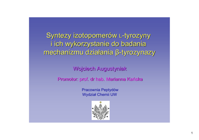 Syntezy izotopomerów L-tyrozyny i ich wykorzystanie do badania mechanizmu działania β-tyrozynazy Wojciech Augustyniak Promotor: prof. dr hab. Marianna Kańska Pracownia Peptydów Wydział Chemii UW 1 Plan Wstęp – ogólna charakterystyka β-tyrozynazy Syntezy L-tyrozyny znakowanej: • węglem 14C w pozycjach 1, 2, 3 i 1’ L-tyrozyny • deuterem i trytem we wszystkich nielabilnych pozycjach L-tyrozyny Badania mechanizmu działania β-tyrozynazy: • mechanizm proponowany w literaturze • wyniki i wnioski z badań kinetycznych efektów izotopowych: wodoru 1H/2H i 1H/3H na kcat/Km, oraz 1H/3H na kcat we wszystkich pozycjach w L-tyrozynie węgla 12C/14C na kcat/Km w pozycjach 2, 3 i 1’ L-tyrozyny • propozycja kinetycznego mechanizmu działania β-tyrozynazy Podsumowanie 2 β-tyrozynaza COOH HO NH2 + O TPL H2O PLP HO + COOH + NH3 podczas reakcji ulega rozerwaniu wiązanie pomiędzy alifatycznym i aromatycznym atomem węgla proton z pozycji α jest częściowo przenoszony na atom węgla 1’ reszty aromatycznej katalizuje także reakcję syntezy L-tyrozyny z pochodnych fenolu i pirogronianu, racemizację alaniny, wymianę atomu wodoru α w kilku L-aminokwasach oraz deaminację atomu węgla α do aktywności katalitycznej konieczne są kationy jednowartościowe (K+, Rb+, Cs+ lub NH4+); jony Na+ i Li+ to inhibitory TPL 3 β-tyrozynaza inaczej: fenololiaza tyrozynowa TPL, E.C. 4.1.99.2. występowanie: Gram-ujemne Enterobacteriaceae i niektóre stawonogi budowa: białko α/β wymiary 135Å x 60Å x 144Å 4 podjednostki po 51kDa symetria P212121 znana struktura krystalograficzna zastosowanie: biotechnologiczne otrzymywanie dopy oznaczanie PLP w materiale biologicznym utylizacja odpadów fenolowych 4 Synteza [1-14C]-L-tyrozyny Cl COONa K 14C N NaOH 14 N C HO COOH 48% 14 C COOH O CHO 82% 14 HO C NH2 O OH OH OH PMO 48% 14 C NH2 O PAL 14 C O 37% 5 Synteza [2-14C]-L-tyrozyny COOH H 14 H C COOH CHO + H 14 85% 44% HO H2 N 14 H C COOH PMO 63% C COOH PAL H2 N 14 H C COOH 6 Synteza [3-14C]-L-tyrozyny O OH 14 C H H 14 YADH C H 22% 14 COOH H HOOC COOH C 63% 5.0% H 14 HO H H C PAL COOH NH2 PMO 28% 14 H C COOH NH2 7 Synteza [1’-14C]-L-tyrozyny O COOEt H214C COOH AgNO3 COOAg H214C 80% COOH EtI COOEt O COOEt 70% H214C 60% COOAg 14 C OH 96% COOH S HO NH2 14 C COOH NH2 COOH H 14 C TPL 12% NaOH 14 Cu C ∆ OH 2.4% OH 8 Syntezy [2-2H]-L-tyrozyny OH + S COOH NH2 COOH D NH2 TPL D2O HO 24% 100% HO Trpaza D2O COOH NH2 9 Syntezy [2-3H]-L-tyrozyny CHO COOH COOH HTO 61% COOH COOH T COOH T 77% 40% PAL COOH T NH2 82% COOH HO NH2 Trpaza HTO HO PMO COOH T NH2 98% 10 Synteza [3R-2H]- i [3R-3H]-L-tyrozyny D COOH PAL D COOH D PMO NH2 COOH HO T T COOH PAL 20% NH2 1.9% T COOH PMO NH2 COOH 95% HO NH2 11 Synteza [3S-2H]- i [3S-3H]-L-tyrozyny D COOH COOH PAL D2O HO NH2 HO 0.46% T COOH COOH PAL HTO HO NH2 HO 5.8% OH 14 C O T PAL HTO OH 14 C NH2 O T PMO 82% OH 14 HO C O NH2 10% 12 Syntezy [2’,6’-3H2]-L-tyrozyny T K2PtCl4 HCl HTO OH 85% T T T T OH T T HCl H2O 79% OH COOH S 10% NH2 TPL T T COOH T NH2 COOH PMO 58% HO T NH2 13 Mechanizm działania β-tyrozynazy - O- -O P O O K257 N O- HO -O P N HO + O COO - - OOC NH + 3 HO O P + N H -OOC O-O P O OH O O + O N COOH NH + -O O O- O-O P O HO O - OOC + N H -O O OH NH + O O P O O -OOC NH + + N H -O + N H O O O NH + + NH3 14 Kinetyczne efekty izotopowe α = vL/vH Metody wyznaczania KIE: niekonkurencyjna (KIE na Vmax i na Vmax/Km) poprzez bezpośrednie pomiary parametrów kinetycznych dla reakcji z obydwoma izotopologami badanego związku o wzbogaceniu bliskim 100%; KIE oblicza się z bezpośredniego porównania Vmax i Vmax/Km dla reakcji z obydwoma izotopologami. Zaleta metody – wyznaczenie KIE na Vmax; wada – duże błędy eksperymentalne konkurencyjna (KIE na Vmax/Km) poprzez pomiary względnej zawartości izotopologów w ich mieszaninie w substratach (R0) i produktach reakcji (Rp); KIE oblicza się z równania Bigeleisena: R ln(1− f ∗ p ) R0 α= ln(1− f) Zaleta metody – duża precyzja; wada – nie można zmierzyć KIE na Vmax 15 Metoda niekonkurencyjna wyznaczania KIE w reakcji katalizowanej przez β-tyrozynazę COOH HO NH2 + H2O 1U/ml TPL 50µM PLP pH 8.3 0.1M KPi 0.2M KCl 1mM DTT O + COOH HO + NH3 20U/ml LDH 0.4mM NADH OH COOH Dodatek NADH i dużego nadmiaru LDH czyni reakcję nieodwracalną i umożliwia bezpośredni pomiar kinetyki poprzez spektrofotometryczny pomiar spadku absorpcji przy 340nm Pomiar szybkości reakcji dla różnych stężeń L-tyrozyny umożliwia wyznaczenie Vmax i Km z równania Michaelisa-Menten v Vmax 0.5 Vmax v= Km Vmax ∗ [S] (K m + [S]) [S] 16 Metoda konkurencyjna wyznaczania KIE w reakcji katalizowanej przez β-tyrozynazę COOH HO NH2 + H2O 1U/ml TPL 50µM PLP O + pH 8.3 0.1M KPi 0.2M KCl 1mM DTT COOH HO + NH3 20U/ml LDH 2eq NADH OH COOH W badaniach stosowałem metodę podwójnego znakowania stosując znacznik 1-14C (podczas określania KIE 1H/3H), oraz 3’,5’-3H2 (KIE 12C/14C) jako standardy wewnętrzne NADH i LDH przekształcają nietrwały pirogronian w trwały L-mleczan Po rozdziale produktów i substratów za pomocą chromatografii jonowymiennej wyznaczałem radioaktywność właściwą wyjściowych substratów (R0), produktów (Rp) i stopień konwersji (f); KIE obliczałem używając równanie Yankwicha-Tonga: ln(1 − f ∗ α= R0 ) Rp ln(1 − f) 17 1H/3H HO KIE w pozycji α Reakcja w H2O COOH H NH2 R0/Rp rośnie podczas reakcji od wartości odpowiadającym odwrotnemu KIE do dużych wartości normalnych R0/Rp nie zależy w prosty sposób od stężeń produktów i substratów reakcji oraz od czasu reakcji Eksperyment 1H-NMR wykazał szybką wymianę protonu α z wodą na początku reakcji Początkowa wymiana trytu z wodą powoduje obniżenie wartości R0/Rp na początku reakcji, i jej wzrost w miarę zachodzenia reakcji eliminacji Mniej niż 1% trytu z pozycji α jest przenoszone na atom węgla 4’ powstającego fenolu 3,00 2,50 2,00 R0/Rp 1,50 1,00 0,50 - 0,10 0,20 0,30 0,40 f Reakcja w D2O 4,00 3,50 3,00 2,50 R0/Rp 2,00 1,5