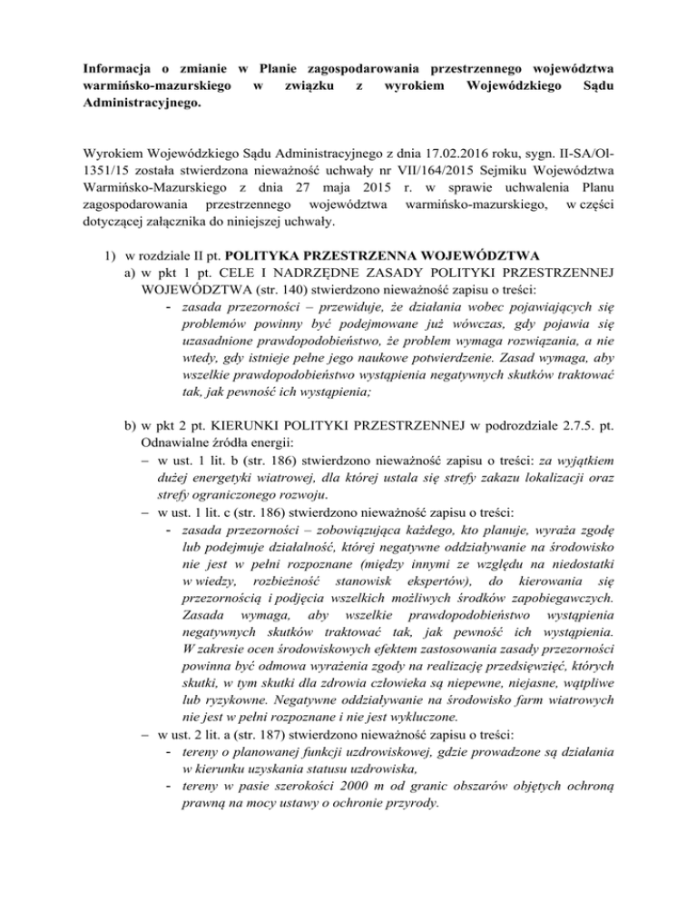 Informacja o zmianie w Planie zagospodarowania przestrzennego województwa warmińsko-mazurskiego w związku z wyrokiem Wojewódzkiego Sądu Administracyjnego. Wyrokiem Wojewódzkiego Sądu Administracyjnego z dnia 17.02.2016 roku, sygn. II-SA/Ol1351/15 została stwierdzona nieważność uchwały nr VII/164/2015 Sejmiku Województwa Warmińsko-Mazurskiego z dnia 27 maja 2015 r. w sprawie uchwalenia Planu zagospodarowania przestrzennego województwa warmińsko-mazurskiego, w części dotyczącej załącznika do niniejszej uchwały. 1) w rozdziale II pt. POLITYKA PRZESTRZENNA WOJEWÓDZTWA a) w pkt 1 pt. CELE I NADRZĘDNE ZASADY POLITYKI PRZESTRZENNEJ WOJEWÓDZTWA (str. 140) stwierdzono nieważność zapisu o treści: - zasada przezorności – przewiduje, że działania wobec pojawiających się problemów powinny być podejmowane już wówczas, gdy pojawia się uzasadnione prawdopodobieństwo, że problem wymaga rozwiązania, a nie wtedy, gdy istnieje pełne jego naukowe potwierdzenie. Zasad wymaga, aby wszelkie prawdopodobieństwo wystąpienia negatywnych skutków traktować tak, jak pewność ich wystąpienia; b) w pkt 2 pt. KIERUNKI POLITYKI PRZESTRZENNEJ w podrozdziale 2.7.5. pt. Odnawialne źródła energii: - w ust. 1 lit. b (str. 186) stwierdzono nieważność zapisu o treści: za wyjątkiem dużej energetyki wiatrowej, dla której ustala się strefy zakazu lokalizacji oraz strefy ograniczonego rozwoju. - w ust. 1 lit. c (str. 186) stwierdzono nieważność zapisu o treści: - zasada przezorności – zobowiązująca każdego, kto planuje, wyraża zgodę lub podejmuje działalność, której negatywne oddziaływanie na środowisko nie jest w pełni rozpoznane (między innymi ze względu na niedostatki w wiedzy, rozbieżność stanowisk ekspertów), do kierowania się przezornością i podjęcia wszelkich możliwych środków zapobiegawczych. Zasada wymaga, aby wszelkie prawdopodobieństwo wystąpienia negatywnych skutków traktować tak, jak pewność ich wystąpienia. W zakresie ocen środowiskowych efektem zastosowania zasady przezorności powinna być odmowa wyrażenia zgody na realizację przedsięwzięć, których skutki, w tym skutki dla zdrowia człowieka są niepewne, niejasne, wątpliwe lub ryzykowne. Negatywne oddziaływanie na środowisko farm wiatrowych nie jest w pełni rozpoznane i nie jest wykluczone. - w ust. 2 lit. a (str. 187) stwierdzono nieważność zapisu o treści: - tereny o planowanej funkcji uzdrowiskowej, gdzie prowadzone są działania w kierunku uzyskania statusu uzdrowiska, - tereny w pasie szerokości 2000 m od granic obszarów objętych ochroną prawną na mocy ustawy o ochronie przyrody. - w ust. 2 lit. b (str. 140) stwierdzono nieważność zapisu o treści: Ustala się strefę rozwoju dużej energetyki wiatrowej z ograniczeniami (Strefa B). Strefa B obejmuje pozostałe obszary województwa (nie zaliczone do Strefy A). W Strefie B ustala się: - zakaz lokalizowania dużej energetyki wiatrowej w odległości do 2000 m od zabudowy mieszkaniowej (istniejącej i wyznaczonej w obowiązujących miejscowych planach zagospodarowania przestrzennego), - zakaz lokalizowania farm wiatrowych* w odległości od siebie mniejszej niż 5 km (liczonej od skrajnych turbin w farmach) – ze względu na konieczność osłabienia skumulowanego oddziaływania na przestrzeń, - zakaz lokalizowania turbin wiatrowych w obrębie farmy w odległości większej niż 2 km pomiędzy turbinami – ze względu na zapobieganie zjawisku "rozlewania się" farm w przestrzeni. Ponadto obowiązują ograniczenia i zakazy lokalizowania dużej energetyki wiatrowej wynikające z odpowiednich przepisów odrębnych. 2) Stwierdzono nieważność mapy nr 50 pt. Strefy rozwoju dużej energetyki wiatrowej (str. 275). Zmiany weszły w życie z dniem 11.04.2016 roku.