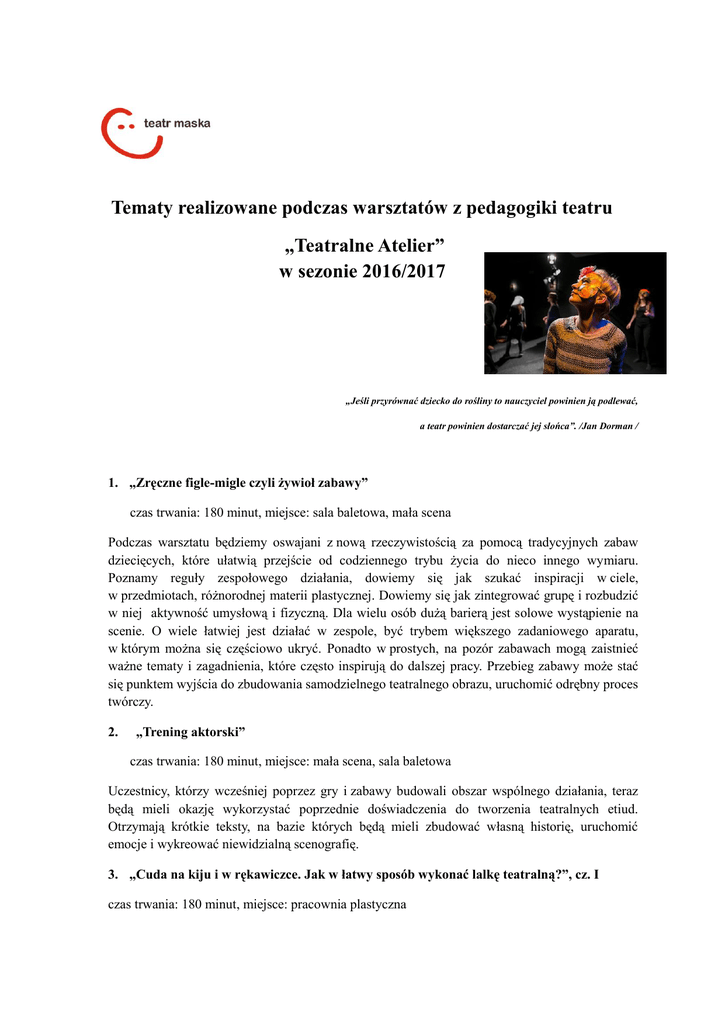 Tematy realizowane podczas warsztatów z pedagogiki teatru „Teatralne Atelier” w sezonie 2016/2017 „Jeśli przyrównać dziecko do rośliny to nauczyciel powinien ją podlewać, a teatr powinien dostarczać jej słońca”. /Jan Dorman / 1. „Zręczne figle-migle czyli żywioł zabawy” czas trwania: 180 minut, miejsce: sala baletowa, mała scena Podczas warsztatu będziemy oswajani z nową rzeczywistością za pomocą tradycyjnych zabaw dziecięcych, które ułatwią przejście od codziennego trybu życia do nieco innego wymiaru. Poznamy reguły zespołowego działania, dowiemy się jak szukać inspiracji w ciele, w przedmiotach, różnorodnej materii plastycznej. Dowiemy się jak zintegrować grupę i rozbudzić w niej aktywność umysłową i fizyczną. Dla wielu osób dużą barierą jest solowe wystąpienie na scenie. O wiele łatwiej jest działać w zespole, być trybem większego zadaniowego aparatu, w którym można się częściowo ukryć. Ponadto w prostych, na pozór zabawach mogą zaistnieć ważne tematy i zagadnienia, które często inspirują do dalszej pracy. Przebieg zabawy może stać się punktem wyjścia do zbudowania samodzielnego teatralnego obrazu, uruchomić odrębny proces twórczy. 2. „Trening aktorski” czas trwania: 180 minut, miejsce: mała scena, sala baletowa Uczestnicy, którzy wcześniej poprzez gry i zabawy budowali obszar wspólnego działania, teraz będą mieli okazję wykorzystać poprzednie doświadczenia do tworzenia teatralnych etiud. Otrzymają krótkie teksty, na bazie których będą mieli zbudować własną historię, uruchomić emocje i wykreować niewidzialną scenografię. 3. „Cuda na kiju i w rękawiczce. Jak w łatwy sposób wykonać lalkę teatralną?”, cz. I czas trwania: 180 minut, miejsce: pracownia plastyczna Zajęcia mają na celu poszukiwanie świeżego, odkrywczego pomysłu na stworzenie kukły lub pacynki, które świetnie sprawdzają się w pracy z dziećmi. Celem warsztatu jest zapoznanie z podstawowymi rodzajami lalek teatralnych, ze sposobami ich wykonywania oraz przedstawienie kilku prostych, dostosowanych do możliwości dzieci pomysłów na stworzenie lalki teatralnej. Warsztat obejmuje wszystkie etapy tworzenia lalki teatralnej od wykonania samodzielnego projektu poprzez zapoznanie się z materiałami, z których najczęściej wykonuje się profesjonalne lalki oraz technikami plastycznymi najczęściej stosowanymi przy ich tworzeniu, po samodzielne wykonanie lalki. 4. „Jak okiełznać lalkę?” cz. I. Animacja kukły, pacynki i marionetki”, cz. I czas trwania: 180 minut, miejsce: Muzeum Lalek Teatralnych Uczestnicy zajęć poznają tajniki trudnej sztuki animacji kukły, marionetki i pacynki. 5. „W krainie Madame Butafory”, czas trwania: czas trwania: 360 minut (2 spotkania), miejsce: pracownia plastyczna Podczas warsztatu poznamy etapy budowania maski teatralnej. 6. „Ciało eteryczne i ciało realne. Technika improwizacji” czas trwania: 360 minut (2 spotkania), miejsce: sala baletowa lub mała scena Zajęcia budowane wokół takich zagadnień jak akcja-reakcja, sprzężenie zwrotne pomiędzy działającymi podmiotami, wspólne bycie w działaniu. 7. „Scenografia okolicznościowa” czas trwania: 180 minut, miejsce: pracownia plastyczna Warsztat będzie poświęcony poszukiwaniu rozwiązań na aranżację przestrzeni działań artystycznych. 8. “Kostium haute couture” czas trwania: czas trwania: 180 minut, miejsce: pracownia plastyczna Podczas warsztatu uczestnicy przekonają się jak zwykły papier i pianka tapicerska mogą zaczarować sceniczną rzeczywistość. 9. „Cuda na kiju i w rękawiczce. Jak w łatwy sposób wykonać lalkę teatralną?”, cz. II. Projektowanie i wykonanie lalki cieniowej. czas trwania: 180 minut, miejsce: pracownia plastyczna 10. „Jak okiełznać lalkę?” cz. II. Animacja lalek cieniowych” czas trwania: 180 minut, miejsce: Muzeum Lalek Teatralnych 11. „Mówię świadomie czyli BHP głosu” czas trwania: 180 minut, miejsce: mała scena lub sala baletowa Zajęcia poświęcone prawidłowej eksploatacji narządu mowy. 12. „Mówię prozą, nie mając o tym żywego pojęcia!” czas trwania: 180 minut, miejsce: mała scena lub sala baletowa Zajęcia poświęcone będą interpretacji utworów prozatorskich. 13. „Teatralna fonosfera lub muzyczne czary-mary” czas trwania: 180 minut, mała scena lub sala baletowa Zajęcia pomogą zrozumieć w jaki sposób, muzyka może budować nastrój, prowadzić narrację i wyznaczać rytm spektaklu. 14. „Błyskotliwie i z gestem” czas trwania: 180 minut, sala baletowa Jak przygotować dzieci do zainscenizowania wiersza? 15. „Jak przygotować scenariusz czyli puzzle na 1000 kawałków” czas trwania: 180 minut, miejsce: sala baletowa, mała scena Zajęcia poświęcone są pracy nad scenariuszem. Jak przekształcić wiersz czy ludowe podanie w utwór sceniczny? Według jakich prawideł zbudować scenariusz teatralny? 16. „Reżyseria w teatrze amatorskim” czas trwania: 180 minut, miejsce: sala baletowa, mała scena Zajęcia poświęcone będą sekretom reżyserii, pracy na linii reżyser-aktor. Warsztat rozwija umiejętności nauczyciela/instruktora w zakresie reżyserii przedstawień teatralnych w szkole. Nie wystarczy sobie wyobrazić, co aktor ma zagrać, trzeba to jeszcze umiejętnie mu przekazać i pomóc wypracować na scenie.