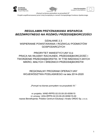 „Pomysł na biznes pomysłem na przyszłość III” Projekt wspófinansowany przez Unię Europejską w ramach Europejskiego Funduszu Społecznego REGULAMIN PRZYZNAWANIA WSPARCIA BEZZWROTNEGO NA ROZWÓJ PRZEDSIĘBIORCZOŚCI DZIAŁANIE 2.3 WSPIERANIE POWSTAWANIA I ROZWOJU PODMIOTÓW GOSPODARCZYCH PRIORYTET INWESTYCYJNY 8.iii PRACA NA WŁASNY RACHUNEK, PRZEDSIĘBIORCZOŚĆ I TWORZENIE PRZEDSIĘBIORSTW, W TYM INNOWACYJNYCH MIKRO, MAŁYCH I ŚREDNICH PRZEDSIĘBIORSTW REGIONALNY PROGRAM OPERACYJNY WOJEWÓDZTWA PODLASKIEGO na lata 2014-2020 „Pomysł na biznes pomysłem na przyszłość III.” nr projektu: WND-RPPD.02.03.00-20-0056/15 nr umowy: UDA-RPPD.02.03.00-20-0056/15-00 nazwa Beneficjenta: Polskie Centrum Edukacji i Analiz ORDO Sp. z o.o. 1 „Pomysł na biznes pomysłem na przyszłość III” Projekt wspófinansowany przez Unię Europejską w ramach Europejskiego Funduszu Społecznego §1 Postanowienia ogólne 1. Niniejszy Regulamin określa szczegółowe zasady udzielania wsparcia w postaci szkoleń, dotacji inwestycyjnej, wsparcia pomostowego (finansowego oraz specjalistycznego wsparcia towarzyszącego) oraz forum wymiany doświadczeń osobom, które zamierzają rozpocząć własną działalność gospodarczą w ramach projektu „Pomysł na biznes pomysłem na przyszłość III”. 2. Celem projektu jest przygotowanie 40 uczestników projektu do rozpoczęcia i prowadzenia własnej działalności gospodarczej poprzez udział w szkoleniach oraz przekazanie dotacji inwestycyjnej i wsparcia pomostowego (finansowego oraz specjalistycznego wsparcia towarzyszącego), a także wsparcia w postaci forum wymiany doświadczeń. 3. Projekt realizowany jest od 1 listopada 2016 roku do 31 sierpnia 2018 roku na terenie subregionu Łomżyńskiego: na obszarze m. Łomży, powiatu łomżyńskiego, powiatu kolneńskiego, powiatu wysokomazowieckiego, powiatu zambrowskiego, powiatu grajewskiego, gminy Tykocin (powiat białostocki) oraz gminy Zawady (powiat białostocki). 4. Regulamin podawany jest do publicznej wiadomości na stronie internetowej www.ordo.info.pl co najmniej na 10 dni roboczych przed dniem rozpoczęcia rekrutacji do projektu. §2 Warunki uczestnictwa w projekcie Uczestnik projektu zobowiązany jest do: a) wypełniania obowiązków wynikających z Umów zawartych z Beneficjentem; b) pełnego uczestniczenia w zajęciach; c) wypełniania ankiet związanych z realizacją projektu, monitoringiem i ewaluacją; d) współpracy z Beneficjentem; e) dostarczania wszelkich niezbędnych dokumentów żądanych przez Beneficjenta. §3 Etap szkoleniowy Realizowane szkolenia mają zapewnić uczestnikom projektu odpowiednie przygotowanie merytoryczne do prowadzenia działalności gospodarczej. 2. W ramach projektu przewidziano: a) szkolenie „ABC przedsiębiorczości” liczące 34h/UP Aspekty ekonomiczno – prawne prowadzenia działalności gospodarczej– 20h Sprzedaż jako kluczowy aspekt działalności firmy – 6h Podstawy marketingu – 8h b) indywidualne doradztwo biznesowe – 6h/1 UP 3. Harmonogram szkoleń zostanie podany na stronie internetowej projektu www.ordo.info.pl 1. 2 „Pomysł na biznes pomysłem na przyszłość III” Projekt wspófinansowany przez Unię Europejską w ramach Europejskiego Funduszu Społecznego Wsparcie szkoleniowe realizowane jest na podstawie Umowy o świadczenie usług szkoleniowo - doradczych (której wzór stanowi załącznik nr 8 do niniejszego Regulaminu), 5. Szkolenia będą realizowane w okresie od kwietnia 2017 r. do czerwca 2017 r. Szkolenia realizowane będą w dwóch grupach, w weekendy 5 dni x 7 godzin, w godzinach od 9:00 do 16:00. Indywidualne doradztwo biznesowe realizowane będzie w okresie od kwietnia 2017 r. do czerwca 2017 r. w wymiarze 6h na każdego uczestnika projektu. Zakres szkoleń obejmuje zagadnienia związane z: aspektem ekonomiczno – prawnym prowadzenia działalności (20h), sprzedażą (6h) oraz marketingiem (8h). 6. Indywidualne doradztwo biznesowe posłuży opracowaniu przez uczestników projektu we współpracy z doradcą biznes planów będących podstawa planowanej inwestycji. Etap szkoleniowy zakończy się wydaniem przez Beneficjenta uczestnikom projektu zaświadczeń potwierdzających uczestnictwo w szkoleniach. Uzyskanie zaświadczenia jest warunkiem niezbędnym do ubiegania się o środki finansowe na rozwój przedsiębiorczości (dotację inwestycyjna oraz wsparcie pomostowe). 7. Dopuszcza się możliwość zwolnienia uczestnika projektu z obowiązku uczestniczenia w szkoleniu „ABC przedsiębiorczości” w sytuacji gdy: uczestnik projektu ukończył wsparcie szkoleniowe lub szkoleniowo – doradcze realizowane w innych projektach np. projektach realizowanych ze środków Europejskiego Funduszu Społecznego w ramach Programu Operacyjnego Kapitał Ludzki (m.in. Działania 6.2, 7.2.2, 8.1.2) lub uczestnik projektu posiada odpowiednią wiedzę i umiejętności do prowadzenia działalności gospodarczej, Decyzja o zwolnieniu uczestnika z udziału w szkoleniu na podstawie zaświadczenia lub innego dokumentu potwierdzającego stan faktyczny należy do Beneficjenta. Dokumentami, na podstawie których uczestnik może być zwolniony z udziału w bloku szkoleniowym są: certyfikat/zaświadczenie potwierdzające ukończenie szkoleń lub otrzymania wsparcia szkoleniowo – doradczego w zakresie prowadzenia działalności gospodarczej oświadczenia uczestnika projektu Nie ma możliwości zwolnienia z doradztwa biznesowego, które jest obowiązkowe dla wszystkich uczestników projektu. 8. Uczestnik projektu zostaje wykluczony z uczestnictwa w projekcie, gdy: opuści więcej niż 20 % godzin szkoleniowych; złoży poświadczające nieprawdę oświadczenia w formularzu rekrutacyjnym. 9. Uczestnicy projektu są zobowiązani do uczestnictwa w szkoleniach, podpisywania listy obecności na zajęciach szkoleniowych oraz innych stosownych dokumentów. 10. Na żądanie Beneficjenta uczestnicy projektu zobowiązani są do dostarczenia wsz