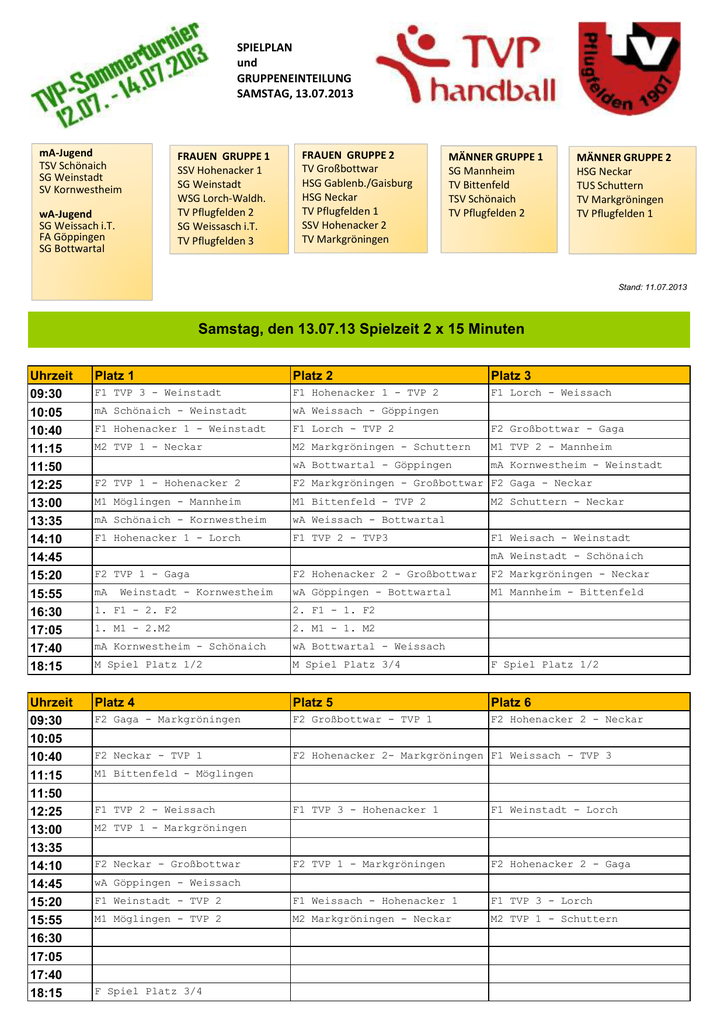 SPIELPLAN und GRUPPENEINTEILUNG SAMSTAG, 13.07.2013 mA-Jugend TSV Schönaich SG Weinstadt SV Kornwestheim wA-Jugend SG Weissach i.T. FA Göppingen SG Bottwartal FRAUEN GRUPPE 1 SSV Hohenacker 1 SG Weinstadt WSG Lorch-Waldh. TV Pflugfelden 2 SG Weissasch i.T. TV Pflugfelden 3 FRAUEN GRUPPE 2 TV Großbottwar HSG Gablenb./Gaisburg HSG Neckar TV Pflugfelden 1 SSV Hohenacker 2 TV Markgröningen MÄNNER GRUPPE 1 SG Mannheim TV Bittenfeld TSV Schönaich TV Pflugfelden 2 MÄNNER GRUPPE 2 HSG Neckar TUS Schuttern TV Markgröningen TV Pflugfelden 1 Stand: 11.07.2013 Samstag, den 13.07.13 Spielzeit 2 x 15 Minuten Uhrzeit 09:30 10:05 10:40 11:15 11:50 12:25 13:00 13:35 14:10 14:45 15:20 15:55 16:30 17:05 17:40 18:15 Uhrzeit 09:30 10:05 10:40 11:15 11:50 12:25 13:00 13:35 14:10 14:45 15:20 15:55 16:30 17:05 17:40 18:15 Platz 1 Platz 2 Platz 3 F1 TVP 3 - Weinstadt F1 Hohenacker 1 - TVP 2 F1 Lorch - Weissach mA Schönaich - Weinstadt wA Weissach - Göppingen F1 Hohenacker 1 - Weinstadt F1 Lorch - TVP 2 F2 Großbottwar - Gaga M2 TVP 1 - Neckar M2 Markgröningen - Schuttern M1 TVP 2 - Mannheim wA Bottwartal - Göppingen mA Kornwestheim - Weinstadt F2 TVP 1 - Hohenacker 2 F2 Markgröningen - Großbottwar F2 Gaga - Neckar M1 Möglingen - Mannheim M1 Bittenfeld - TVP 2 mA Schönaich - Kornwestheim wA Weissach - Bottwartal F1 Hohenacker 1 - Lorch F1 TVP 2 - TVP3 F1 Weisach - Weinstadt F2 TVP 1 - Gaga F2 Hohenacker 2 - Großbottwar F2 Markgröningen - Neckar mA wA Göppingen - Bottwartal M1 Mannheim - Bittenfeld M2 Schuttern - Neckar mA Weinstadt - Schönaich Weinstadt - Kornwestheim 1. F1 - 2. F2 2. F1 - 1. F2 1. M1 - 2.M2 2. M1 - 1. M2 mA Kornwestheim - Schönaich wA Bottwartal - Weissach M Spiel Platz 1/2 M Spiel Platz 3/4 F Spiel Platz 1/2 Platz 4 Platz 5 Platz 6 F2 Gaga - Markgröningen F2 Großbottwar - TVP 1 F2 Hohenacker 2 - Neckar F2 Neckar - TVP 1 F2 Hohenacker 2- Markgröningen F1 Weissach - TVP 3 M1 Bittenfeld - Möglingen F1 TVP 2 - Weissach F1 TVP 3 - Hohenacker 1 F1 Weinstadt - Lorch F2 TVP 1 - Markgröningen F2 Hohenacker 2 - Gaga F1 Weinstadt - TVP 2 F1 Weissach - Hohenacker 1 F1 TVP 3 - Lorch M1 Möglingen - TVP 2 M2 Markgröningen - Neckar M2 TVP 1 - Schuttern M2 TVP 1 - Markgröningen F2 Neckar - Großbottwar wA Göppingen - Weissach F Spiel Platz 3/4
