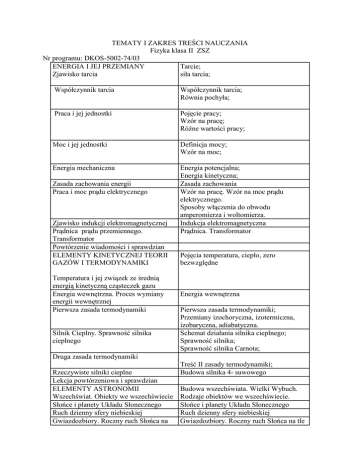 TEMATY I ZAKRES TREŚCI NAUCZANIA Fizyka klasa II ZSZ Nr programu: DKOS-5002-74/03 ENERGIA I JEJ PRZEMIANY Tarcie; Zjawisko tarcia siła tarcia; Współczynnik tarcia Współczynnik tarcia; Równia pochyła; Praca i jej jednostki Pojęcie pracy; Wzór na pracę; Różne wartości pracy; Moc i jej jednostki Definicja mocy; Wzór na moc; Energia mechaniczna Energia potencjalna; Energia kinetyczna; Zasada zachowania Wzór na pracę. Wzór na moc prądu elektrycznego. Sposoby włączenia do obwodu amperomierza i woltomierza. Indukcja elektromagnetyczna Prądnica. Transformator Zasada zachowania energii Praca i moc prądu elektrycznego Zjawisko indukcji elektromagnetycznej Prądnica prądu przemiennego. Transformator Powtórzenie wiadomości i sprawdzian ELEMENTY KINETYCZNEJ TEORII GAZÓW I TERMODYNAMIKI Temperatura i jej związek ze średnią energią kinetyczną cząsteczek gazu Energia wewnętrzna. Proces wymiany energii wewnętrznej Pierwsza zasada termodynamiki Silnik Cieplny. Sprawność silnika cieplnego Pojęcia temperatura, ciepło, zero bezwzględne Energia wewnętrzna Pierwsza zasada termodynamiki; Przemiany izochoryczna, izotermiczna, izobaryczna, adiabatyczna. Schemat działania silnika cieplnego; Sprawność silnika; Sprawność silnika Carnota; Druga zasada termodynamiki Rzeczywiste silniki cieplne Lekcja powtórzeniowa i sprawdzian ELEMENTY ASTRONOMII Wszechświat. Obiekty we wszechświecie Słońce i planety Układu Słonecznego Ruch dzienny sfery niebieskiej Gwiazdozbiory. Roczny ruch Słońca na Treść II zasady termodynamiki; Budowa silnika 4- suwowego Budowa wszechświata. Wielki Wybuch. Rodzaje obiektów we wszechświecie. Słońce i planety Układu Słonecznego Ruch dzienny sfery niebieskiej Gwiazdozbiory. Roczny ruch Słońca na tle tle gwiazdozbiorów Lekcja powtórzeniowa i sprawdzian gwiazdozbiorów