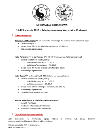 INFORMACJA DODATKOWA 11-12 kwietnia 2015 r. Międzynarodowy Warsztat w Krakowie 1. Zakwaterowanie Pensjonat TRANS-expres ** ul. Montwiłła Mireckiego 7b, Kraków, www.pensjonat.biz.pl cena za dobę 50 zł pieszo około 20-25 min od miejsca warsztatu (ok. 800 m) liczba miejsc ograniczona Hotel Panorama** ul. Lipińskiego 3/9, 30-409 Kraków, www.hotel-panorama.pl cena ze śniadaniem (osoba/doba): o pokój jednoosobowy – 121,30 zł o pokój dwu/trzyosobowy – 71,60 zł pieszo około 3-5min od miejsca warsztatu (ok. 100m) liczba miejsc ograniczona Hotel Ruczaj*** ul. Ruczaj 44, 30-409 Kraków, www.ruczaj.hotel.pl cena ze śniadaniem (osoba/doba): o pokój jednoosobowy – 115,00 zł o pokój dwuosobowy – 80,00 zł pieszo około 10min od miejsca warsztatu (ok. 300 m) liczba miejsc ograniczona cena obejmuje: parking, internet Miejsce na podłodze w szkole (w miejscu warsztatu) cena 10 PLN/doba niezbędny własny śpiwór i karimata możliwość noclegu tylko do niedzieli 2. Dojazd do miejsca warsztatu Jeśli zaznaczono w formularzu opcję odbioru o pomoc w zidentyfikowaniu (dobrze widoczne logo). Miejsce warsztatu: ZSOI ul. Strąkowa 3A GPS: 50.026697,19.92377 z lotniska lub stacji, prosimy a) Samochodem Trasa od Ronda Grunwaldzkiego (trasa od Warszawy) kieruj się w kierunku Monte Casino. Następnie Kieruj się na ulicę Kapelanka (skręt w prawo obok „okrąglaka”) => 1,1 km. Przed TESCO skręć w prawo w ul. Kobierzyńską. Jedź 850 m. Następnie skręć w lewo w Zygmunta Miłkowskiego i jedź do końca drogi ok. 400 m. MAPA 1 Trasa od Nowej Huty przez ulicę Księdza Józefa Tishnera na skrzyżowaniu z ul. Wadowicka – Zakopiańska kieruj się prosto (po prawej stronie zaraz za skrzyżowaniem będzie pętla tramwajowo – autobusowa). Jedź ok. 800 m do dużego skrzyżowania (po prawej stronie TESCO). Jedź prosto ul. GrotaRoweckiego 350 m do następnych świateł i skręć w lewo w ul. Kobierzyńską => 350 m. Następnie skręć w lewo w Zygmunta Miłkowskiego i jedź do końca drogi ok. 400 m. MAPA 2 Trasa od autostrady zjazd opisany Oświęcim. Po zjeździe z obwodnicy skręcić w lewo i jechać cały czas główną drogą 5,9 km (ul. Skotnicka, Karola Bunscha i Michała Bobrzyńskiego, Grota-Roweckiego). Na światłach przy stacji benzynowej Orlen skręć w prawo w ul. Rostworowskiego => 230m., skręć w lewo w ul. Kobierzyńską => 250m. Następnie skręć w prawo w ul. Zygmunta Miłkowskiego i jedź do końca drogi ok. 400 m. MAPA 3 b) Komunikacja miejska – tramwaj i autobus Jeżeli w zgłoszeniu zaznaczyłeś, że potrzebujesz pomocy punkt spotkań jest na nowym podziemnym dworcu przy kasach. Tam będzie czekała na Ciebie osoba mająca koszulkę STTC lub logo na dużej kartce. Jeżeli zaplanowałeś dojazd samodzielnie: Bilety autobus/tramwaj: jednoprzejazdowy lub 40 min => 3,80 zł 60 minutowy => 5,00 zł Można kupić w automatach na przystankach lub w tramwaju/autobusie. Jeżeli nie ma automatu na przystanku ani w autobusie można bilet kupić u kierowcy. Trzeba mieć odliczoną kwotę. Przystanek wysiadania: Lipińskiego Linie tramwajowe i autobusowe: tramwaje: 11,18,52,23,70 autobusy: 194, 178, 106, 166 Dojazd z Dworca Głównego - wsiąść w tramwaj 52. Jedź 10 przystanków i wysiądź na przystanku Lipińskiego (następny za TESCO). Po przejściu na drugą stronę ulicy trzeba się kierować w kierunku Hotelu Panorama. Aby wejść na teren szkoły trzeba wejść pomiędzy bloki mijając po lewej stronie Hotel Panorama. Pomiędzy blokami jest wejście na teren szkoły (na ogrodzeniu jest przyczepione logo Stowarzyszenia. Przejść wzdłuż budynków szkoły do wejścia głównego. MAPA 4 Dojazd z Lotniska - autobus: 292, 208. Jedź do końca trasy – ostatni przystanek Dworzec Główny Wschód. Wysiadając z autobusu 292 lub 208 należy kierować się w stronę Galerii Krakowskiej (GK), a następnie skręcić w prawo w ulicę Pawią i iść wzdłuż GK. Zaraz za GK jest Hotel, który trzeba minąć i dojść do przystanku tramwajowego nie schodząc w dół do przejścia podziemnego. Wsiąść w tramwaj 52. Jedź 10 przystanków i wysiądź na przystanku Lipińskiego (następny za TESCO). Po przejściu na drugą stronę ulicy trzeba się kierować w kierunku Hotelu Panorama. Aby wejść na teren szkoły trzeba wejść pomiędzy bloki mijając po lewej stronie Hotel Panorama. Pomiędzy blokami jest wejście na teren szkoły (na ogrodzeniu jest przyczepione logo Stowarzyszenia. Przejść wzdłuż budynków szkoły do wejścia głównego. MAPA 4 3. Zmiany w informacjach nadesłanych w zgłoszeniu – jeśli takie nastąpiły, prosimy o niezwłocznie poinformowanie nas o tym. W szczególności prosimy o upewnienie się, czy podany telefon kontaktowy jest poprawny. MAPA 1 Dojazd od Ronda Grunwaldzkiego MAPA 2 Dojazd od ul. Brożka MAPA 3 Dojazd od obwodnicy Krakowa i autostrady MAPA 4 Dojście do szkoły od komunikacji miejskiej/ Dojście do szkoły z Hotelu Panorama MAPA 5 Dojście z Hotelu TRuczaj MAPA 6 Dojście z Hotelu Trans Express