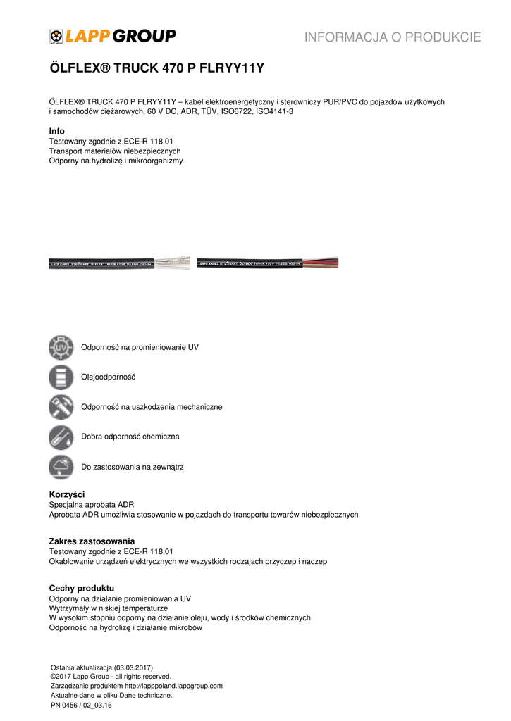 INFORMACJA O PRODUKCIE ÖLFLEX® TRUCK 470 P FLRYY11Y ÖLFLEX® TRUCK 470 P FLRYY11Y – kabel elektroenergetyczny i sterowniczy PUR/PVC do pojazdów użytkowych i samochodów ciężarowych, 60 V DC, ADR, TÜV, ISO6722, ISO4141-3 Info Testowany zgodnie z ECE-R 118.01 Transport materiałów niebezpiecznych Odporny na hydrolizę i mikroorganizmy Odporność na promieniowanie UV Olejoodporność Odporność na uszkodzenia mechaniczne Dobra odporność chemiczna Do zastosowania na zewnątrz Korzyści Specjalna aprobata ADR Aprobata ADR umożliwia stosowanie w pojazdach do transportu towarów niebezpiecznych Zakres zastosowania Testowany zgodnie z ECE-R 118.01 Okablowanie urządzeń elektrycznych we wszystkich rodzajach przyczep i naczep Cechy produktu Odporny na działanie promieniowania UV Wytrzymały w niskiej temperaturze W wysokim stopniu odporny na działanie oleju, wody i środków chemicznych Odporność na hydrolizę i działanie mikrobów Ostania aktualizacja (03.03.2017) ©2017 Lapp Group - all rights reserved. Zarządzanie produktem http://lapppoland.lappgroup.com Aktualne dane w pliku Dane techniczne. PN 0456 / 02_03.16 INFORMACJA O PRODUKCIE ÖLFLEX® TRUCK 470 P FLRYY11Y Normy i aprobaty ISO 4141 i DIN/ISO 6722 Budowa produktu Linka z cienkich drucików z czystej miedzi Izolacja żyły: na bazie PVC Płaszcz wewnętrzny na bazie specjalnego PVC Płaszcz zewnętrzny ze specjalnego poliuretanu Dane techniczne Klasyfikacja: ETIM 5.0 Class-ID: EC000104 Opis klasy ETIM 5.0: Przewód sterowniczy Oznaczenie żył: ISO 4141-3 Pojemność par transmisji danych: Związana z odległościami pomiędzy żyłami, maks. 50 pF/m i pomiędzy każdą żyłą do transmisji danych, a każdą inną żyłą w przewodzie maks. 100 pF/m Budowa żyły: Z cienkich drucików według DIN/ISO 6722 Minimalny promień gięcia: 12 x średnica zewnętrzna Napięcie nominalne: 60 V Napięcie próbne: 5 kV wartość skuteczna min. 5 min Zakres temperatury: Połączenia nieruchome: od -40°C do +85°C Obszar zastosowania Klasa A Wskazówka Wszystkie podane wartości dotyczące produktów są wartościami nominalnymi (o ile nie wskazano inaczej). Inne wartości, takie jak np. tolerancje mogą być przedstawione na zamówienie (jeżeli są dostępne i przeznaczone do publikacji). Standardowe odcinki proszę sprawdzić na: www.lapppolska.pl Rodzaj opakowania: krążek ≤ 30 kg lub ≤ 250 m, w przeciwnym razie bęben Prosimy określić wielkość opakowania (np. 1 x 500 m bęben lub 5 x 100 m krążek) Fotografie nie mogą być używane do wymiarowania oraz nie stanowią szczegółowego odwzorowania przedstawionych produktów. * Podane ceny to ceny netto bez podatku VAT i dodatkowych opłat. Sprzedaż klientom biznesowym. Ostania aktualizacja (03.03.2017) ©2017 Lapp Group - all rights reserved. Zarządzanie produktem http://lapppoland.lappgroup.com Aktualne dane w pliku Dane techniczne. PN 0456 / 02_03.16 Powered by TCPDF (www.tcpdf.org) Liczba żył i przekrój [mm²] Średnica zewnętrzna [mm] Kolor Indeks miedzi [kg/km] Waga [kg/km] ÖLFLEX® TRUCK 470 P FLRYY11Y 2 x 1,0 6 biały/czarny 19,2 55 7027081 2 x 1,0 6 biały/brązowy 19,2 55 7027020 2 x 1,5 6,6 biały/czarny 28,8 68 7027021 2 x 1,5 6,6 biały/brązowy 28,8 68 7027082 3 x 1,0 6,3 czarny/brązowy/niebieski 28,8 67 7027022 3 x 1,0 6,3 biały/brązowy/niebieski; najnowsze wykonanie według ISO 28,8 67 7027083 4 x 1,0 6,8 biały/czarny/czerwony/brązo wy 38,4 81 7027038 4 x 1,5 7,5 biały/czarny/czerwony/brązo wy 57,6 106 7027084 5 x 1,0 7,5 biały/brązowy/zielony/czerwo 48 ny/szary 97 7027085 5 x 1,0 + 1 x 2,5 9 1,0 = zielony/brązowy/czerw ony/niebieski/fioletowy 2,5 = biały 72 133 7027086 5 x 1,0 + 1 x 2,5 9 1,0 = żółty/czarny/czerwony/ 72 niebieski/fioletowy 2,5 = biały 133 7027025 5 x 1,0 + 1 x 2,5 9 1,0 = brązowy/zielony/czerw ony/szary/fioletowy 2,5 = biały; najnowsze wykonanie według ISO 133 7027087 6 x 1,5 + 1 x 2,5 10,3 ISO 4141 1,5 = czarny żółty/ 110,4 czerwony/zielony/brązowy/ni ebieski 2,5 = biały 187 7027130 7 x 0,75 7,3 biały/czarny/żółty/czerwony/z 50,4 ielony/brązowy/niebieski 101 7027088 7 x 1,5 8,9 biały/czarny/żółty/czerwony/z 100,8 ielony/brązowy/niebieski 166 7027089 8 x 1,5 + 1 x 2,5 11,7 ISO 4141 + szary/ fioletowy 139,2 239 7027090 10x1,5+3x2,5+1x(2x1,5) 14,4 biały z czarnymi numerami; 1,5 = numery 1–3, 5–8, 10–12; 2,5 = numery 4, 9, 13; 1,5 = numery 14, 15 244,8 391 7027030 10x1,5+3x2,5+1x(2x1,5) 14,4 ISO 12098 244,8 395 7027091 10x1,5+3x2,5 14,4 biały z czarnymi numerami; 216 1,5 = numery 1–3, 5–8, 10–12; 2,5 = numery 4, 9, 13 72 367 INFORMACJA O PRODUKCIE 7027080 ÖLFLEX® TRUCK 470 P FLRYY11Y Ostania aktualizacja (03.03.2017) ©2017 Lapp Group - all rights reserved. Zarządzanie produktem http://lapppoland.lappgroup.com Aktualne dane w pliku Dane techniczne. PN 0456 / 02_03.16 Numer katalogowy Powered by TCPDF (www.tcpdf.org) Liczba żył i przekrój [mm²] Średnica zewnętrzna [mm] Kolor Indeks miedzi [kg/km] Waga [kg/km] 7027031 10x1,5+3x2,5 14,4 1,5 = żółty/ zielony/ niebieski/ 216 czarny/ brązowy/ czerwony/ różowy/ szary/ biały-czarny/ biały-niebieski; 2,5 = biały/ pomarańczowy/ białyczerwony 367 7027046 2 x 0,75 + 2 x 1,5 7,2 0,75 = biały/brązowy; 1,5 = żółty/zielony 43,2 85 7027092 2 x 6 + 3 x 1,5 ABS 12,1 DIN 72570 6,0 = czerwony/brązowy; 1,5 = czarny/żółty/biały 158,4 267 7027093 2x6+3x1,5+1x(2x1,5) EBS 12,1 DIN 72570 6,0 = 187,2 czerwony/brązowy; 1,5 = czarny/żółty/biały; 1,5 = białoszary/biało-brązowy 321 7027094 2x4+3x1,5+1x(2x1,5) EBS 11,9 4,0 = czerwony / brązowy; 1,5 = czarny / żółty / biały; 1,5 = bało-szary / białobrązowy 148,8 257 7027024 18 x 1,5 13,7 biały z czarnymi numerami 259,2 407 7027032 25 x 1,5 16,1 biały z czarnymi numerami 360 560 ÖLFLEX® TRUCK 470 P FLRYY11Y Ostania aktualizacja (03.03.2017) ©2017 Lapp Group - all rights reserved. Zarządzanie produktem http://lapppoland.lappgroup.com Aktualne dane w pliku Dane tech