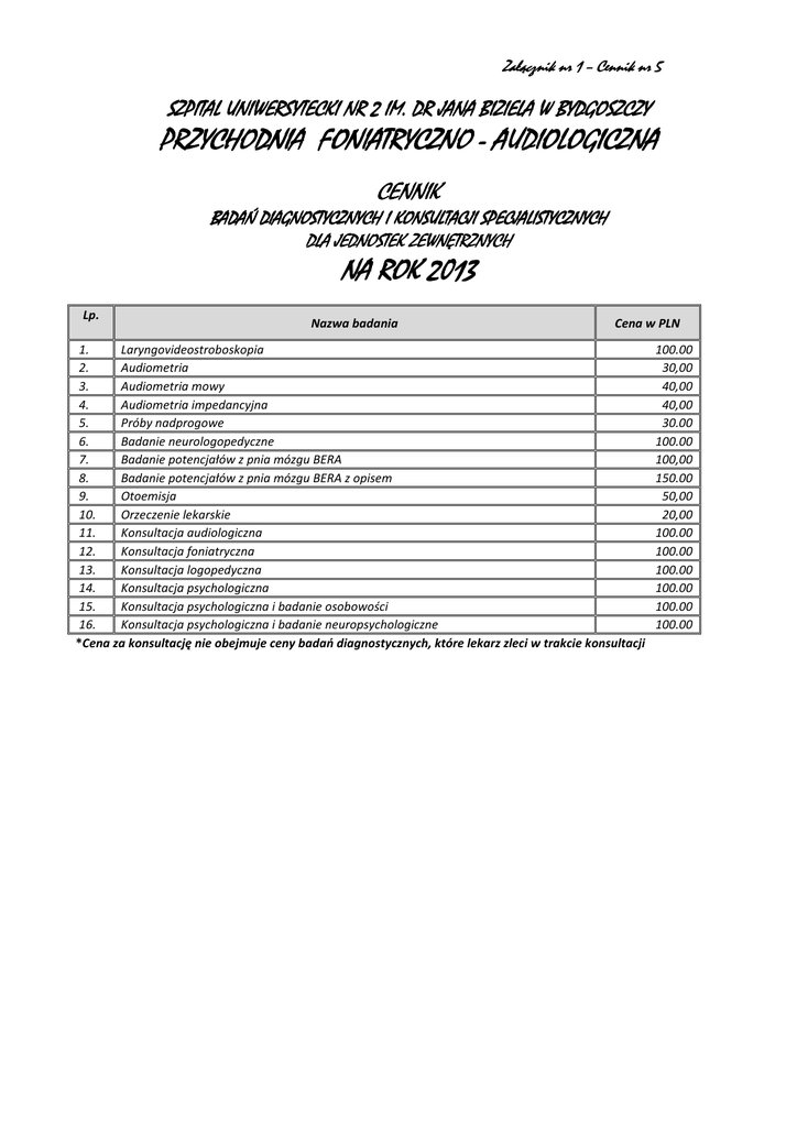 Załącznik nr 1 – Cennik nr 5 SZPITAL UNIWERSYTECKI NR 2 IM. DR JANA BIZIELA W BYDGOSZCZY PRZYCHODNIA FONIATRYCZNO - AUDIOLOGICZNA CENNIK BADAŃ DIAGNOSTYCZNYCH I KONSULTACJI SPECJALISTYCZNYCH DLA JEDNOSTEK ZEWNĘTRZNYCH NA ROK 2013 Lp. Nazwa badania Cena w PLN 1. Laryngovideostroboskopia 2. Audiometria 3. Audiometria mowy 4. Audiometria impedancyjna 5. Próby nadprogowe 6. Badanie neurologopedyczne 7. Badanie potencjałów z pnia mózgu BERA 8. Badanie potencjałów z pnia mózgu BERA z opisem 9. Otoemisja 10. Orzeczenie lekarskie 11. Konsultacja audiologiczna 12. Konsultacja foniatryczna 13. Konsultacja logopedyczna 14. Konsultacja psychologiczna 15. Konsultacja psychologiczna i badanie osobowości 16. Konsultacja psychologiczna i badanie neuropsychologiczne *Cena za konsultację nie obejmuje ceny badań diagnostycznych, które lekarz zleci w trakcie konsultacji 100.00 30,00 40,00 40,00 30.00 100.00 100,00 150.00 50,00 20,00 100.00 100.00 100.00 100.00 100.00 100.00