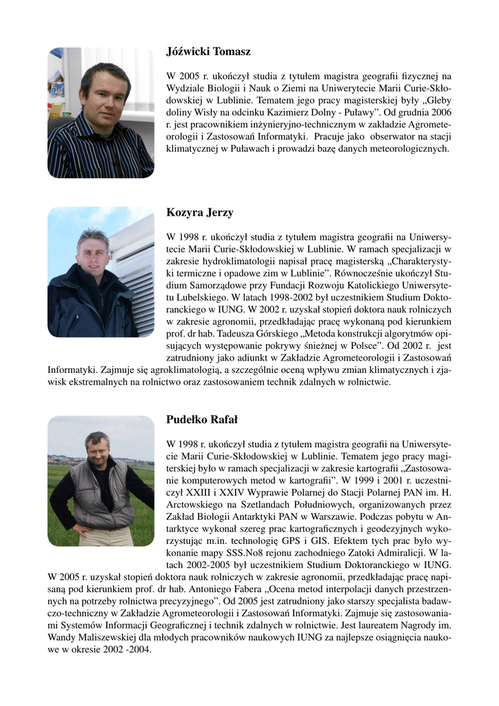 Jóźwicki Tomasz W 2005 r. ukończył studia z tytułem magistra geografii fizycznej na Wydziale Biologii i Nauk o Ziemi na Uniwerytecie Marii Curie-Skłodowskiej w Lublinie. Tematem jego pracy magisterskiej były „Gleby doliny Wisły na odcinku Kazimierz Dolny - Puławy”. Od grudnia 2006 r. jest pracownikiem inżynieryjno-technicznym w zakładzie Agrometeorologii i Zastosowań Informatyki. Pracuje jako obserwator na stacji klimatycznej w Puławach i prowadzi bazę danych meteorologicznych. Kozyra Jerzy W 1998 r. ukończył studia z tytułem magistra geografii na Uniwersytecie Marii Curie-Skłodowskiej w Lublinie. W ramach specjalizacji w zakresie hydroklimatologii napisał pracę magisterską „Charakterystyki termiczne i opadowe zim w Lublinie”. Równocześnie ukończył Studium Samorządowe przy Fundacji Rozwoju Katolickiego Uniwersytetu Lubelskiego. W latach 1998-2002 był uczestnikiem Studium Doktoranckiego w IUNG. W 2002 r. uzyskał stopień doktora nauk rolniczych w zakresie agronomii, przedkładając pracę wykonaną pod kierunkiem prof. dr hab. Tadeusza Górskiego „Metoda konstrukcji algorytmów opisujących występowanie pokrywy śnieżnej w Polsce”. Od 2002 r. jest zatrudniony jako adiunkt w Zakładzie Agrometeorologii i Zastosowań Informatyki. Zajmuje się agroklimatologią, a szczególnie oceną wpływu zmian klimatycznych i zjawisk ekstremalnych na rolnictwo oraz zastosowaniem technik zdalnych w rolnictwie. Pudełko Rafał W 1998 r. ukończył studia z tytułem magistra geografii na Uniwersytecie Marii Curie-Skłodowskiej w Lublinie. Tematem jego pracy magiterskiej było w ramach specjalizacji w zakresie kartografii „Zastosowanie komputerowych metod w kartografii”. W 1999 i 2001 r. uczestniczył XXIII i XXIV Wyprawie Polarnej do Stacji Polarnej PAN im. H. Arctowskiego na Szetlandach Południowych, organizowanych przez Zakład Biologii Antarktyki PAN w Warszawie. Podczas pobytu w Antarktyce wykonał szereg prac kartograficznych i geodezyjnych wykorzystując m.in. technologię GPS i GIS. Efektem tych prac było wykonanie mapy SSS.No8 rejonu zachodniego Zatoki Admiralicji. W latach 2002-2005 był uczestnikiem Studium Doktoranckiego w IUNG. W 2005 r. uzyskał stopień doktora nauk rolniczych w zakresie agronomii, przedkładając pracę napisaną pod kierunkiem prof. dr hab. Antoniego Fabera „Ocena metod interpolacji danych przestrzennych na potrzeby rolnictwa precyzyjnego”. Od 2005 jest zatrudniony jako starszy specjalista badawczo-techniczny w Zakładzie Agrometeorologii i Zastosowań Informatyki. Zajmuje się zastosowaniami Systemów Informacji Geograficznej i technik zdalnych w rolnictwie. Jest laureatem Nagrody im. Wandy Maliszewskiej dla młodych pracowników naukowych IUNG za najlepsze osiągnięcia naukowe w okresie 2002 -2004. Purchała Leszek W 1999 r. ukończył studia jako inżynier na Wydziale Inżynierii Produkcji na Politechnice Warszawskiej. W latach 1995-2001 pracował w DAEWOO-FSO jako technolog w Zakładzie Odlewnictwa i Zespole Rozwoju Nowych Przedsięwzięć. W latach 2001-2005 zatrudniony był w Instytucie Budownictwa, Mechanizacji i Elektryfikacji Rolnictwa w Warszawie jako specjalista i informatyk w Zakładzie Promocji. Od 2005 r. pracuje jako specjalista w Zakładzie Agrometeorologii i Zastosowań Informatyki, gdzie zajmuje się nadzorem nad automatycznymi stacjami meteorologicznymi oraz tworzeniem aplikacji internetowych.