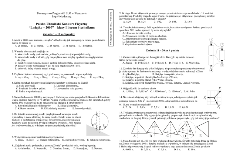 Polsko-Ukraiński Konkurs Fizyczny “Lwiątko – 2007” klasy I liceum i technikum Zadania 1 – 10 za 3 punkty 1. JeŜeli w 2008 roku konkurs „Lwiątko” odbędzie się, jak zazwyczaj, w ostatni poniedziałek marca, to będzie to A. 25 marca, B. 27 marca, C. 28 marca, D. 31 marca, E. 1 kwietnia. © Copyright by TP I SLO Warszawa Towarzystwo Przyjaciół I SLO w Warszawie http://lwiatko.org 2. W stanie niewaŜkości znajduje się A. skoczek do wody podczas lotu, jeśli opór powietrza jest pomijalnie mały, B. skoczek do wody w chwili, gdy ma prędkość zero między opadaniem a wypływaniem do góry, C. nurek w słonej wodzie, mającej gęstość dokładnie taką, jak gęstość jego ciała, D. pasaŜer windy zjeŜdŜającej w dół ze stałą prędkością 9,81 m/s, E. człowiek, który właśnie zszedł z wagi. 3. Prędkości kątowe minutowej ωm i godzinowej ωg wskazówki zegara spełniają B. ωg = 60ωm, C. ωm = 12ωg, D. ωg = 12ωm, E. ωm = 24ωg. A. ωm = 60ωg, 4. Która ze stałych fizycznych na KsięŜycu okazałaby się inna niŜ na Ziemi? A. Stała grawitacji. B. Ładunek elementarny. C. Prędkość światła w próŜni. D. Uniwersalna stała gazowa. E. śadna z wymienionych. 10. Torebkę śniadaniową z folii wypełniono wodą i szczelnie zawiązano. Jakim z poniŜszych sposobów NIE moŜna sprawić, by woda się wylała? A. Ukłuciem torebki szpilką. B. Zrzuceniem torebki z I piętra na chodnik. C. ZbliŜeniem do torebki płomienia zapałki. 1 D. Ściskaniem torebki w prawej ręce. E. Gryzieniem torebki zębami. A B 11. śaróweczki są identyczne, bateryjki takŜe. Bateryjki są świeŜe i mocne. Które Ŝaróweczki świecą? A. śadna. B. Tylko 2 i 3. C. Tylko 2 i 4. D. Tylko 1 i 4. E. Wszystkie. 3 12. Zjawisko faz dotyczy nie tylko KsięŜyca, ale przez teleskop moŜemy obserwować je takŜe u planet. W fazie nowiu moŜemy, w odpowiednim czasie, zobaczyć z Ziemi A. tylko KsięŜyc, B. KsięŜyc i wszystkie planety, C. KsięŜyc, a spośród planet tylko Merkurego i Wenus, D. KsięŜyc, a spośród planet tylko Wenus i Marsa, E. KsięŜyc, a spośród planet tylko Marsa, Jowisza, Saturna, Urana i Neptuna. 4 F2 14. Na ciało działają trzy siły, których wektory leŜą w jednej płaszczyźnie, jak α α A 8. „Dajcie mi punkt podparcia, a poruszę Ziemię” powiedzieć miał, według legendy, A. Archimedes, B. Kopernik, C. Giordano Bruno, D. Kartezjusz, E. Newton. F3 15. Trójkątny proporczyk ze sztywnej jednorodnej tkaniny wisi na dwóch pineskach wbitych przy górnych wierzchołkach. Gdy wyjęto jedną pineskę, proporczyk obrócił się i zaczął wahać się swobodnie na drugiej. Który rysunek pokazuje połoŜenie proporczyka, gdy juŜ ustały jego wahania? CD E E. ładunek elektryczny. F1 r pokazuje rysunek. Siła F1 ma wartość 2,0 N. Jaką wartość, z dokładnością do 0,1 N, ma wypadkowa tych sił? A. 7,1 N. B. 5,0 N. C. 2,5 N. D. 1,0 N. E. 0,6 N. R a 7. Wyłącznie nieujemne wartości moŜe przyjmować A. praca, B. moc, C. energia potencjalna, D. energia kinetyczna, 2 Zadania 11 – 20 za 4 punkty 13. Objętość piłki do tenisa to około A. 1,5 litra, B. 0,015 m3, C. 150000 mm3, D. 1500 cm3, E. 0,15 dm. 5. Samochód o masie 1000 kg, zuŜywając 1 litr benzyny, moŜe przejechać kilkanaście kilometrów. Ciepło spalania benzyny to 70 MJ/litr. Na jaką wysokość moŜna by podnieść ten samochód, gdyby moŜna było wykorzystać na to całą energię ze spalenia 1 litra benzyny? A. RównieŜ kilkanaście kilometrów. B. Kilka kilometrów. C. Kilkaset metrów. D. Kilkadziesiąt metrów. E. Inna odpowiedź. 6. Do ścianki aluminiowej puszki przylepiono od wewnątrz wałek z plasteliny o masie zbliŜonej do masy puszki. Dzięki temu, na równi pochyłej o dostatecznie chropowatej powierzchni, moŜemy umieścić puszkę w takim połoŜeniu, by się nie stoczyła (rysunek). Jeśli puszka jest w równowadze, to w którym miejscu znajduje się plastelina? 9. W ciągu 16 dni aktywność pewnego izotopu promieniotwórczego zmalała do 1/16 wartości początkowej. Produkty rozpadu są juŜ trwałe. Do jakiej części aktywności początkowej zmaleje aktywność tego izotopu po dalszych 4 dniach? A. 1/20. B. 1/24. C. 1/32. D. 1/48. E. 1/64. B C R a D R E 16. Masa Słońca jest ok. 300 tys. razy większa od masy Ziemi. Światło pokonuje drogę ze Słońca na Ziemię w ciągu ok. 500 s. Satelita znalazł się w punkcie, w którym siły przyciągania Ziemi i Słońca się równowaŜą. Sygnał radiowy wysłany z tego punktu dotrze na Ziemię po około A. 0,001 s, B. 0,01 s, C. 0,1 s, D. 1 s, E. 10 s. 17. Na rysunku pokazana jest orbita sztucznego satelity Ziemi. Stosunek wartości prędkości satelity w perigeum P do wartości jego prędkości w apogeum A wynosi A. 1, B. 3, C. 9, D. 27, E. 81. Ziemia P A B 18. Tafla lodu (gęstość 900 kg/m3) o grubości 5 cm pływa w wodzie (gęstość 1000 kg/m3). O ile podniesie się lub opadnie tafla lodu, gdy na powierzchnię wody nalejemy warstwę 3 cm nafty (gęstość 800 kg/m3)? Naczynie jest bardzo szerokie, w porównaniu z taflą. А. Podniesie się o 3 cm. B. Podniesie się o 2 cm. C. Opadnie o 0,2 cm. D. Opadnie o 0,5 cm. E. Opadnie o 1 cm. 20. Jaką część strzałki widać w lustrze z punktu P? А. 1/4. B. 1/2. C. 3/4. D. Całość. E. Odbicia strzałki nie widać. zwierciadło P Zadania 21 - 30 za 5 punktów 21. Jeden z rysunków A–E przedstawia obliczoną przez komputer trajektorię KsięŜyca w ciągu 60 dni, tak jak wyglądałaby dla obserwatora nieruchomego względem Słońca, patrzącego na Układ Słoneczny prostopadle do płaszczyzny orbity Ziemi. Który to rysunek? A B C D E 22. Dwa pudełka P1 i P2 spoczywały obok siebie na stole (rysunek). Między ich bocznymi ścianami umieszczono mały ładunek wybuchowy. Pudełka są na zewnątrz identyczne, ale P1 ma 2 razy mniejszą masę niŜ P2. Eksplozja wprawiła pudełka w ruch. Pudełko P1 zatrzymało się po przebyciu 16 cm. Wynika stąd, Ŝe 