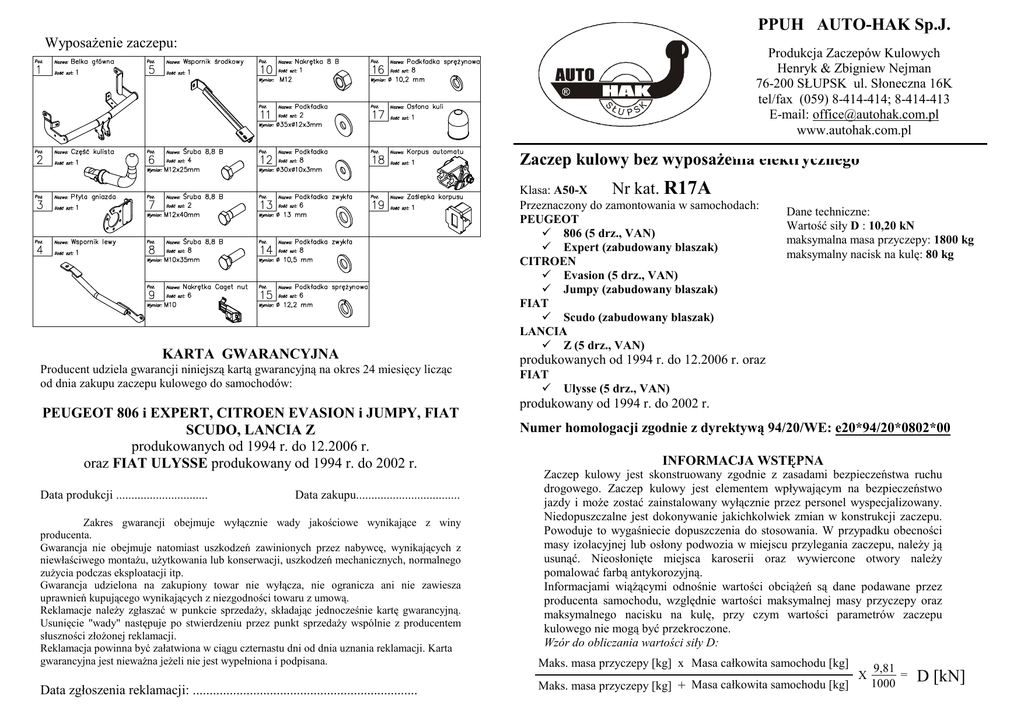 PPUH AUTO-HAK Sp.J. WyposaŜenie zaczepu: Produkcja Zaczepów Kulowych Henryk & Zbigniew Nejman 76-200 SŁUPSK ul. Słoneczna 16K tel/fax (059) 8-414-414; 8-414-413 E-mail: [email protected] www.autohak.com.pl Zaczep kulowy bez wyposaŜenia elektrycznego R17A KARTA GWARANCYJNA Producent udziela gwarancji niniejszą kartą gwarancyjną na okres 24 miesięcy licząc od dnia zakupu zaczepu kulowego do samochodów: PEUGEOT 806 i EXPERT, CITROEN EVASION i JUMPY, FIAT SCUDO, LANCIA Z produkowanych od 1994 r. do 12.2006 r. oraz FIAT ULYSSE produkowany od 1994 r. do 2002 r. Data produkcji .............................. Data zakupu.................................. Zakres gwarancji obejmuje wyłącznie wady jakościowe wynikające z winy producenta. Gwarancja nie obejmuje natomiast uszkodzeń zawinionych przez nabywcę, wynikających z niewłaściwego montaŜu, uŜytkowania lub konserwacji, uszkodzeń mechanicznych, normalnego zuŜycia podczas eksploatacji itp. Gwarancja udzielona na zakupiony towar nie wyłącza, nie ogranicza ani nie zawiesza uprawnień kupującego wynikających z niezgodności towaru z umową. Reklamacje naleŜy zgłaszać w punkcie sprzedaŜy, składając jednocześnie kartę gwarancyjną. Usunięcie "wady" następuje po stwierdzeniu przez punkt sprzedaŜy wspólnie z producentem słuszności złoŜonej reklamacji. Reklamacja powinna być załatwiona w ciągu czternastu dni od dnia uznania reklamacji. Karta gwarancyjna jest niewaŜna jeŜeli nie jest wypełniona i podpisana. Data zgłoszenia reklamacji: ................................................................... Klasa: A50-X Nr kat. Przeznaczony do zamontowania w samochodach: PEUGEOT 806 (5 drz., VAN) Expert (zabudowany blaszak) CITROEN Evasion (5 drz., VAN) Jumpy (zabudowany blaszak) FIAT Scudo (zabudowany blaszak) LANCIA Z (5 drz., VAN) Dane techniczne: Wartość siły D : 10,20 kN maksymalna masa przyczepy: 1800 kg maksymalny nacisk na kulę: 80 kg produkowanych od 1994 r. do 12.2006 r. oraz FIAT Ulysse (5 drz., VAN) produkowany od 1994 r. do 2002 r. Numer homologacji zgodnie z dyrektywą 94/20/WE: e20*94/20*0802*00 INFORMACJA WSTĘPNA Zaczep kulowy jest skonstruowany zgodnie z zasadami bezpieczeństwa ruchu drogowego. Zaczep kulowy jest elementem wpływającym na bezpieczeństwo jazdy i moŜe zostać zainstalowany wyłącznie przez personel wyspecjalizowany. Niedopuszczalne jest dokonywanie jakichkolwiek zmian w konstrukcji zaczepu. Powoduje to wygaśniecie dopuszczenia do stosowania. W przypadku obecności masy izolacyjnej lub osłony podwozia w miejscu przylegania zaczepu, naleŜy ją usunąć. Nieosłonięte miejsca karoserii oraz wywiercone otwory naleŜy pomalować farbą antykorozyjną. Informacjami wiąŜącymi odnośnie wartości obciąŜeń są dane podawane przez producenta samochodu, względnie wartości maksymalnej masy przyczepy oraz maksymalnego nacisku na kulę, przy czym wartości parametrów zaczepu kulowego nie mogą być przekroczone. Wzór do obliczania wartości siły D: Maks. masa przyczepy [kg] x Masa całkowita samochodu [kg] 9,81 = X + 1000 Maks. masa przyczepy [kg] + Masa całkowita samochodu [kg] + D [kN] INSTRUKCJA MontaŜu i eksploatacji zaczepu kulowego Oznaczenie zacisku wg ISO PN 1 L 2 + 3 31 4 R 5 58R 6 54 7 58L B Łączenie przewodów 9 12 C 9 Kierunkowskazy lewe Tylne światła przeciwmgłowe Masa Kierunkowskazy prawe Światła pozycyjne prawe Światła hamowania Światła pozycyjne lewe Kolejność czynności przy montaŜu A 12 12 9 8 8 8 A 5 8 12 A 8 4 A 8 6 1 B 7 C 8 17 3 18 2 11 Zaczep kulowy przeznaczony jest do zamontowania w samochodach: PEUGEOT 806 (5 drz. i VAN) oraz EXPERT (zabudowany blaszak), CITROEN EVASION (5 drz. i VAN) oraz JUMPY (zabudowany blaszak), FIAT SCUDO (zabudowany blaszak), LANCIA Z (5 drz. i VAN) produkowanych od 1994 r. do 12.2006 r., oraz FIAT ULYSSE (5 drz. i VAN) produkowany od 1994 r. do 2002 r., nr katalogowy R17A i słuŜy do ciągnięcia przyczep o masie całkowitej 1800 kg i nacisku na kulę max 80 kg. OD PRODUCENTA Dziękujemy za wybór produkowanego przez naszą firmę zaczepu kulowego. Jego niezawodność została potwierdzona licznymi testami oraz opiniami zadowolonych klientów. JednakŜe niezawodność haków holowniczych jest zaleŜna równieŜ od prawidłowego montaŜu oraz prawidłowej eksploatacji. Z tego powodu prosimy Państwa o staranne przeczytanie niniejszej instrukcji montaŜu oraz przestrzeganie zawartych wskazówek. Zaczep naleŜy zamontować w miejscach do tego celu przeznaczonych przez producenta samochodu. 1. Opuścić koło zapasowe i kolektor wydechowy. 2. Wykonać wycięcie w zderzaku w jego osi o szerokości 80mm i głębokości 50mm. 3. Umieścić specjalne nakrętki (poz. 9) w podłuŜnicach. 4. Przykręcić belkę zaczepu (poz. 1) do podłuŜnic w punktach oznaczonych A – luźno. 5. Przykręcić wspornik boczny (poz. 4) do podłuŜnicy oraz do belki zaczepu w punktach oznaczonych B – luźno. 6. Przykręcić wspornik środkowy (poz. 5) do podłuŜnicy oraz belki zaczepu w punktach oznaczonych C - luźno 7. Przykręcić korpus automatu (poz. 18) śrubami M12x25mm (poz. 6) wraz z blachą pod gniazdo (poz. 3). Zamocować kulę zgodnie z instrukcją dołączaną do zaczepu z końcówką szybkodemontowalną. 8. Dokręcić wszystkie śruby z momentem jak podano w tabelce. 9. Podłączyć przewody z gniazdka 7 – bieg. do instalacji elektrycznej zgodnie z instrukcją fabryczną samochodu (zaleca się wykonanie w ASO). 10. Uzupełnić ewentualne ubytki powłoki malarskiej zaczepu powstałe w trakcie montaŜu. Zalecany moment skręcający dla śrub i nakrętek 8,8: M6 - 11 Nm M8 - 25 Nm M10 - 50 Nm M12 - 87 Nm M14 - 138 Nm M16 - 210 Nm UWAGA Po zamontowaniu zaczepu kulowego naleŜy uzyskać wpis w dowodzie rejestracyjnym pojazdu na „stacji kontroli pojazdów” właściwej dla miejsca zamieszkania. Samochód powinien być wyposaŜony w : -kierunkowskazy boczne -lusterka boczne o rozstawie, co najmniej szerokości przycz