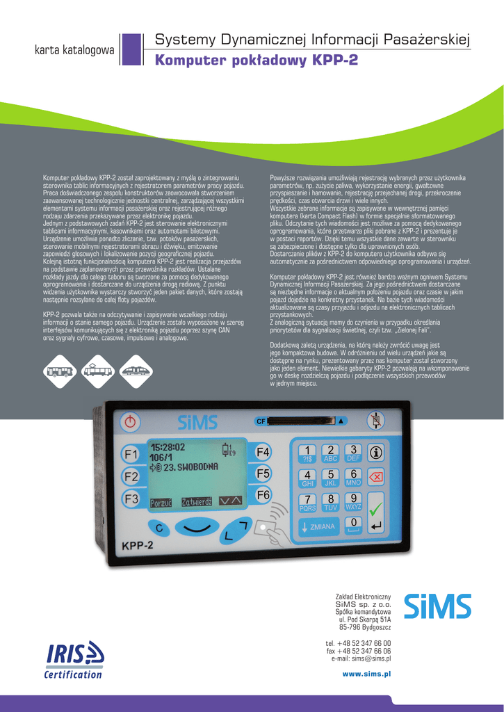 karta katalogowa Systemy Dynamicznej Informacji Pasażerskiej Komputer pokładowy KPP-2 Komputer pokładowy KPP-2 został zaprojektowany z myślą o zintegrowaniu sterownika tablic informacyjnych z rejestratorem parametrów pracy pojazdu. Praca doświadczonego zespołu konstruktorów zaowocowała stworzeniem zaawansowanej technologicznie jednostki centralnej, zarządzającej wszystkimi elementami systemu informacji pasażerskiej oraz rejestrującej różnego rodzaju zdarzenia przekazywane przez elektronikę pojazdu. Jednym z podstawowych zadań KPP-2 jest sterowanie elektronicznymi tablicami informacyjnymi, kasownikami oraz automatami biletowymi. Urządzenie umożliwia ponadto zliczanie, tzw. potoków pasażerskich, sterowanie mobilnymi rejestratorami obrazu i dźwięku, emitowanie zapowiedzi głosowych i lokalizowanie pozycji geograficznej pojazdu. Kolejną istotną funkcjonalnością komputera KPP-2 jest realizacja przejazdów na podstawie zaplanowanych przez przewoźnika rozkładów. Ustalane rozkłady jazdy dla całego taboru są tworzone za pomocą dedykowanego oprogramowania i dostarczane do urządzenia drogą radiową. Z punktu widzenia użytkownika wystarczy stworzyć jeden pakiet danych, które zostają następnie rozsyłane do całej floty pojazdów. KPP-2 pozwala także na odczytywanie i zapisywanie wszelkiego rodzaju informacji o stanie samego pojazdu. Urządzenie zostało wyposażone w szereg interfejsów komunikujących się z elektroniką pojazdu poprzez szynę CAN oraz sygnały cyfrowe, czasowe, impulsowe i analogowe. Powyższe rozwiązania umożliwiają rejestrację wybranych przez użytkownika parametrów, np. zużycie paliwa, wykorzystanie energii, gwałtowne przyspieszanie i hamowanie, rejestrację przejechanej drogi, przekroczenie prędkości, czas otwarcia drzwi i wiele innych. Wszystkie zebrane informacje są zapisywane w wewnętrznej pamięci komputera (karta Compact Flash) w formie specjalnie sformatowanego pliku. Odczytanie tych wiadomości jest możliwe za pomocą dedykowanego oprogramowania, które przetwarza pliki pobrane z KPP-2 i prezentuje je w postaci raportów. Dzięki temu wszystkie dane zawarte w sterowniku są zabezpieczone i dostępne tylko dla uprawnionych osób. Dostarczanie plików z KPP-2 do komputera użytkownika odbywa się automatycznie za pośrednictwem odpowiedniego oprogramowania i urządzeń. Komputer pokładowy KPP-2 jest również bardzo ważnym ogniwem Systemu Dynamicznej Informacji Pasażerskiej. Za jego pośrednictwem dostarczane są niezbędne informacje o aktualnym położeniu pojazdu oraz czasie w jakim pojazd dojedzie na konkretny przystanek. Na bazie tych wiadomości aktualizowane są czasy przyjazdu i odjazdu na elektronicznych tablicach przystankowych. Z analogiczną sytuacją mamy do czynienia w przypadku określania priorytetów dla sygnalizacji świetlnej, czyli tzw. „Zielonej Fali”. Dodatkową zaletą urządzenia, na którą należy zwrócić uwagę jest jego kompaktowa budowa. W odróżnieniu od wielu urządzeń jakie są dostępne na rynku, prezentowany przez nas komputer został stworzony jako jeden element. Niewielkie gabaryty KPP-2 pozwalają na wkomponowanie go w deskę rozdzielczą pojazdu i podłączenie wszystkich przewodów w jednym miejscu. Zakład Elektroniczny SiMS sp. z o.o. Spółka komandytowa ul. Pod Skarpą 51A 85-796 Bydgoszcz tel. +48 52 347 66 00 fax +48 52 347 66 06 e-mail: [email protected] www.sims.pl Funkcje standardowe: współpraca z systemem generującym rozkłady jazdy, identyfikacja kierowcy (PIN), karta MyFIRE współpraca z kasownikami papierowymi (nadruk 10 i 17 znaków), zliczanie skasowanych biletów, współpraca z radiomodemem RM i GPS, współpraca z urządzeniem tachometrycznym, sterowanie elektronicznymi tablicami kierunkowymi i informacyjnymi, emisja zapowiedzi głosowych, obsługa sygnałów cyfrowych, czasowych, impulsowych i analogowych, podpowiadanie godzin odjazdów dla kierowcy, bezprzewodowa aktualizacja danych i oprogramowania oraz pobieranie rejestrów. Opcje: obsługa kasowników bezstykowych oraz kasownikami bezstykowymi CAMEL COMBI zliczanie potoków pasażerskich, elektroniczna identyfikacja kierowcy, komunikacja z systemem LRDT (komunikacja na terenie miasta z centrum zarządzania flotą), obsługa automatów biletowych. Rejestracja: rejestracja parametrów pracy pojazdu (np. zużycia paliwa, obrotów silnika i wiele innych elementów przekazywanych przez elektronikę pojazdu), czasu pracy kierowcy, wybranej brygady, stanu pracy kasowników, ilości skasowanych biletów, punktualności realizacji przejazdów, czasu otwarcia drzwi, przejechanej drogi, gwałtownego hamowania lub przyspieszenia, przekroczenia prędkości, pozycji geograficznej pojazdu (wymaga GPS). karta katalogowa Dane techniczne: Napięcie zasilania Pobór prądu (dla 24V) Wymiary [S×W×G mm] Masa [kg] Kolor obudowy Ilość wejść cyfrowych Ilość wejść impulsowych Ilość wejść czasowych Ilość wejść analogowych Ilość kanałów transmisyjnych RS422 Ilość kanałów transmisyjnych RS485 Ilość interfejsów LAN Pamięć flash [MB] 16-36V DC max 0,2A 192×95×94,5 0,675 czarny mat 11 2 2 2 5 1 1 64÷2048 Systemy Dynamicznej Informacji Pasażerskiej Komputer pokładowy KPP-2 Zapraszamy do współpracy!