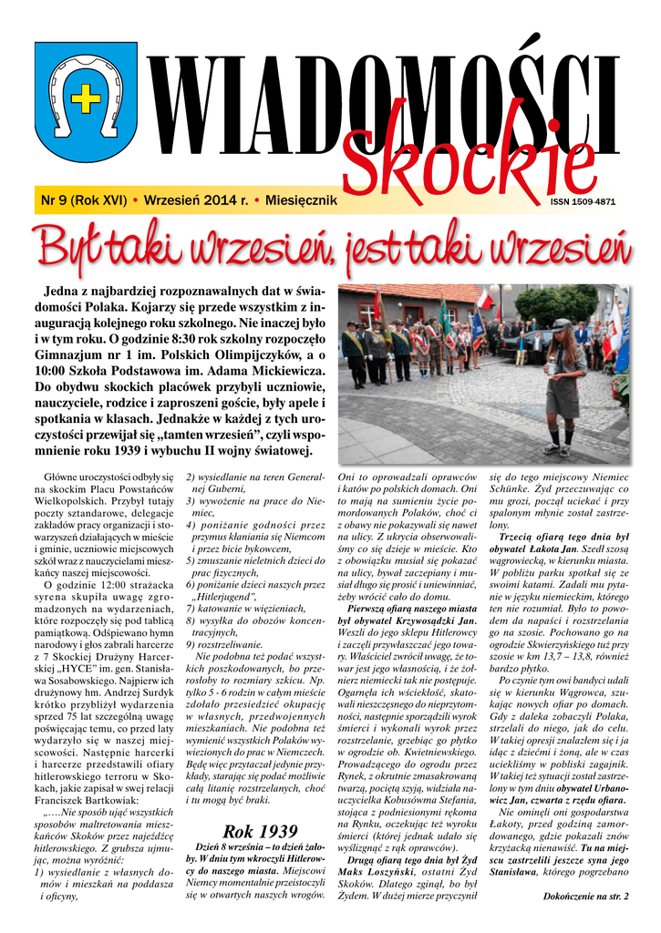 Nr 9 (Rok XVI) • Wrzesień 2014 r. • Miesięcznik Był taki wrzesień, jest taki wrzesień Jedna z najbardziej rozpoznawalnych dat w świadomości Polaka. Kojarzy się przede wszystkim z inauguracją kolejnego roku szkolnego. Nie inaczej było i w tym roku. O godzinie 8:30 rok szkolny rozpoczęło Gimnazjum nr 1 im. Polskich Olimpijczyków, a o 10:00 Szkoła Podstawowa im. Adama Mickiewicza. Do obydwu skockich placówek przybyli uczniowie, nauczyciele, rodzice i zaproszeni goście, były apele i spotkania w klasach. Jednakże w każdej z tych uroczystości przewijał się „tamten wrzesień”, czyli wspomnienie roku 1939 i wybuchu II wojny światowej. Główne uroczystości odbyły się na skockim Placu Powstańców Wielkopolskich. Przybył tutajy poczty sztandarowe, delegacje zakładów pracy organizacji i stowarzyszeń działających w mieście i gminie, uczniowie miejscowych szkół wraz z nauczycielami mieszkańcy naszej miejscowości. O godzinie 12:00 strażacka syrena skupiła uwagę zgromadzonych na wydarzeniach, które rozpoczęły się pod tablicą pamiątkową. Odśpiewano hymn narodowy i głos zabrali harcerze z 7 Skockiej Drużyny Harcerskiej „HYCE” im. gen. Stanisława Sosabowskiego. Najpierw ich drużynowy hm. Andrzej Surdyk krótko przybliżył wydarzenia sprzed 75 lat szczególną uwagę poświęcając temu, co przed laty wydarzyło się w naszej miejscowości. Następnie harcerki i harcerze przedstawili ofiary hitlerowskiego terroru w Skokach, jakie zapisał w swej relacji Franciszek Bartkowiak: „….Nie sposób ująć wszystkich sposobów maltretowania mieszkańców Skoków przez najeźdźcę hitlerowskiego. Z grubsza ujmując, można wyróżnić: 1) wysiedlanie z własnych domów i mieszkań na poddasza i oficyny, 2) wysiedlanie na teren Generalnej Guberni, 3) wywożenie na prace do Niemiec, 4) poniżanie godności przez przymus kłaniania się Niemcom i przez bicie bykowcem, 5) zmuszanie nieletnich dzieci do prac fizycznych, 6) poniżanie dzieci naszych przez „Hitlerjugend”, 7) katowanie w więzieniach, 8) wysyłka do obozów koncentracyjnych, 9) rozstrzeliwanie. Nie podobna też podać wszystkich poszkodowanych, bo przerosłoby to rozmiary szkicu. Np. tylko 5 - 6 rodzin w całym mieście zdołało przesiedzieć okupację w własnych, przedwojennych mieszkaniach. Nie podobna też wymienić wszystkich Polaków wywiezionych do prac w Niemczech. Będę więc przytaczał jedynie przykłady, starając się podać możliwie całą litanię rozstrzelanych, choć i tu mogą być braki. Rok 1939 Dzień 8 września – to dzień żałoby. W dniu tym wkroczyli Hitlerowcy do naszego miasta. Miejscowi Niemcy momentalnie przeistoczyli się w otwartych naszych wrogów. Oni to oprowadzali oprawców i katów po polskich domach. Oni to mają na sumieniu życie pomordowanych Polaków, choć ci z obawy nie pokazywali się nawet na ulicy. Z ukrycia obserwowaliśmy co się dzieje w mieście. Kto z obowiązku musiał się pokazać na ulicy, bywał zaczepiany i musiał długo się prosić i uniewinniać, żeby wrócić cało do domu. Pierwszą ofiarą naszego miasta był obywatel Krzywosądzki Jan. Weszli do jego sklepu Hitlerowcy i zaczęli przywłaszczać jego towary. Właściciel zwrócił uwagę, że towar jest jego własnością, i że żołnierz niemiecki tak nie postępuje. Ogarnęła ich wściekłość, skatowali nieszczęsnego do nieprzytomności, następnie sporządzili wyrok śmierci i wykonali wyrok przez rozstrzelanie, grzebiąc go płytko w ogrodzie ob. Kwietniewskiego. Prowadzącego do ogrodu przez Rynek, z okrutnie zmasakrowaną twarzą, pociętą szyją, widziała nauczycielka Kobusówma Stefania, stojąca z podniesionymi rękoma na Rynku, oczekując też wyroku śmierci (której jednak udało się wyślizgnąć z rąk oprawców). Drugą ofiarą tego dnia był Żyd Maks Loszyński, ostatni Żyd Skoków. Dlatego zginął, bo był Żydem. W dużej mierze przyczynił się do tego miejscowy Niemiec Schünke. Żyd przeczuwając co mu grozi, począł uciekać i przy spalonym młynie został zastrzelony. Trzecią ofiarą tego dnia był obywatel Łakota Jan. Szedł szosą wągrowiecką, w kierunku miasta. W pobliżu parku spotkał się ze swoimi katami. Zadali mu pytanie w języku niemieckim, którego ten nie rozumiał. Było to powodem da napaści i rozstrzelania go na szosie. Pochowano go na ogrodzie Skwierzyńskiego tuż przy szosie w km 13,7 – 13,8, również bardzo płytko. Po czynie tym owi bandyci udali się w kierunku Wągrowca, szukając nowych ofiar po domach. Gdy z daleka zobaczyli Polaka, strzelali do niego, jak do celu. W takiej opresji znalazłem się i ja idąc z dziećmi i żoną, ale w czas uciekliśmy w pobliski zagajnik. W takiej też sytuacji został zastrzelony w tym dniu obywatel Urbanowicz Jan, czwarta z rzędu ofiara. Nie ominęli oni gospodarstwa Łakoty, przed godziną zamordowanego, gdzie pokazali znów krzyżacką nienawiść. Tu na miejscu zastrzelili jeszcze syna jego Stanisława, którego pogrzebano Dokończenie na str. 2 2 Był taki wrzesień, jest taki wrzesień Dokończenie ze str. 1 za stodołą, a matkę ciężko ranili i wywieźli w niewiadomym kierunku (i Skoków już nie zobaczyła), pozostawiając na łasce losu małoletnie dzieci, które przerażone rozbiegły się, unikając tym sposobem śmierci. Jest to piąta i szósta ofiara tego dnia. Gdy się nieco uspokoiło, sieroty wybłagały pozwolenie na pogrzeb rodziców. Musiały to urządzić cicho, o szarej godzinie, polnymi drogami, bez kapłana i orszaku pogrzebowego. Zbolałe, złamane wróciły do osamotnionego domu, przeżywając w tak młodym wieku niezrozumiałą dla nich tragedię życia ludzkiego. Siódmą ofiarą tegoż dnia był obywatel Maniak Antoni. Usłyszał strzały, wyszedł więc z domu i zauważył Niemców. Na ich widok chciał się ukryć do schronu, przez siebie zbudowanego, w tym momencie został trafiony w szyję i padł nieżywy. Ósmą ofiarą był