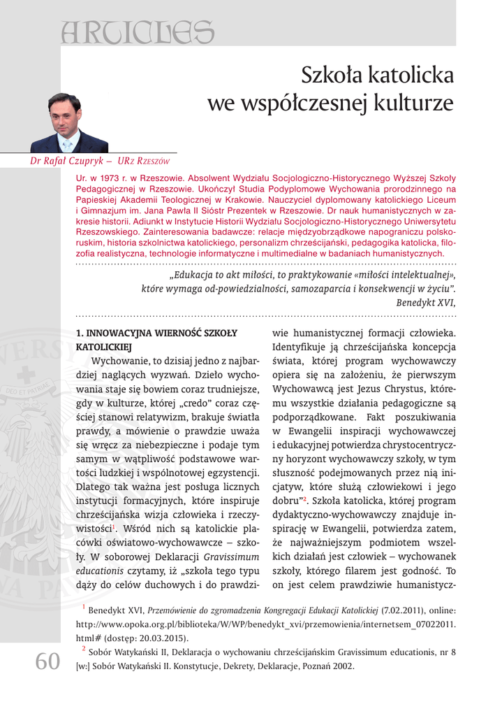 ARTICLES Szkoła katolicka we współczesnej kulturze Dr Rafał Czupryk – UR z R zeszów Ur. w 1973 r. w Rzeszowie. Absolwent Wydziału Socjologiczno-Historycznego Wyższej Szkoły Pedagogicznej w Rzeszowie. Ukończył Studia Podyplomowe Wychowania prorodzinnego na Papieskiej Akademii Teologicznej w Krakowie. Nauczyciel dyplomowany katolickiego Liceum i Gimnazjum im. Jana Pawła II Sióstr Prezentek w Rzeszowie. Dr nauk humanistycznych w zakresie historii. Adiunkt w Instytucie Historii Wydziału Socjologiczno-Historycznego Uniwersytetu Rzeszowskiego. Zainteresowania badawcze: relacje międzyobrządkowe napograniczu polskoruskim, historia szkolnictwa katolickiego, personalizm chrześcijański, pedagogika katolicka, filozofia realistyczna, technologie informatyczne i multimedialne w badaniach humanistycznych. „Edukacja to akt miłości, to praktykowanie «miłości intelektualnej», które wymaga od-powiedzialności, samozaparcia i konsekwencji w życiu”. Benedykt XVI, 1. Innowacyjna wierność szkoły katolickiej Wychowanie, to dzisiaj jedno z najbardziej naglących wyzwań. Dzieło wychowania staje się bowiem coraz trudniejsze, gdy w kulturze, której „credo” coraz częściej stanowi relatywizm, brakuje światła prawdy, a mówienie o prawdzie uważa się wręcz za niebezpieczne i podaje tym samym w wątpliwość podstawowe wartości ludzkiej i wspólnotowej egzystencji. Dlatego tak ważna jest posługa licznych instytucji formacyjnych, które inspiruje chrześcijańska wizja człowieka i rzeczywistości1. Wśród nich są katolickie placówki oświatowo-wychowawcze – szkoły. W soborowej Deklaracji Gravissimum educationis czytamy, iż „szkoła tego typu dąży do celów duchowych i do prawdzi1 wie humanistycznej formacji człowieka. Identyfikuje ją chrześcijańska koncepcja świata, której program wychowawczy opiera się na założeniu, że pierwszym Wychowawcą jest Jezus Chrystus, któremu wszystkie działania pedagogiczne są podporządkowane. Fakt poszukiwania w Ewangelii inspiracji wychowawczej i edukacyjnej potwierdza chrystocentryczny horyzont wychowawczy szkoły, w tym słuszność podejmowanych przez nią inicjatyw, które służą człowiekowi i jego dobru”2. Szkoła katolicka, której program dydaktyczno-wychowawczy znajduje inspirację w Ewangelii, potwierdza zatem, że najważniejszym podmiotem wszelkich działań jest człowiek – wychowanek szkoły, którego filarem jest godność. To on jest celem prawdziwie humanistycz- Benedykt XVI, Przemówienie do zgromadzenia Kongregacji Edukacji Katolickiej (7.02.2011), online: http://www.opoka.org.pl/biblioteka/W/WP/benedykt_xvi/przemowienia/internetsem_07022011. html# (dostęp: 20.03.2015). 60 2 Sobór Watykański II, Deklaracja o wychowaniu chrześcijańskim Gravissimum educationis, nr 8 [w:] Sobór Watykański II. Konstytucje, Dekrety, Deklaracje, Poznań 2002. ARTYKUŁY nej formacji opartej na chrześcijańskich wartościach i integralnej koncepcji osoby. Integralność ta, to pewna spójność, niepodzielność i w ocenie rzeczywistości i opisie człowieka. Osiągnięcie celu, czyli dobra osoby, zależy jednak od wychowawczej wizji jaką przyjmie szkoła, w tym słuszności podejmowanych przez nią inicjatyw. Suma wszystkich czynników determinuje skuteczność całego procesu dydaktycznego. Współcześnie, szkoły katolickie ze swoją wyraźną tożsamością i otwarciem na człowieka pojmowanego „w sposób integralny”, mogą odegrać cenną rolę w upowszechnianiu „szeroko pojętej” wartości edukacji, aby kształcić osoby dojrzałe, odpowiedzialne, kompetentne, mądre, umiejące współpracować z innymi i mające poczucie sensu życia. Aby tak się stało, niezbędna jest odważna „innowacyjna wierność” szkoły, która potrafi łączyć świadomość własnej tożsamości z otwartością na odmienność. Twórczy dialog tradycji ze współczesnością i wiary z kulturą, to cenny rys katolickiej szkoły. To bardzo ważny aspekt jej społecznej misji: wskazywać wymiar etyczny kulturze, pobudzając ludzką aktywność do szukania prawdy i wartości absolutnych. W dobie współczesnych wyzwań, wśród których formacja i wychowanie są priorytetowe, „innowacyjna wierność” szkoły karze żywić nadzieję, że wszelkie starania w tym względzie są możliwe do zrealizowania. Praktykowana «miłość intelektualna», inspirowana Ewangelią, to gwarancja sukcesu, choć okupionego potrzebą odpowiedzialności, samozaparcia i konsekwencji w działaniu. 3 2. Kryzys kultury Istotnym powołaniem katolickiej wiary jest ukazywanie tożsamości człowieczeństwa w Chrystusie, w połączeniu z radością, która jest źródłem prawdziwej ludzkiej twórczości. W ten sposób wiara stając się kulturą, „wylewa” się w przestrzeń życia społecznego, w dziedziny ludzkich aktywności i stylów życia. Szkoła katolicka, która „karmi” się wiarą w Chrystusa, buduje swą tożsamość na Ewangelicznej Prawdzie, proponuje tę właśnie kulturę. I aby była to prawda, a nie pozór wyrażony niekiedy w szyldzie szkoły, potrzebna jest stała troska o uzasadnioną nadzieję, że wiara ma sens, a Bóg, i tylko On, jest w relacji z całą rzeczywistością, w tym także szkolną. Źródłem kultury zawsze był człowiek w oderwaniu od którego kultura nie mogłaby istnieć. W zależności jednak od przyjętej wizji człowieka, od uznanej antropologii, kultura może odzwierciedlać pełną prawdę o człowieku lub być wyrazem jedynie jej części, stając się tym samym kulturą nieautentyczną, kulturą fałszywą3. Współcześnie, dyskusja jaka toczy się wokół człowieka i o człowieku, jest jakby odbiciem ścierających się z sobą dwóch różnych antropologii, budowanych na dwóch różnych podstawach. Jedna – zamknięta w doczesności – bazuje niemal wyłącznie na rozwoju ekonomicznym, postępie technicznym, konsumpcji i przeróżnych formach rozrywki; druga – nie lekcewa