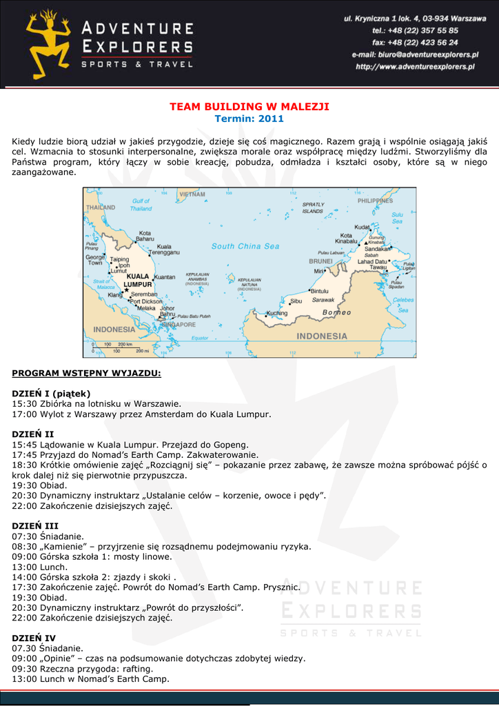 TEAM BUILDING W MALEZJI Termin: 2011 Kiedy ludzie biorą udział w jakieś przygodzie, dzieje się coś magicznego. Razem grają i wspólnie osiągają jakiś cel. Wzmacnia to stosunki interpersonalne, zwiększa morale oraz współpracę między ludźmi. Stworzyliśmy dla Państwa program, który łączy w sobie kreację, pobudza, odmładza i kształci osoby, które są w niego zaangaŜowane. PROGRAM WSTĘPNY WYJAZDU: DZIEŃ I (piątek) 15:30 Zbiórka na lotnisku w Warszawie. 17:00 Wylot z Warszawy przez Amsterdam do Kuala Lumpur. DZIEŃ II 15:45 Lądowanie w Kuala Lumpur. Przejazd do Gopeng. 17:45 Przyjazd do Nomad’s Earth Camp. Zakwaterowanie. 18:30 Krótkie omówienie zajęć „Rozciągnij się” – pokazanie przez zabawę, Ŝe zawsze moŜna spróbować pójść o krok dalej niŜ się pierwotnie przypuszcza. 19:30 Obiad. 20:30 Dynamiczny instruktarz „Ustalanie celów – korzenie, owoce i pędy”. 22:00 Zakończenie dzisiejszych zajęć. DZIEŃ III 07:30 Śniadanie. 08:30 „Kamienie” – przyjrzenie się rozsądnemu podejmowaniu ryzyka. 09:00 Górska szkoła 1: mosty linowe. 13:00 Lunch. 14:00 Górska szkoła 2: zjazdy i skoki . 17:30 Zakończenie zajęć. Powrót do Nomad’s Earth Camp. Prysznic. 19:30 Obiad. 20:30 Dynamiczny instruktarz „Powrót do przyszłości”. 22:00 Zakończenie dzisiejszych zajęć. DZIEŃ IV 07.30 Śniadanie. 09:00 „Opinie” – czas na podsumowanie dotychczas zdobytej wiedzy. 09:30 Rzeczna przygoda: rafting. 13:00 Lunch w Nomad’s Earth Camp. 1 14:45 Rzeczna przygoda: Autoratownictwo. 17:30 Zakończenie zajęć. Powrót do Nomad’s Earth Camp. Prysznic. 19:30 Obiad. 20:30 „Rzeźba strachu” – ocena w celu ułatwienia uczestnikom zrozumienia samych siebie (swoich osobowości, swojego charakteru) oraz całego zespołu. 22:00 Zakończenie dzisiejszych zajęć. DZIEŃ V 07.30 Śniadanie. 08:30 „Prezent” – docenianie opinii na temat zespołu. 09:00 Rzeczna przygoda: kajaki górskie. 13:00 Lunch w Nomad’s Earth Camp. 14:00 Rzeczna przygoda: kajaki górskie. 17:30 Zakończenie zajęć. Powrót do Nomad’s Earth Camp. Prysznic. 19:30 Obiad. DZIEŃ VI 07.30 Śniadanie. 08:30 Przeprawa przez górską dŜunglę: Gunung Bujang Melaka Expedition. 09:00 Rozpoczęcie trekkingu. Lunch w trakcie postoju. 16:00 Rozkładamy obóz nad górskim strumieniem. Rozbijamy namioty. Gotujemy. 21:00 Koniec dnia. DZIEŃ VII 07.00 Śniadanie. 08:00 Wyruszamy w kierunku szczytu. 10:00 Zdobywamy szczyt. Pamiątkowe zdjęcia. 11:00 Rozpoczynamy zejście. Lunch na postoju. 15:00 Koniec zejścia. Kąpiel pod górskim wodospadem. 17:00 Powrót do Nomad’s Earth Camp. Czas wolny. 19:30 Obiad 20:30 Czas na osobiste przemyślenia. 22:00 Zakończenie dzisiejszych zajęć. DZIEŃ VIII 07.30 Śniadanie. 08:30 „WęŜe i drabiny” – mocne i słabe strony zespołu. 09:00 W poszukiwaniu Magicznego Ognia. 14:00 Lunch w Nomad’s Earth Camp. 15:00 Ostateczne podsumowanie: „Fakty, odczucia, odkrycia, przyszłość” – Dokąd zmierzamy? Podsumowanie pracy zespołowej. 18:30 Zakończenie zajęć. Prysznic. 19:30 Początek uroczystej kolacji poŜegnalnej / barbecue. 20:30 Wieczór przy ognisku. 22:00 Zakończenie dzisiejszych zajęć. DZIEŃ IX 09.00 Śniadanie. 10:00 Wyjazd do Kuala Lumpur. Czas wolny. Zwiedzanie Kuala Lumpur. 21:45 Zbiórka na lotnisku. 23:45 Wylot do Polski. 2 DZIEŃ X (poniedziałek) 12:15 Lądowanie w Warszawie. Program w wersji maksymalnej. W razie potrzeby program moŜe zostać skrócony i zmodyfikowany. Cena wynosi: 6600 zł / os. – w opcji z zakwaterowaniem w Nomad’s Earth Camp: domki na drzewach 8300 zł / os. – w opcji z zakwaterowaniem w hotelu: codzienny dojazd do Nomad’s Earth Camp Cena • • • • • • • • • • • obejmuje: przelot międzynarodowy na trasie Warszawa – Kuala Lumpur – Warszawa, transfer lotnisko – camp – lotnisko, transfery hotel-lotnisko -hotel (w wersji z zakwaterowaniem w hotelu) zakwaterowanie zgodnie z ofertą- domki na drzewach lub hotel 3*+ wyŜywienie: trzy posiłki dziennie realizacja zajęć zgodnie z programem sprzęt do uprawiania sportów opiekę wykwalifikowanych instruktorów i lokalnych przewodników opiekę przedstawiciela Adventure Explorers ubezpieczenie od sportów ekstremalnych ubezpieczenie turystyczne KL, NNW, bagaŜu. Cena • • • nie obejmuje: zwiedzania Kuala Lumpur wydatków własnych, napiwków. Informacje dodatkowe: MALEZJA Stolica: Kuala Lumpur Stolica administracyjna: Putrajaya Waluta: ringgit (MYR), 1 MYR = 100 senów; Język urzędowy: malajski Inne języki: angielski, chiński, tamilski WIZA, PRZEPISY WJAZDOWE. W przypadku pobytu nie dłuŜszego niŜ 90 dni nie ma obowiązku posiadania wizy. Nie dotyczy to przyjazdów w celu podjęcia pracy lub nauki. Wymagany okres waŜności paszportu przy wjeździe wynosi 6 miesięcy. Nie ma obowiązku okazania biletu powrotnego przy wjeździe, jednak moŜe tego zaŜądać przewoźnik. Władze imigracyjne mogą Ŝądać od turystów okazania środków finansowych w gotówce w przypadku braku waŜnego biletu lotniczego na wyjazd z Malezji. Na dzień pobytu wymagane jest ok. 5 USD. PRZEPISY CELNE nie odbiegają od powszechnie przyjętych standardów. Rząd z dniem 01.01.2010 r. nałoŜył obowiązek wypełnienia deklaracji celnej i posiadania zezwolenia na przywóz i wywóz środków finansowych w 3 wysokości przekraczającej 10.000 USD (ok. 34.000 MYR) w odniesieniu do sumy wszystkich posiadanych przy sobie środków w róŜnych walutach, w tym w czekach podróŜnych. Zgoda wydawana jest w ciągu 1 dnia. Nie ma podatku VAT. PRZEPISY PRAWNE. Przemyt i posiadanie narkotyków oraz broni karane są śmiercią. MELDUNEK. Nie ma obowiązku meldunkowego. UBEZPIECZENIE. Nie ma obowiązku wykupienia ubezpieczeń osobowych. Honorowanie polis polskich towarzystw ubezpieczeniowych uzaleŜnione jest od decyzji instytucji świadczącej usługę. Ubezpieczenie moŜna kupić na miejscu w licznych biurach podróŜy. SZCZEPIENIA, SŁ
