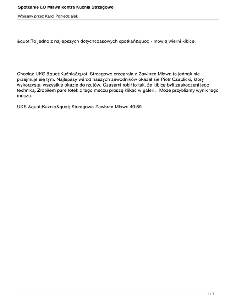 Spotkanie LO Mława kontra Kuźnia Strzegowo Wpisany przez Karol Poniedziałek "To jedno z najlepszych dotychczasowych spotkań" - mówią wierni kibice. Chociaż UKS "Kuźnia" Strzegowo przegrała z Zawkrze Mława to jednak nie przejmuje się tym. Najlepszy wśrod naszych zawodników okazał sie Piotr Czaplicki, który wykorzystał wszystkie okazje do rzutów. Czasami robił to tak, że kibice byli zaskoczeni jego techniką. Zrobiłem pare fotek z tego meczu proszę klikać w galerii. Może przybliżmy wynik tego meczu: UKS "Kuźnia" Strzegowo-Zawkrze Mława 49:59 1/1