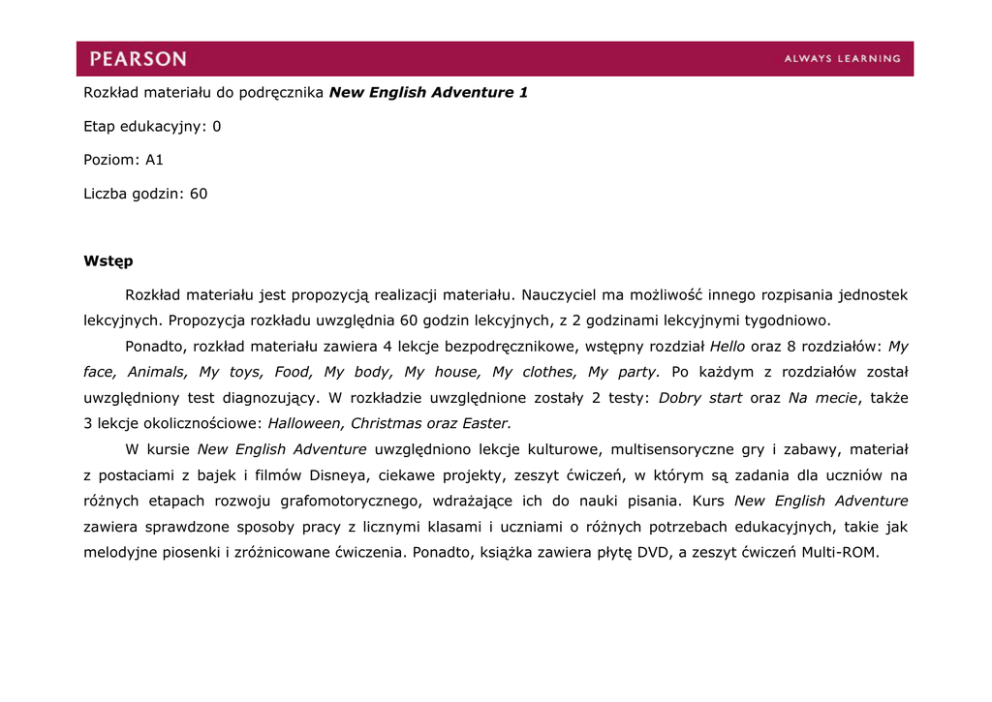Rozkład materiału do podręcznika New English Adventure 1 Etap edukacyjny: 0 Poziom: A1 Liczba godzin: 60 Wstęp Rozkład materiału jest propozycją realizacji materiału. Nauczyciel ma możliwość innego rozpisania jednostek lekcyjnych. Propozycja rozkładu uwzględnia 60 godzin lekcyjnych, z 2 godzinami lekcyjnymi tygodniowo. Ponadto, rozkład materiału zawiera 4 lekcje bezpodręcznikowe, wstępny rozdział Hello oraz 8 rozdziałów: My face, Animals, My toys, Food, My body, My house, My clothes, My party. Po każdym z rozdziałów został uwzględniony test diagnozujący. W rozkładzie uwzględnione zostały 2 testy: Dobry start oraz Na mecie, także 3 lekcje okolicznościowe: Halloween, Christmas oraz Easter. W kursie New English Adventure uwzględniono lekcje kulturowe, multisensoryczne gry i zabawy, materiał z postaciami z bajek i filmów Disneya, ciekawe projekty, zeszyt ćwiczeń, w którym są zadania dla uczniów na różnych etapach rozwoju grafomotorycznego, wdrażające ich do nauki pisania. Kurs New English Adventure zawiera sprawdzone sposoby pracy z licznymi klasami i uczniami o różnych potrzebach edukacyjnych, takie jak melodyjne piosenki i zróżnicowane ćwiczenia. Ponadto, książka zawiera płytę DVD, a zeszyt ćwiczeń Multi-ROM. Nauczyciel ma do dyspozycji cyfrową wersję podręcznika (ActiveTeach), przeznaczoną do wyświetlania na tablicy interaktywnej. Testy diagnostyczne wraz z kartami pracy zostały zamieszczone na stronie www.pearson.pl w ramach Diagnozy szkolnej. Realizacja materiału w wymiarze 60 godzin rocznie, na podbudowie I etapu edukacyjnego, gwarantuje zrealizowanie podstawy programowej. Nauczyciel w dzienniku jest może zobowiązany być wpisem do prowadzenia dwujęzycznym: o cel komunikacyjny po myślniku (w języku polskim). dokumentacji temat dla ucznia w (w języku języku polskim, zapis angielskim) tematu rozszerzony Znajomość środków językowych Lp. 1 Temat rozdziału Temat lekcji Test Diagnosing test. Test Dobry start. Słownictwo - Gramatyka/Fonetyka - Zgodność z Nową podstawą programową Punkt Umiejętności podstawy Rozumienie wypowiedzi: - Materiał podręcznika i ćwiczeń Diagnoza Tworzenie wypowiedzi: Reagowanie na wypowiedzi: - 2 Okres bezpodręcznikowy Hello, Goodbye. Witanie się. Formy powitań i pożegnań. Polecenia. Przetwarzanie wypowiedzi: Rozumienie wypowiedzi: Uczeń rozróżnia formy powitań i pożegnań. Uczeń rozumie i rozróżnia polecenia. 2, 3b, 5, 7 SB: WB: - Tworzenie wypowiedzi: Uczeń wita się i żegna. TB: A26 Reagowanie na wypowiedzi: Uczeń reaguje na powitania i pożegnania. Uczeń reaguje na polecenia. 3 Okres bezpodręcznikowy School objects. Przedmioty szkolne. Przybory szkolne. Polecenia. Zwroty Pick up (a pencil), Try again! Pytanie What's this? Przetwarzanie wypowiedzi: Rozumienie wypowiedzi: Uczeń rozumie i rozróżnia przybory szkolne. 2, 3b, 5, 7 SB: WB: - Tworzenie wypowiedzi: Uczeń nazywa przybory szkolne. TB: A27 Reagowanie na wypowiedzi: Uczeń reaguje na polecenia i nazwy przyborów szkolnych. 4 Okres bezpodręcznikowy Colours. Kolory. Przybory szkolne. Kolory. Zwroty Pick up (a pencil), Try again!, Point to…, Touch something (red). Pytania What's this?, What colour is it? Przetwarzanie wypowiedzi: Rozumienie wypowiedzi: Uczeń rozumie i rozróżnia przybory szkolne i kolory. Uczeń rozumie polecenia i pytania dotyczące kolorów. Tworzenie wypowiedzi: Uczeń nazywa przybory szkolne i kolory. 2, 3b, 5, 7 SB: WB: TB: A28 Reagowanie na wypowiedzi: Uczeń reaguje na polecenia dotyczące nazw przyborów szkolnych. Uczeń reaguje na pytania dotyczące kolorów. 5 Okres bezpodręcznikowy Revision. Powtórzenie poznanego słownictwa. Przybory szkolne. Kolory. Polecenia. Pytania What's this?, What colour is it? Przetwarzanie wypowiedzi: Rozumienie wypowiedzi: Uczeń rozumie pytania i polecenia dotyczące kolorów i przyborów szkolnych. 2, 3b, 5, 7 SB: WB: - Tworzenie wypowiedzi: Uczeń nazywa przybory szkolne i kolory. TB: A29 Reagowanie na wypowiedzi: Uczeń reaguje na polecenia i pytania dotyczące nazw kolorów i przyborów szkolnych. 6 Hello! Hello, goodbye. Nauka zwrotów na powitanie i pożegnanie. Formy powitań i pożegnań. Przybory szkolne. Zwroty Say hello, Hello everyone, Too, Open your books, Look!, This is…, Listen!, Point to… Pytania What colour is it? Przetwarzanie wypowiedzi: Rozumienie wypowiedzi: Uczeń rozumie formy powitań, pożegnań i poleceń. Uczeń rozumie i rozróżnia kolory i przybory szkolne. Uczeń rozumie rymowankę i wskazuje odpowiednie przybory. Uczeń rozumie tekst piosenek. 2, 3b, 5, 7 SB: 1/2; 2/2; WB: 1/2; 2/2 TB: 2 Tworzenie wypowiedzi: Uczeń wita się i żegna. Uczeń nazywa kolory i przybory szkolne. Uczeń powtarza rymowankę. Uczeń śpiewa piosenki. Reagowanie na wypowiedzi: Uczeń reaguje na polecenia i pytania dotyczące kolorów i przyborów szkolnych. 7 Hello! School objects. Przedmioty szkolne. Przybory szkolne. Kolory. Zwroty Look!, Listen!, Point to…, It's (red). Pytania What is it?, What Przetwarzanie wypowiedzi: Rozumienie wypowiedzi: Uczeń rozumie opisy przyborów szkolnych. Uczeń rozumie tekst nagrania. 2, 3b, 5, 7 SB: 3/3; 4/3 WB: 3/3; 4/3 colour is it? Tworzenie wypowiedzi: Uczeń nazywa przybory szkolne. TB: 3 Reagowanie na wypowiedzi: Uczeń reaguje na polecenia dotyczące przyborów szkolnych. 8 My face Chant My eyes. Nauka rymowanki. Części twarzy. Kolory. Zwroty This is my (face), Yes!, No!, Try again, My (blue) (eyes). Pytania What colour is it? What colour is/are…?, What's missing? Przetwarzanie wypowiedzi: Rozumienie wypowiedzi: Uczeń rozumie i rozróżnia części twarzy i kolory. Uczeń rozumie tekst rymowanki. 2, 3b, 5, 7 SB: 1/4; 2/4; 3/5; 4/5 WB: 1/4; 2/4; 3/5; 4/5; 1/71; 3/72 Tworzenie wypowiedzi: Uczeń nazywa części twarzy i kolory. Uczeń powtarza rymowankę. TB: 4; 5 Reagowanie na wypowiedzi: Uczeń reaguje na pytania i polecenia dotyczące części twarzy i kolorów. 9 My face Everything