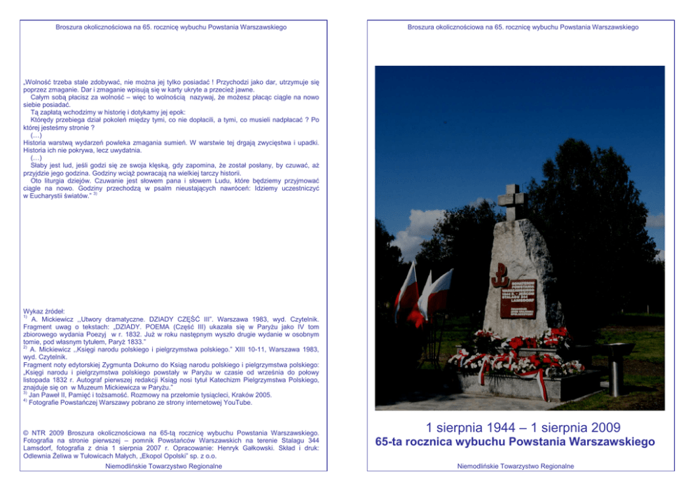 Broszura okolicznościowa na 65. rocznicę wybuchu Powstania Warszawskiego Broszura okolicznościowa na 65. rocznicę wybuchu Powstania Warszawskiego „Wolność trzeba stale zdobywać, nie moŜna jej tylko posiadać ! Przychodzi jako dar, utrzymuje się poprzez zmaganie. Dar i zmaganie wpisują się w karty ukryte a przecieŜ jawne. Całym sobą płacisz za wolność – więc to wolnością nazywaj, Ŝe moŜesz płacąc ciągle na nowo siebie posiadać. Tą zapłatą wchodzimy w historię i dotykamy jej epok: Którędy przebiega dział pokoleń między tymi, co nie dopłacili, a tymi, co musieli nadpłacać ? Po której jesteśmy stronie ? (…) Historia warstwą wydarzeń powleka zmagania sumień. W warstwie tej drgają zwycięstwa i upadki. Historia ich nie pokrywa, lecz uwydatnia. (…) Słaby jest lud, jeśli godzi się ze swoja klęską, gdy zapomina, Ŝe został posłany, by czuwać, aŜ przyjdzie jego godzina. Godziny wciąŜ powracają na wielkiej tarczy historii. Oto liturgia dziejów. Czuwanie jest słowem pana i słowem Ludu, które będziemy przyjmować ciągle na nowo. Godziny przechodzą w psalm nieustających nawróceń: Idziemy uczestniczyć w Eucharystii światów.” 3) Wykaz źródeł: 1) A. Mickiewicz ,,Utwory dramatyczne. DZIADY CZĘŚĆ III”. Warszawa 1983, wyd. Czytelnik. Fragment uwag o tekstach: „DZIADY. POEMA (Część III) ukazała się w ParyŜu jako IV tom zbiorowego wydania Poezyj w r. 1832. JuŜ w roku następnym wyszło drugie wydanie w osobnym tomie, pod własnym tytułem, ParyŜ 1833.” 2) A. Mickiewicz ,,Księgi narodu polskiego i pielgrzymstwa polskiego.” XIII 10-11, Warszawa 1983, wyd. Czytelnik. Fragment noty edytorskiej Zygmunta Dokurno do Ksiąg narodu polskiego i pielgrzymstwa polskiego: „Księgi narodu i pielgrzymstwa polskiego powstały w ParyŜu w czasie od września do połowy listopada 1832 r. Autograf pierwszej redakcji Ksiąg nosi tytuł Katechizm Pielgrzymstwa Polskiego, znajduje się on w Muzeum Mickiewicza w ParyŜu.” 3) Jan Paweł II, Pamięć i toŜsamość. Rozmowy na przełomie tysiącleci, Kraków 2005. 4) Fotografie Powstańczej Warszawy pobrano ze strony internetowej YouTube. © NTR 2009 Broszura okolicznościowa na 65-tą rocznicę wybuchu Powstania Warszawskiego. Fotografia na stronie pierwszej – pomnik Powstańców Warszawskich na terenie Stalagu 344 Lamsdorf, fotografia z dnia 1 sierpnia 2007 r. Opracowanie: Henryk Gałkowski. Skład i druk: Odlewnia śeliwa w Tułowicach Małych, „Ekopol Opolski” sp. z o.o. Niemodlińskie Towarzystwo Regionalne 1 sierpnia 1944 – 1 sierpnia 2009 65-ta rocznica wybuchu Powstania Warszawskiego Niemodlińskie Towarzystwo Regionalne Broszura okolicznościowa na 65. rocznicę wybuchu Powstania Warszawskiego SCENA V CELA KSIĘDZA PIOTRA „KS. PIOTR (modli się leŜąc krzyŜem) Panie! czymŜe ja jestem przed Twoim obliczem? Prochem i niczem; Ale gdym Tobie moję nicość wyspowiadał, Ja, proch, będę z Panem gadał. Broszura okolicznościowa na 65. rocznicę wybuchu Powstania Warszawskiego WIDZENIE Tyran wstał - Herod! - Panie, cała Polska młoda Wydana w ręce Heroda. Co widzę? - długie, białe, dróg krzyŜowych biegi, Drogi długie - nie dojrzeć - przez puszcze, przez śniegi Wszystkie na północ! - tam, tam w kraj daleki, Płyną jak rzeki. Płyną: ta droga prosto do Ŝelaznej bramy. Tamta jak strumień wpadła pod skałę, w te jamy, A tamtej ujście w morzu. - Patrz! po drogach leci Tłum wozów - jako chmury wiatrami pędzone, Wszystkie tam w jednę stronę. Ach, Panie! to nasze dzieci, Tam na północ - Panie, Panie! TakiŜ to los ich - wygnanie! I dasz ich wszystkich wygubić za młodu, I pokolenie nasze zatracisz do końca? Patrz! - ha! - to dziecię uszło - rośnie - to obrońca! Wskrzesiciel narodu, Z matki obcej; krew jego dawne bohatery, A imię jego będzie czterdzieści i cztery. Panie! czy przyjścia jego nie raczysz przyśpieszyć? Lud mój pocieszyć? Nie! lud wycierpi. - Widzę ten motłoch - tyrany, Zbójce - biegą - porwali - mój Naród związany Cała Europa wlecze, nad nim się urąga "Na trybunał!" - Tam zgraja niewinnego wciąga. Na trybunale gęby, bez serc, bez rąk; sędzie To jego sędzie! Krzyczą: "Gal,Gal sądzić będzie!" Gal w nim winy nie znalazł i - umywa ręce, A króle krzyczą: "Potęp i wydaj go męce; Krew jego spadnie na nas i na syny nasze; KrzyŜuj syna Maryi, wypuść Barabasze: UkrzyŜuj, - on cesarza koronę zniewaŜa, UkrzyŜuj, - bo powiemy, Ŝeś ty wróg cesarza". Gal wydał - juŜ porwali - juŜ niewinne skronie Zakrwawione, w szyderskiej, cierniowej koronie, Podnieśli przed świat cały - i ludy się zbiegły; Gal krzyczy:"Oto naród wolny, niepodległy!" Ach, Panie, juŜ widzę krzyŜ - ach, jak długo, długo Musi go nosić - Panie, zlituj się nad sługą. Daj mu siły, bo w drodze upadnie i skona KrzyŜ ma długie, na całą Europę ramiona, Z trzech wyschłych ludów, jak z trzech twardych drzew ukuty. Niemodlińskie Towarzystwo Regionalne „Nie mówcie, iŜ on nic nie sprawił; bo gdyby go nie raniono przede mną, tedy ja odniósłbym tę ranę, i moŜe byśmy miasta dziś nie wzięli. A ten, kto zasłania, równy temu, kto walczy; i tarcz ma równą cenę jak miecz. Znaku nie potrzebuję, bo wszyscy wiedzą, com zrobił. BÓG daje zwycięstwo, uŜywając prędkości jednego, męstwa drugiego, siły trzeciego; a skoro człowiek zręczny lub silny, zamiast nieść w górę towarzysza słabszego, strąca go, tedy robi zamieszanie i klęskę; a jeśli chwali się z zasługi swej, zasiewa niezgodę.” 2) Niemodlińskie Towarzystwo Regionalne Broszura okolicznościowa na 65. rocznicę wybuchu Powstania Warszawskiego Broszura okolicznościowa na 65. rocznicę wybuchu Powstania Warszawskiego JuŜ wleką; juŜ mój Naród na tronie pokuty Rzekł: "Pragnę" - Rakus octem, Borus Ŝółcią poi, A matka Wolność u nóg zapłakana stoi. Patrz - oto Ŝołdak Moskal z kopiją przyskoczył I krew niewinną mego na