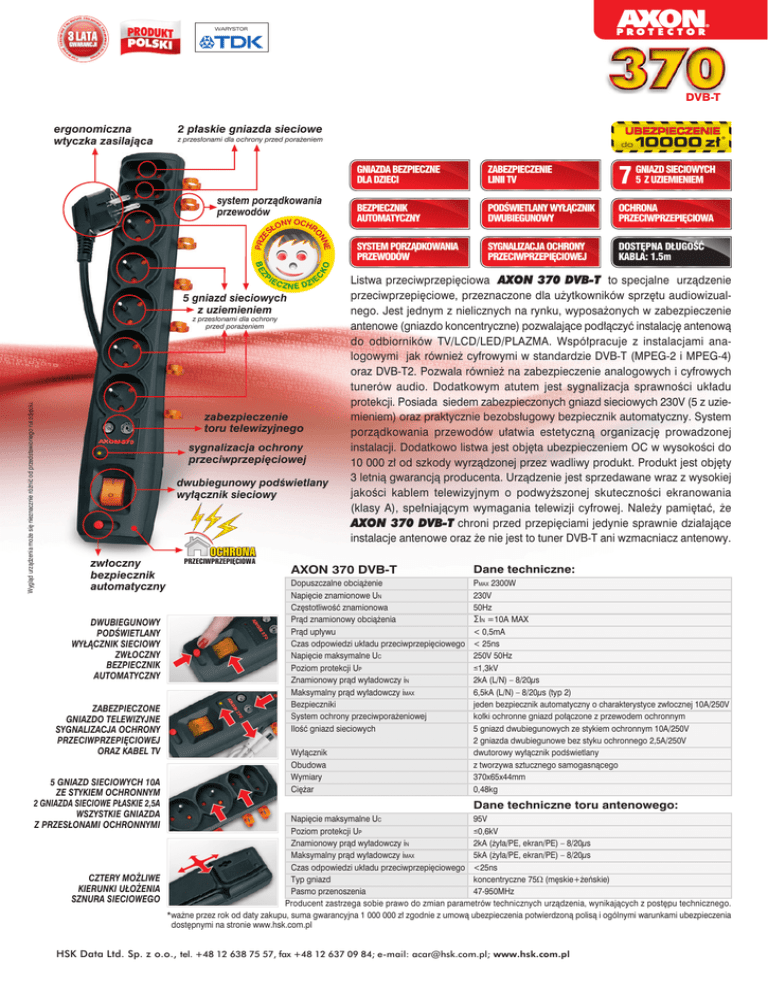 la ara ncji 3 la ta gw ar an 3l GWARANCJI g wa r ancj i 3 la 3 LATA ata g n ra ta w g war an 3 lata c ji cj i 3 gw i cj ta PRODUKT POLSKI WARYSTOR a ar ncj i 3 la ta gw a DVB-T ergonomiczna wtyczka zasilaj¹ca 2 p³askie gniazda sieciowe YO ON CHR S£ E NN O PRZ E system porz¹dkowania przewodów IE C Z KO BE P C ZN E DZ IE 5 gniazd sieciowych z uziemieniem Wygl¹d urz¹dzenia mo¿e siê nieznacznie ró¿niæ od przedstawionego na zdjêciu. z przes³onami dla ochrony przed pora¿eniem zabezpieczenie toru telewizyjnego sygnalizacja ochrony przeciwprzepiêciowej dwubiegunowy podwietlany wy³¹cznik sieciowy zw³oczny bezpiecznik automatyczny DWUBIEGUNOWY PODWIETLANY WY£¥CZNIK SIECIOWY ZW£OCZNY BEZPIECZNIK AUTOMATYCZNY UBEZPIECZENIE 10000 z³* z przes³onami dla ochrony przed pora¿eniem do GNIAZDA BEZPIECZNE DLA DZIECI ZABEZPIECZENIE LINII TV SIECIOWYCH 5 Z UZIEMIENIEM 7 GNIAZD BEZPIECZNIK AUTOMATYCZNY PODWIETLANY WY£¥CZNIK DWUBIEGUNOWY OCHRONA PRZECIWPRZEPIÊCIOWA SYSTEM PORZ¥DKOWANIA PRZEWODÓW SYGNALIZACJA OCHRONY PRZECIWPRZEPIÊCIOWEJ DOSTÊPNA D£UGOÆ KABLA: 1.5m Listwa przeciwprzepiêciowa AXON 370 DVB-T to specjalne urz¹dzenie przeciwprzepiêciowe, przeznaczone dla u¿ytkowników sprzêtu audiowizualnego. Jest jednym z nielicznych na rynku, wyposa¿onych w zabezpieczenie antenowe (gniazdo koncentryczne) pozwalaj¹ce pod³¹czyæ instalacjê antenow¹ do odbiorników TV/LCD/LED/PLAZMA. Wspó³pracuje z instalacjami analogowymi jak równie¿ cyfrowymi w standardzie DVB-T (MPEG-2 i MPEG-4) oraz DVB-T2. Pozwala równie¿ na zabezpieczenie analogowych i cyfrowych tunerów audio. Dodatkowym atutem jest sygnalizacja sprawnoci uk³adu protekcji. Posiada siedem zabezpieczonych gniazd sieciowych 230V (5 z uziemieniem) oraz praktycznie bezobs³ugowy bezpiecznik automatyczny. System porz¹dkowania przewodów u³atwia estetyczn¹ organizacjê prowadzonej instalacji. Dodatkowo listwa jest objêta ubezpieczeniem OC w wysokoci do 10 000 z³ od szkody wyrz¹dzonej przez wadliwy produkt. Produkt jest objêty 3 letni¹ gwarancj¹ producenta. Urz¹dzenie jest sprzedawane wraz z wysokiej jakoci kablem telewizyjnym o podwy¿szonej skutecznoci ekranowania (klasy A), spe³niaj¹cym wymagania telewizji cyfrowej. Nale¿y pamiêtaæ, ¿e AXON 370 DVB-T chroni przed przepiêciami jedynie sprawnie dzia³aj¹ce instalacje antenowe oraz ¿e nie jest to tuner DVB-T ani wzmacniacz antenowy. OCHRONA PRZECIWPRZEPIÊCIOWA AXON 370 DVB-T Dane techniczne: Dopuszczalne obci¹¿enie Napiêcie znamionowe UN PMAX 2300W 230V 50Hz SIN =10A MAX Czêstotliwoæ znamionowa Pr¹d znamionowy obci¹¿enia Pr¹d up³ywu Maksymalny pr¹d wy³adowczy iMAX ZABEZPIECZONE GNIAZDO TELEWIZYJNE SYGNALIZACJA OCHRONY PRZECIWPRZEPIÊCIOWEJ ORAZ KABEL TV 5 GNIAZD SIECIOWYCH 10A ZE STYKIEM OCHRONNYM 2 GNIAZDA SIECIOWE P£ASKIE 2,5A WSZYSTKIE GNIAZDA Z PRZES£ONAMI OCHRONNYMI Bezpieczniki System ochrony przeciwpora¿eniowej Iloæ gniazd sieciowych 6,5kA (L/N) 8/20µs (typ 2) jeden bezpiecznik automatyczny o charakterystyce zw³ocznej 10A/250V ko³ki ochronne gniazd po³¹czone z przewodem ochronnym 5 gniazd dwubiegunowych ze stykiem ochronnym 10A/250V 2 gniazda dwubiegunowe bez styku ochronnego 2,5A/250V Wy³¹cznik Obudowa Wymiary Ciê¿ar dwutorowy wy³¹cznik podwietlany z tworzywa sztucznego samogasn¹cego 370x65x44mm 0,48kg Napiêcie maksymalne UC 95V Poziom protekcji UP £0,6kV 2kA (¿y³a/PE, ekran/PE) 8/20µs 5kA (¿y³a/PE, ekran/PE) 8/20µs Dane techniczne toru antenowego: Znamionowy pr¹d wy³adowczy iN Maksymalny pr¹d wy³adowczy iMAX CZTERY MO¯LIWE KIERUNKI U£O¯ENIA SZNURA SIECIOWEGO < 0,5mA Czas odpowiedzi uk³adu przeciwprzepiêciowego < 25ns Napiêcie maksymalne UC 250V 50Hz Poziom protekcji UP £1,3kV 2kA (L/N) 8/20µs Znamionowy pr¹d wy³adowczy iN Czas odpowiedzi uk³adu przeciwprzepiêciowego <25ns koncentryczne 75W (mêskie+¿eñskie) Typ gniazd Pasmo przenoszenia 47-950MHz Producent zastrzega sobie prawo do zmian parametrów technicznych urz¹dzenia, wynikaj¹cych z postêpu technicznego. *wa¿ne przez rok od daty zakupu, suma gwarancyjna 1 000 000 z³ zgodnie z umow¹ ubezpieczenia potwierdzon¹ polis¹ i ogólnymi warunkami ubezpieczenia dostêpnymi na stronie www.hsk.com.pl HSK Data Ltd. Sp. z o.o., tel. +48 12 638 75 57, fax +48 12 637 09 84; e-mail: [email protected]; www.hsk.com.pl