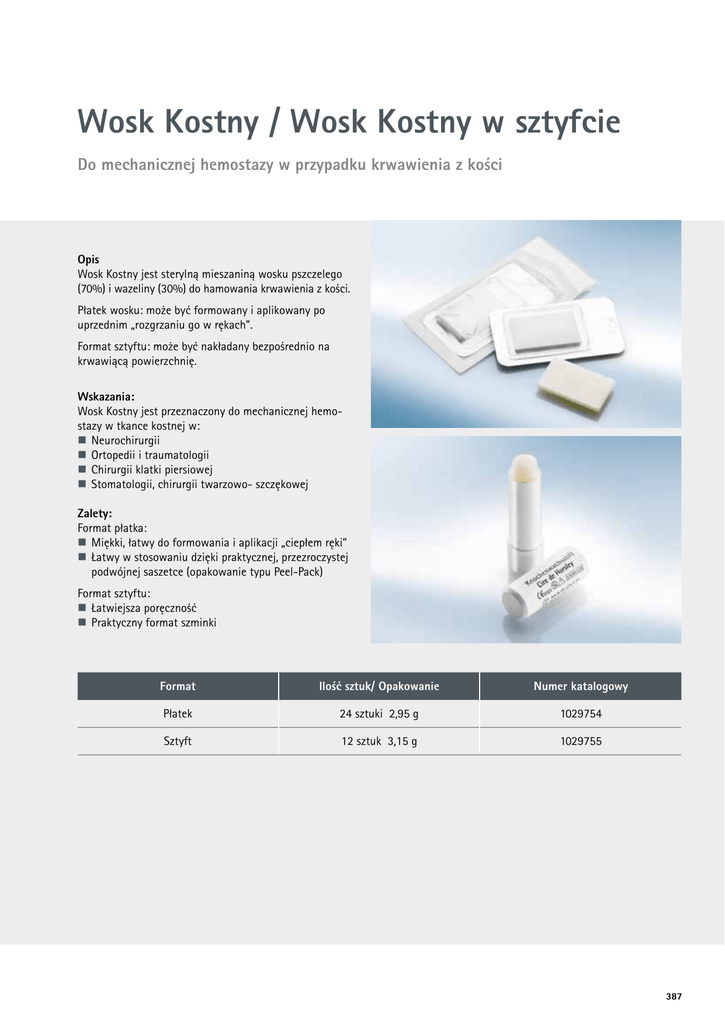 Wosk Kostny / Wosk Kostny w sztyfcie Do mechanicznej hemostazy w przypadku krwawienia z kości Opis Wosk Kostny jest sterylną mieszaniną wosku pszczelego (70%) i wazeliny (30%) do hamowania krwawienia z kości. Płatek wosku: może być formowany i aplikowany po uprzednim „rozgrzaniu go w rękach”. Format sztyftu: może być nakładany bezpośrednio na krwawiącą powierzchnię. Wskazania: Wosk Kostny jest przeznaczony do mechanicznej hemostazy w tkance kostnej w: Neurochirurgii Ortopedii i traumatologii Chirurgii klatki piersiowej Stomatologii, chirurgii twarzowo- szczękowej Zalety: Format płatka: Miękki, łatwy do formowania i aplikacji „ciepłem ręki” Łatwy w stosowaniu dzięki praktycznej, przezroczystej podwójnej saszetce (opakowanie typu Peel-Pack) Format sztyftu: Łatwiejsza poręczność Praktyczny format szminki Format Ilość sztuk/ Opakowanie Numer katalogowy Płatek 24 sztuki 2,95 g 1029754 Sztyft 12 sztuk 3,15 g 1029755 387