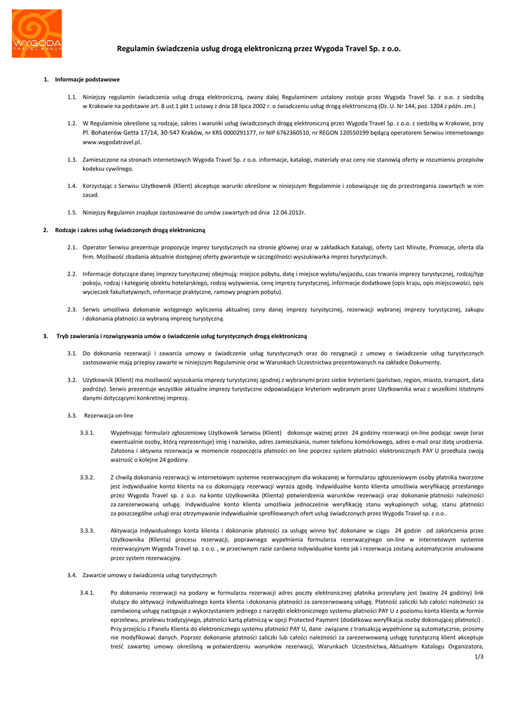 Regulamin świadczenia usług drogą elektroniczną przez Wygoda Travel Sp. z o.o. 1. Informacje podstawowe 1.1. Niniejszy regulamin świadczenia usług drogą elektroniczną, zwany dalej Regulaminem ustalony zostaje przez Wygoda Travel Sp. z o.o. z siedzibą w Krakowie na podstawie art. 8 ust.1 pkt 1 ustawy z dnia 18 lipca 2002 r. o świadczeniu usług drogą elektroniczną (Dz. U. Nr 144, poz. 1204 z późn. zm.) 1.2. W Regulaminie określone są rodzaje, zakres i warunki usług świadczonych drogą elektroniczną przez Wygoda Travel Sp. z o.o. z siedzibą w Krakowie, przy Pl. Bohaterów Getta 17/14, 30-547 Kraków, nr KRS 0000291177, nr NIP 6762360510, nr REGON 120550199 będącą operatorem Serwisu internetowego www.wygodatravel.pl. 1.3. Zamieszczone na stronach internetowych Wygoda Travel Sp. z o.o. informacje, katalogi, materiały oraz ceny nie stanowią oferty w rozumieniu przepisów kodeksu cywilnego. 1.4. Korzystając z Serwisu Użytkownik (Klient) akceptuje warunki określone w niniejszym Regulaminie i zobowiązuje się do przestrzegania zawartych w nim zasad. 1.5. Niniejszy Regulamin znajduje zastosowanie do umów zawartych od dnia 12.04.2012r. 2. Rodzaje i zakres usług świadczonych drogą elektroniczną 2.1. Operator Serwisu prezentuje propozycje imprez turystycznych na stronie głównej oraz w zakładkach Katalogi, oferty Last Minute, Promocje, oferta dla firm. Możliwość zbadania aktualnie dostępnej oferty gwarantuje w szczególności wyszukiwarka imprez turystycznych. 2.2. Informacje dotyczące danej imprezy turystycznej obejmują: miejsce pobytu, datę i miejsce wylotu/wyjazdu, czas trwania imprezy turystycznej, rodzaj/typ pokoju, rodzaj i kategorię obiektu hotelarskiego, rodzaj wyżywienia, cenę imprezy turystycznej, informacje dodatkowe (opis kraju, opis miejscowości, opis wycieczek fakultatywnych, informacje praktyczne, ramowy program pobytu). 2.3. Serwis umożliwia dokonanie wstępnego wyliczenia aktualnej ceny danej imprezy turystycznej, rezerwacji wybranej imprezy turystycznej, zakupu i dokonania płatności za wybraną imprezę turystyczną. 3. Tryb zawierania i rozwiązywania umów o świadczenie usług turystycznych drogą elektroniczną 3.1. Do dokonania rezerwacji i zawarcia umowy o świadczenie usług turystycznych oraz do rezygnacji z umowy o świadczenie usług turystycznych zastosowanie mają przepisy zawarte w niniejszym Regulaminie oraz w Warunkach Uczestnictwa prezentowanych na zakładce Dokumenty. 3.2. Użytkownik (Klient) ma możliwość wyszukania imprezy turystycznej zgodnej z wybranymi przez siebie kryteriami (państwo, region, miasto, transport, data podróży). Serwis prezentuje wszystkie aktualne imprezy turystyczne odpowiadające kryteriom wybranym przez Użytkownika wraz z wszelkimi istotnymi danymi dotyczącymi konkretnej imprezy. 3.3. Rezerwacja on-line 3.3.1. Wypełniając formularz zgłoszeniowy Użytkownik Serwisu (Klient) dokonuje ważnej przez 24 godziny rezerwacji on-line podając swoje (oraz ewentualnie osoby, którą reprezentuje) imię i nazwisko, adres zamieszkania, numer telefonu komórkowego, adres e-mail oraz datę urodzenia. Założona i aktywna rezerwacja w momencie rozpoczęcia płatności on line poprzez system płatności elektronicznych PAY U przedłuża swoją ważność o kolejne 24 godziny. 3.3.2. Z chwilą dokonania rezerwacji w internetowym systemie rezerwacyjnym dla wskazanej w formularzu zgłoszeniowym osoby płatnika tworzone jest indywidualne konto klienta na co dokonujący rezerwacji wyraża zgodę. Indywidualne konto klienta umożliwia weryfikację przesłanego przez Wygoda Travel sp. z o.o. na konto Użytkownika (Klienta) potwierdzenia warunków rezerwacji oraz dokonanie płatności należności za zarezerwowaną usługę. Indywidualne konto klienta umożliwia jednocześnie weryfikację stanu wykupionych usług, stanu płatności za poszczególne usługi oraz otrzymywanie indywidualnie sprofilowanych ofert usług świadczonych przez Wygoda Travel sp. z o.o.. 3.3.3. Aktywacja indywidualnego konta klienta i dokonanie płatności za usługę winno być dokonane w ciągu 24 godzin od zakończenia przez Użytkownika (Klienta) procesu rezerwacji, poprawnego wypełnienia formularza rezerwacyjnego on-line w internetowym systemie rezerwacyjnym Wygoda Travel sp. z o.o. , w przeciwnym razie zarówno indywidualne konto jak i rezerwacja zostaną automatycznie anulowane przez system rezerwacyjny. 3.4. Zawarcie umowy o świadczenia usług turystycznych 3.4.1. Po dokonaniu rezerwacji na podany w formularzu rezerwacji adres poczty elektronicznej płatnika przesyłany jest (ważny 24 godziny) link służący do aktywacji indywidualnego konta klienta i dokonania płatności za zarezerwowaną usługę. Płatność zaliczki lub całości należności za zamówioną usługę następuje z wykorzystaniem jednego z narzędzi elektronicznego systemu płatności PAY U z poziomu konta klienta w formie eprzelewu, przelewu tradycyjnego, płatności kartą płatniczą w opcji Protected Payment (dodatkowa weryfikacja osoby dokonującej płatności) . Przy przejściu z Panelu Klienta do elektronicznego systemu płatności PAY U, dane związane z transakcją wypełnione są automatycznie, prosimy nie modyfikować danych. Poprzez dokonanie płatności zaliczki lub całości należności za zarezerwowaną usługę turystyczną klient akceptuje treść zawartej umowy określoną w potwierdzeniu warunków rezerwacji, Warunkach Uczestnictwa, Aktualnym Katalogu Organizatora, 1/3 zawierającym informacje o warunkach ubezpieczenia, ważnych informacjach dodatkowych, ramowym programie Imprezy oraz cenie i Regulaminie Świadczenia Usług Drogą Elektroniczną. Umowę uznaje się za zawartą z chwilą dokonania płatności zaliczki lub całości należności za zarezerwowaną usługę turystyczną. 3.4.2. Po dokonaniu płatności zaliczki lub całości należności za zakupioną usługę turystyczną Klient przesyła do Wygoda Travel sp. z o.o. dwa