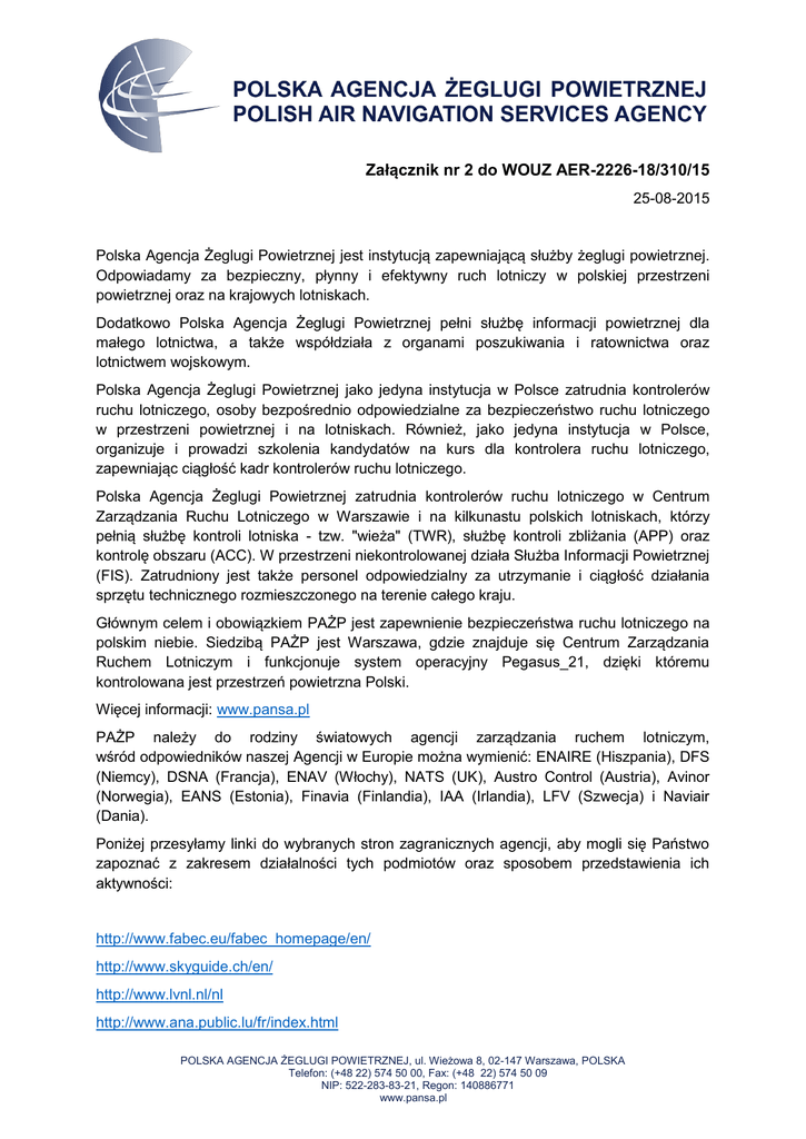 Załącznik nr 2 do WOUZ AER-2226-18/310/15 25-08-2015 Polska Agencja Żeglugi Powietrznej jest instytucją zapewniającą służby żeglugi powietrznej. Odpowiadamy za bezpieczny, płynny i efektywny ruch lotniczy w polskiej przestrzeni powietrznej oraz na krajowych lotniskach. Dodatkowo Polska Agencja Żeglugi Powietrznej pełni służbę informacji powietrznej dla małego lotnictwa, a także współdziała z organami poszukiwania i ratownictwa oraz lotnictwem wojskowym. Polska Agencja Żeglugi Powietrznej jako jedyna instytucja w Polsce zatrudnia kontrolerów ruchu lotniczego, osoby bezpośrednio odpowiedzialne za bezpieczeństwo ruchu lotniczego w przestrzeni powietrznej i na lotniskach. Również, jako jedyna instytucja w Polsce, organizuje i prowadzi szkolenia kandydatów na kurs dla kontrolera ruchu lotniczego, zapewniając ciągłość kadr kontrolerów ruchu lotniczego. Polska Agencja Żeglugi Powietrznej zatrudnia kontrolerów ruchu lotniczego w Centrum Zarządzania Ruchu Lotniczego w Warszawie i na kilkunastu polskich lotniskach, którzy pełnią służbę kontroli lotniska - tzw. "wieża" (TWR), służbę kontroli zbliżania (APP) oraz kontrolę obszaru (ACC). W przestrzeni niekontrolowanej działa Służba Informacji Powietrznej (FIS). Zatrudniony jest także personel odpowiedzialny za utrzymanie i ciągłość działania sprzętu technicznego rozmieszczonego na terenie całego kraju. Głównym celem i obowiązkiem PAŻP jest zapewnienie bezpieczeństwa ruchu lotniczego na polskim niebie. Siedzibą PAŻP jest Warszawa, gdzie znajduje się Centrum Zarządzania Ruchem Lotniczym i funkcjonuje system operacyjny Pegasus_21, dzięki któremu kontrolowana jest przestrzeń powietrzna Polski. Więcej informacji: www.pansa.pl PAŻP należy do rodziny światowych agencji zarządzania ruchem lotniczym, wśród odpowiedników naszej Agencji w Europie można wymienić: ENAIRE (Hiszpania), DFS (Niemcy), DSNA (Francja), ENAV (Włochy), NATS (UK), Austro Control (Austria), Avinor (Norwegia), EANS (Estonia), Finavia (Finlandia), IAA (Irlandia), LFV (Szwecja) i Naviair (Dania). Poniżej przesyłamy linki do wybranych stron zagranicznych agencji, aby mogli się Państwo zapoznać z zakresem działalności tych podmiotów oraz sposobem przedstawienia ich aktywności: http://www.fabec.eu/fabec_homepage/en/ http://www.skyguide.ch/en/ http://www.lvnl.nl/nl http://www.ana.public.lu/fr/index.html POLSKA AGENCJA ŻEGLUGI POWIETRZNEJ, ul. Wieżowa 8, 02-147 Warszawa, POLSKA Telefon: (+48 22) 574 50 00, Fax: (+48 22) 574 50 09 NIP: 522-283-83-21, Regon: 140886771 www.pansa.pl https://www.austrocontrol.at/ http://www.nats.aero/ http://www.enaire.es/csee/Satellite/Home/en/ http://www.lfv.se/en/ https://avinor.no/en/avinor-air-navigations-services/ http://www.navcanada.ca/en/Pages/default.aspx https://www.iaa.ie/ http://www.bulatsa.com/en Co chcemy zamówić? W celu prowadzenia spójnej i sprawnej komunikacji potrzebujemy nowoczesnych narzędzi. Jednym z nich jest film promujący PAŻP. Zwracamy się z prośbą o przesłanie do nas oferty na realizację (5 minutowego) filmu promocyjnego w dwóch wersjach językowych: polskiej i angielskiej, przedstawiającego Polską Agencję Żeglugi Powietrznej jako jedyną w Polsce (należącą do grona europejskich i światowych instytucji tego rodzaju) firmę, która zarządza ruchem lotniczym w polskiej przestrzeni powietrznej. Film ma przedstawić szerokie spektrum działalności Agencji. Komunikat zawarty w przekazie filmu promocyjnego powinien zawierać atrybuty marki PAŻP i jej cechy określone precyzyjnie w informacjach szczegółowych przekazanych przez PAŻP wyłonionemu Wykonawcy. Film powinien zostać zrealizowany przy pomocy nowoczesnych, profesjonalnych środków technicznych stosowanych współcześnie przy produkcjach reklamowych. Użyte w filmie środki techniczne mają zagwarantować uzyskanie finalnego produktu na najwyższym poziomie artystycznym i technicznym, umożliwiającym emisję w stacjach telewizyjnych. Film powinien opierać się w całości na unikalnych, zrealizowanych na potrzeby tej produkcji materiałach filmowych (wizyjnych i dźwiękowych). Powinien zawierać elementy animacji graficznych o wysokim standardzie technicznym i artystycznym. Zakładamy, że głównym miejscem realizacji zdjęć do filmu będzie Centrum Zarzadzania Ruchem Lotniczym w Warszawie. W filmie pokazane będą również inne lokalizacje wybrane przez producenta, i zaakceptowane przez Zamawiającego (maksymalnie pięć), związane z Agencją i świadczonymi przez nią usługami. Siedzibą PAŻP jest Warszawa. Tu pracuje najwięcej kontrolerów ruchu lotniczego. W nowoczesnej sali operacyjnej zainstalowany jest system operacyjny Pegasus_21 przeznaczony do prowadzenia kontroli przestrzeni powietrznej Polski. Zobrazowanie przestrzeni powietrznej uzyskiwane jest dzięki pracy urządzeń radarowych umiejscowionych na terenie całego kraju. Takich urządzeń (np. radarów, radarów wtórnych, a także urządzeń umożliwiających prowadzenie korespondencji z samolotami oraz urządzeń umożliwiających nawigację lotniczą) jest na terenie Polski kilkaset. Nie wymagamy, aby materiał zdjęciowy zrealizowany był we wszystkich lokalizacjach takich urządzeń. Obowiązkiem Wykonawcy będzie natomiast przekazanie informacji o istnieniu tych urządzeń, działaniu stworzonego w oparciu o nie systemu i wskazaniu najważniejszych z nich przy pomocy nowoczesnych grafik i animacji będących uzupełnieniem materiału zdjęciowego i tekstowego filmu. 2 Kontrolerzy ruchu lotniczego zatrudnieni przez PAŻP pracują także na wieżach kontroli lotnisk w kilkunastu lotniskach komunikacyjnych w większych miastach Polski m.in.: w Warszawie, Poznaniu, Wrocławiu, Modlinie, Łodzi, Rzeszowie, Lublinie, Krakowie, Szczecinie, Gdańsku, Zielonej Górze, Bydgoszczy. Nie wymagamy, aby materiał zdjęciowy zrealizowany był we wszystkich tych lokalizacjach, obowiązkiem Wykonawcy będzie nat