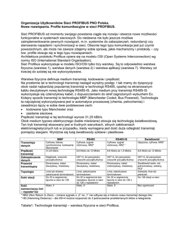 Tabela1: Technologie transmisji – warstwa fizyczna w sieci Profibus.