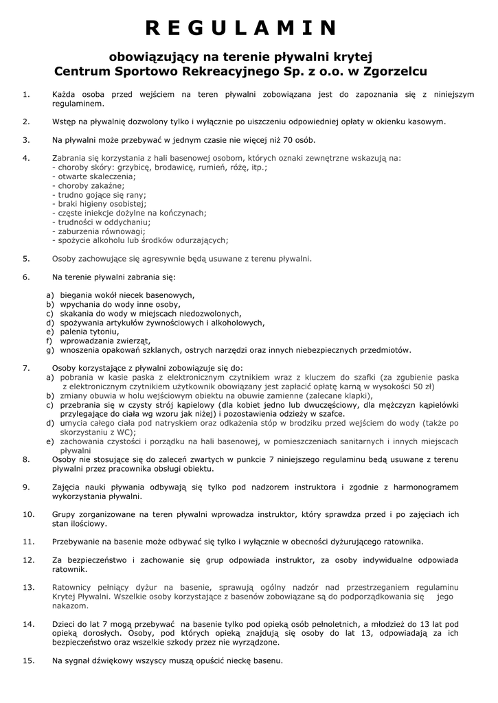 REGULAMIN obowiązujący na terenie pływalni krytej Centrum Sportowo Rekreacyjnego Sp. z o.o. w Zgorzelcu 1. Każda osoba przed wejściem na teren pływalni zobowiązana jest do zapoznania się z niniejszym regulaminem. 2. Wstęp na pływalnię dozwolony tylko i wyłącznie po uiszczeniu odpowiedniej opłaty w okienku kasowym. 3. Na pływalni może przebywać w jednym czasie nie więcej niż 70 osób. 4. Zabrania się korzystania z hali basenowej osobom, których oznaki zewnętrzne wskazują na: - choroby skóry: grzybicę, brodawicę, rumień, różę, itp.; - otwarte skaleczenia; - choroby zakaźne; - trudno gojące się rany; - braki higieny osobistej; - częste iniekcje dożylne na kończynach; - trudności w oddychaniu; - zaburzenia równowagi; - spożycie alkoholu lub środków odurzających; 5. Osoby zachowujące się agresywnie będą usuwane z terenu pływalni. 6. Na terenie pływalni zabrania się: a) b) c) d) e) f) g) 7. 8. biegania wokół niecek basenowych, wpychania do wody inne osoby, skakania do wody w miejscach niedozwolonych, spożywania artykułów żywnościowych i alkoholowych, palenia tytoniu, wprowadzania zwierząt, wnoszenia opakowań szklanych, ostrych narzędzi oraz innych niebezpiecznych przedmiotów. Osoby korzystające z pływalni zobowiązuje się do: a) pobrania w kasie paska z elektronicznym czytnikiem wraz z kluczem do szafki (za zgubienie paska z elektronicznym czytnikiem użytkownik obowiązany jest zapłacić opłatę karną w wysokości 50 zł) b) zmiany obuwia w holu wejściowym obiektu na obuwie zamienne (zalecane klapki), c) przebrania się w czysty strój kąpielowy (dla kobiet jedno lub dwuczęściowy, dla mężczyzn kąpielówki przylegające do ciała wg wzoru jak niżej) i pozostawienia odzieży w szafce. d) umycia całego ciała pod natryskiem oraz odkażenia stóp w brodziku przed wejściem do wody (także po skorzystaniu z WC); e) zachowania czystości i porządku na hali basenowej, w pomieszczeniach sanitarnych i innych miejscach pływalni Osoby nie stosujące się do zaleceń zwartych w punkcie 7 niniejszego regulaminu bedą usuwane z terenu pływalni przez pracownika obsługi obiektu. 9. Zajęcia nauki pływania odbywają się tylko pod nadzorem instruktora i zgodnie z harmonogramem wykorzystania pływalni. 10. Grupy zorganizowane na teren pływalni wprowadza instruktor, który sprawdza przed i po zajęciach ich stan ilościowy. 11. Przebywanie na basenie może odbywać się tylko i wyłącznie w obecności dyżurującego ratownika. 12. Za bezpieczeństwo i zachowanie się grup odpowiada instruktor, za osoby indywidualne odpowiada ratownik. 13. Ratownicy pełniący dyżur na basenie, sprawują ogólny nadzór nad przestrzeganiem regulaminu Krytej Pływalni. Wszelkie osoby korzystające z basenów zobowiązane są do podporządkowania się jego nakazom. 14. Dzieci do lat 7 mogą przebywać na basenie tylko pod opieką osób pełnoletnich, a młodzież do 13 lat pod opieką dorosłych. Osoby, pod których opieką znajdują się osoby do lat 13, odpowiadają za ich bezpieczeństwo oraz wszelkie szkody przez nie wyrządzone. 15. Na sygnał dźwiękowy wszyscy muszą opuścić nieckę basenu. 16. Kierownictwo pływalni ma uprawnienia kontroli prowadzonych zajęć, w razie stwierdzenia uchybień zakazać dalszego ich prowadzenia. 17. Zabrania się prowadzenia jakichkolwiek form nauki pływania bez zezwolenia kierownictwa pływalni. 18. Za przedmioty wartościowe pozostawione w szatni kierownictwo pływalni nie odpowiada. 19. Wszystkie osoby znajdujące się na pływalni zobowiązane są do bezwzględnego przestrzegania poleceń ratownika. 20. Nie zapoznanie się z treścią niniejszego regulaminu nie zwalnia od odpowiedzialności w przypadku naruszenia przez osoby przebywające na terenie pływalni. 21. Dyrekcja nie odpowiada za wypadki spowodowane nieprzestrzeganiem niniejszego Regulaminu. 22. Skargi i wnioski można zgłaszać w godzinach od 8.00 do 16.00 w siedzibie krytej pływalni. Prezes Zarządu Centrum Sportowo Rekreacyjnego Sp. z o.o. jego