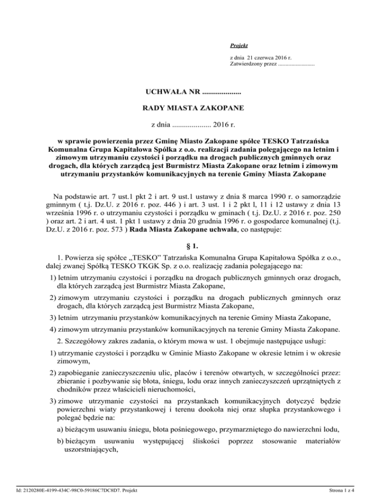 Projekt z dnia 21 czerwca 2016 r. Zatwierdzony przez ......................... UCHWAŁA NR .................... RADY MIASTA ZAKOPANE z dnia .................... 2016 r. w sprawie powierzenia przez Gminę Miasto Zakopane spółce TESKO Tatrzańska Komunalna Grupa Kapitałowa Spółka z o.o. realizacji zadania polegającego na letnim i zimowym utrzymaniu czystości i porządku na drogach publicznych gminnych oraz drogach, dla których zarządcą jest Burmistrz Miasta Zakopane oraz letnim i zimowym utrzymaniu przystanków komunikacyjnych na terenie Gminy Miasta Zakopane Na podstawie art. 7 ust.1 pkt 2 i art. 9 ust.1 ustawy z dnia 8 marca 1990 r. o samorządzie gminnym ( t.j. Dz.U. z 2016 r. poz. 446 ) i art. 3 ust. 1 i 2 pkt l, 11 i 12 ustawy z dnia 13 września 1996 r. o utrzymaniu czystości i porządku w gminach ( t.j. Dz.U. z 2016 r. poz. 250 ) oraz art. 2 i art. 4 ust. 1 pkt 1 ustawy z dnia 20 grudnia 1996 r. o gospodarce komunalnej (t.j. Dz.U. z 2016 r. poz. 573 ) Rada Miasta Zakopane uchwala, co następuje: § 1. 1. Powierza się spółce „TESKO” Tatrzańska Komunalna Grupa Kapitałowa Spółka z o.o., dalej zwanej Spółką TESKO TKGK Sp. z o.o. realizację zadania polegającego na: 1) letnim utrzymaniu czystości i porządku na drogach publicznych gminnych oraz drogach, dla których zarządcą jest Burmistrz Miasta Zakopane, 2) zimowym utrzymaniu czystości i porządku na drogach publicznych gminnych oraz drogach, dla których zarządcą jest Burmistrz Miasta Zakopane, 3) letnim utrzymaniu przystanków komunikacyjnych na terenie Gminy Miasta Zakopane, 4) zimowym utrzymaniu przystanków komunikacyjnych na terenie Gminy Miasta Zakopane. 2. Szczegółowy zakres zadania, o którym mowa w ust. 1 obejmuje następujące usługi: 1) utrzymanie czystości i porządku w Gminie Miasto Zakopane w okresie letnim i w okresie zimowym, 2) zapobieganie zanieczyszczeniu ulic, placów i terenów otwartych, w szczególności przez: zbieranie i pozbywanie się błota, śniegu, lodu oraz innych zanieczyszczeń uprzątniętych z chodników przez właścicieli nieruchomości, 3) zimowe utrzymanie czystości na przystankach komunikacyjnych dotyczyć będzie powierzchni wiaty przystankowej i terenu dookoła niej oraz słupka przystankowego i polegać będzie na: a) bieżącym usuwaniu śniegu, błota pośniegowego, przymarzniętego do nawierzchni lodu, b) bieżącym usuwaniu uszorstniających, Id: 2120280E-4199-434C-98C0-59186C7DC8D7. Projekt występującej śliskości poprzez stosowanie materiałów Strona 1 z 4 c) sprzątaniu i usuwaniu pozostałości wybitych szyb oraz uszkodzonych elementów drewnianych z wiat przystankowych, zabezpieczeniu zdewastowanego przystanku komunikacyjnego, tj. wygrodzenie terenu, uzupełnienie brakujących elementów drewnianych, d) sprzątaniu i zamiataniu z terenu wiaty przystankowej i słupka przystankowego oraz z chodnika i pobocza do 2 mb od wiaty przystankowej i do 1 m² od słupka przystankowego zanieczyszczeń, tj. liści, papierów, szkła, elementów z tworzyw sztucznych, niedopałków papierosów itp., e) czyszczeniu i likwidacji napisów, plakatów i ogłoszeń ze słupków przystankowych, tablic znaku przystankowego (D-15), wiat przystankowych oraz ramek i gablot przystankowych z rozkładami jazdy, za wyjątkiem ogłoszeń Burmistrza Miasta Zakopane, w razie konieczności malowanie wiat przystankowych w celu zachowania właściwej estetyki, f) uzupełnieniu brakujących elementów drewnianych w wiatach przystankowych. 4) letnie utrzymanie czystości na przystankach komunikacyjnych polegające na: a) sprzątaniu i zamiataniu z terenu wiaty przystankowej i słupka przystankowego oraz z chodnika i pobocza do 2 mb od wiaty przystankowej i do 1 m² od słupka przystankowego zanieczyszczeń, tj. liści, papierów, szkła, elementów z tworzyw sztucznych, niedopałków papierosów itp., b) usuwaniu trawy i chwastów z terenu wiaty przystankowej i wokół niej, c) usuwanie trawy i chwastów z terenu wokół słupka przystankowego, d) sprzątaniu i usuwaniu pozostałości wybitych szyb oraz uszkodzonych elementów drewnianych z wiat przystankowych, zabezpieczeniu zdewastowanego przystanku komunikacyjnego, tj. wygrodzenie terenu, uzupełnienie brakujących elementów drewnianych, e) czyszczeniu i likwidacji napisów, plakatów i ogłoszeń ze słupków przystankowych, tablic znaku przystankowego (D-15), wiat przystankowych oraz ramek i gablot przystankowych z rozkładami jazdy, za wyjątkiem ogłoszeń Burmistrza Miasta Zakopane, w razie konieczności malowanie wiat przystankowych w celu zachowania właściwej estetyki, f) uzupełnieniu brakujących elementów drewnianych w wiatach przystankowych. 3. Zadania, o których mowa w ust. 1 i 2 mają charakter usługi publicznej i są usługami w ogólnym interesie gospodarczym w rozumieniu art. 106 ust. 2 Traktatu o funkcjonowaniu Unii Europejskiej. 4. Powierzenie Spółce „TESKO” TKGK Sp. z o.o. zadania, o którym mowa w ust. 1 następuje na okres od 01.08.2016 r. do 31.07.2017 r. § 2. Szczegółowy zakres obowiązków spółki „TESKO” związanych z realizacją zadania, o którym mowa w par. 1 niniejszej uchwały w tym obowiązków związanych z koniecznością spełniania przez Spółkę „TESKO” odpowiednich standardów technicznych i jakościowych, określa Regulamin Świadczenia Usług Publicznych, zatwierdzony przez Burmistrza Miasta Zakopane. Strona 2 z 4 Id: 2120280E-4199-434C-98C0-59186C7DC8D7. Projekt § 3. 1. W związku z realizacją zadania gminy, o którym mowa w par. 1 niniejszej uchwały, Spółka „TESKO” otrzyma od Gminy Miasta Zakopane rekompensatę kosztów. 2. Rekompensata, o której mowa w ust. 1 zostanie przekazana Spółce „TESKO” na zasadach określonych w tzw. pakiecie post-Altmark przyjętym przez Komisję Europejską w dniu 20 grudnia 2011 r. w szczególności zaś zgodnie z komunikatem Komisji w sprawie stosowania reguł Unii Europejskiej w dziedzinie pomocy państwa w odniesieni